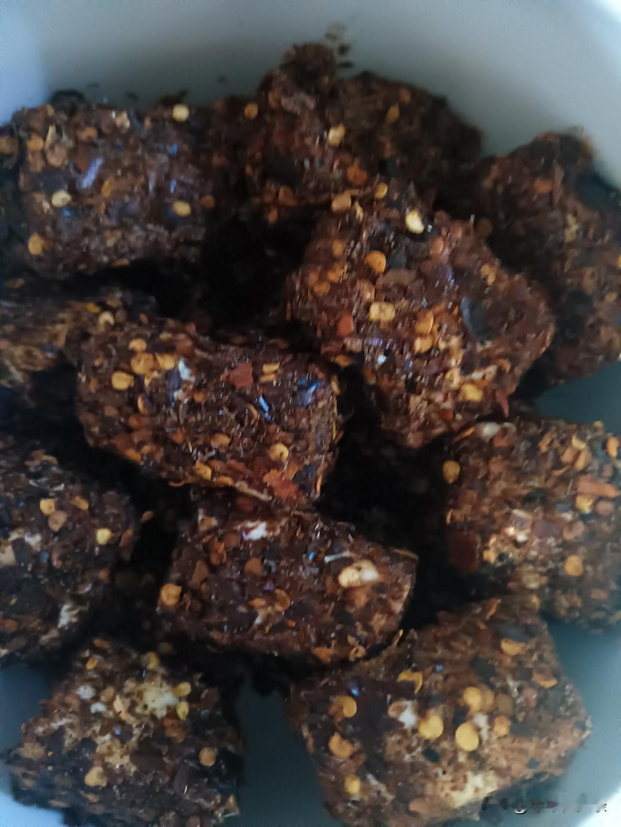 又开始做腐乳了,这个豆腐我发酵了10天,有红色的包衣了,而且豆腐也发空了,把佐料备好,把发酵好的每一小块蘸上佐料,再放上几天就可以直接吃了。