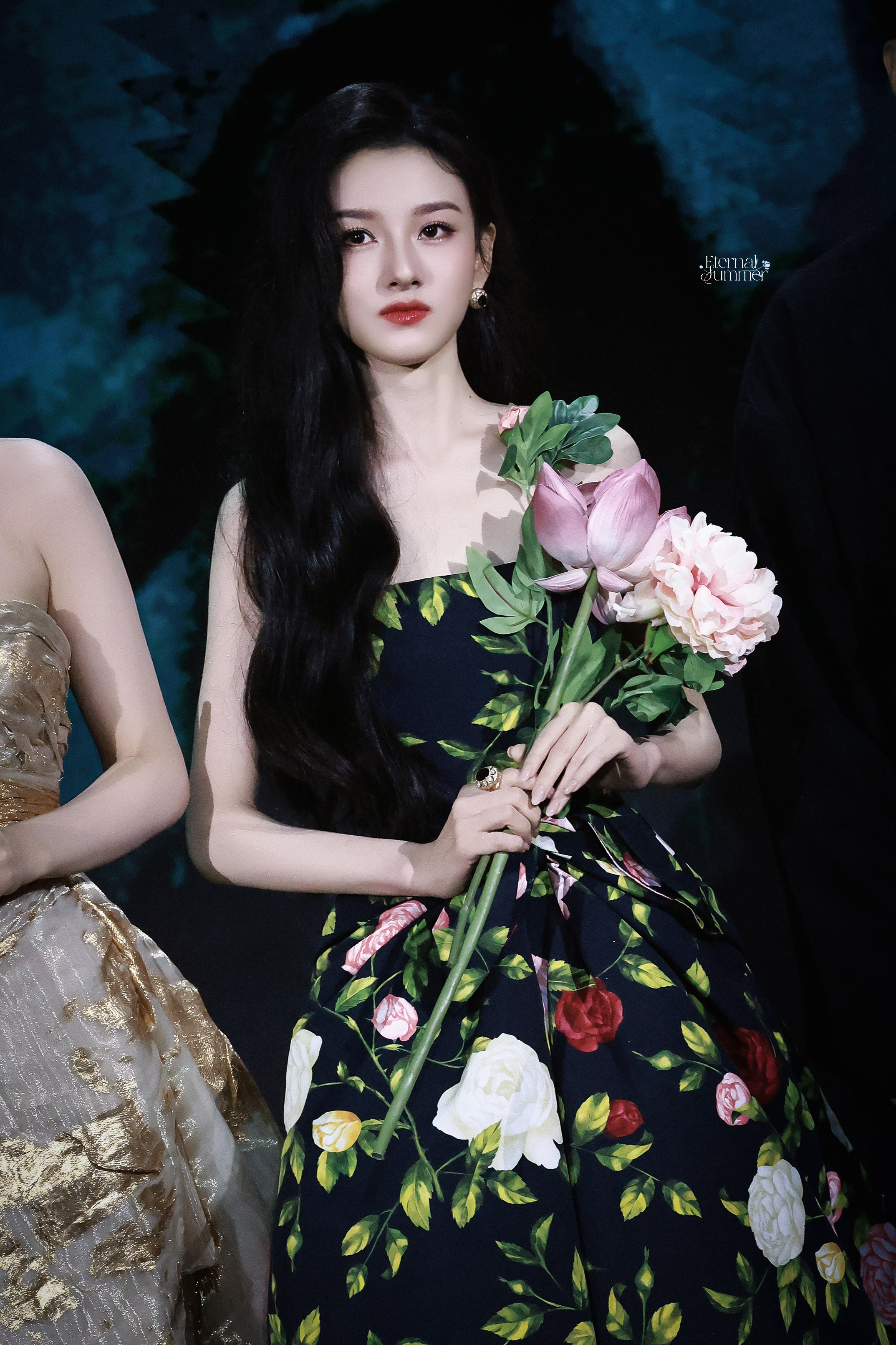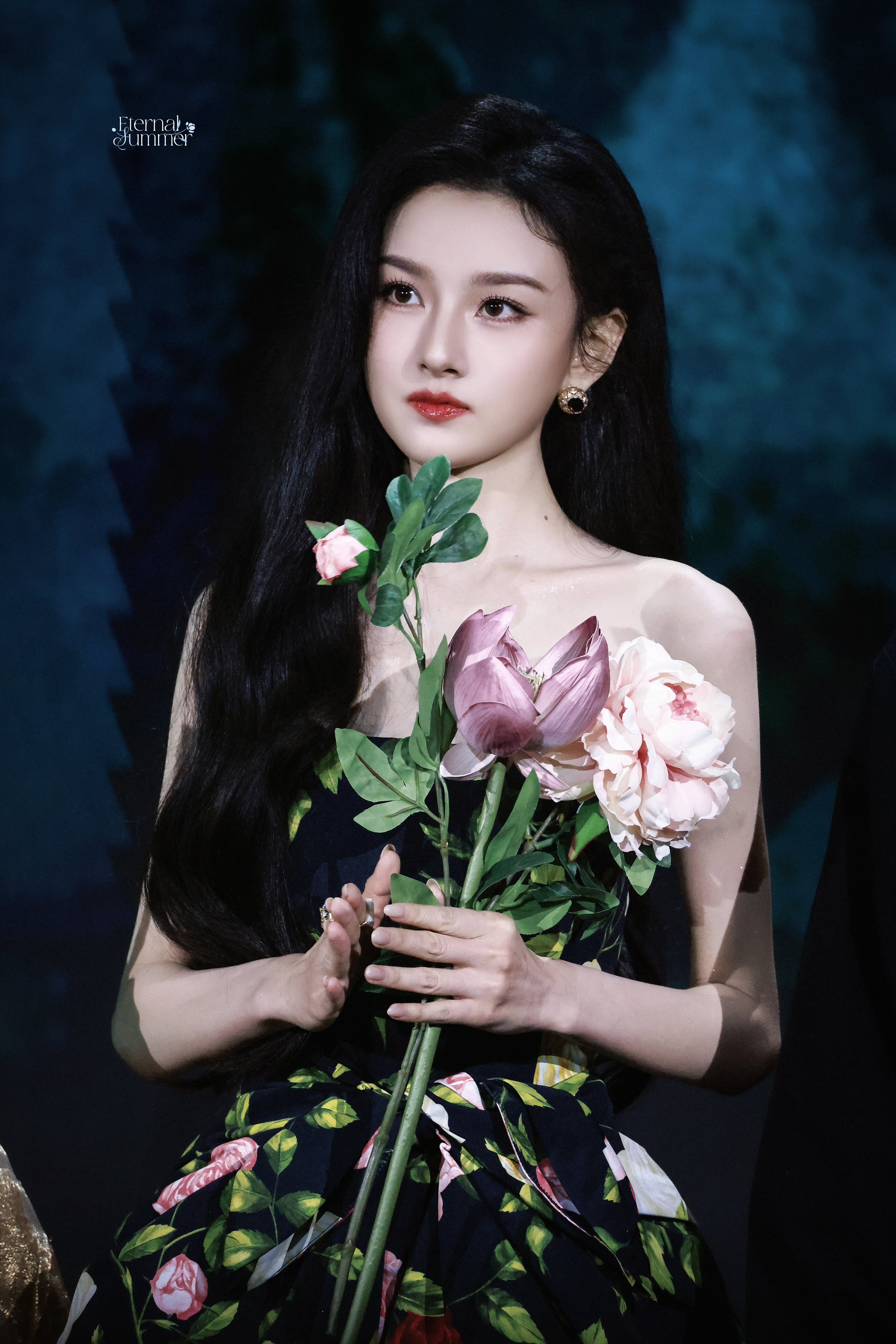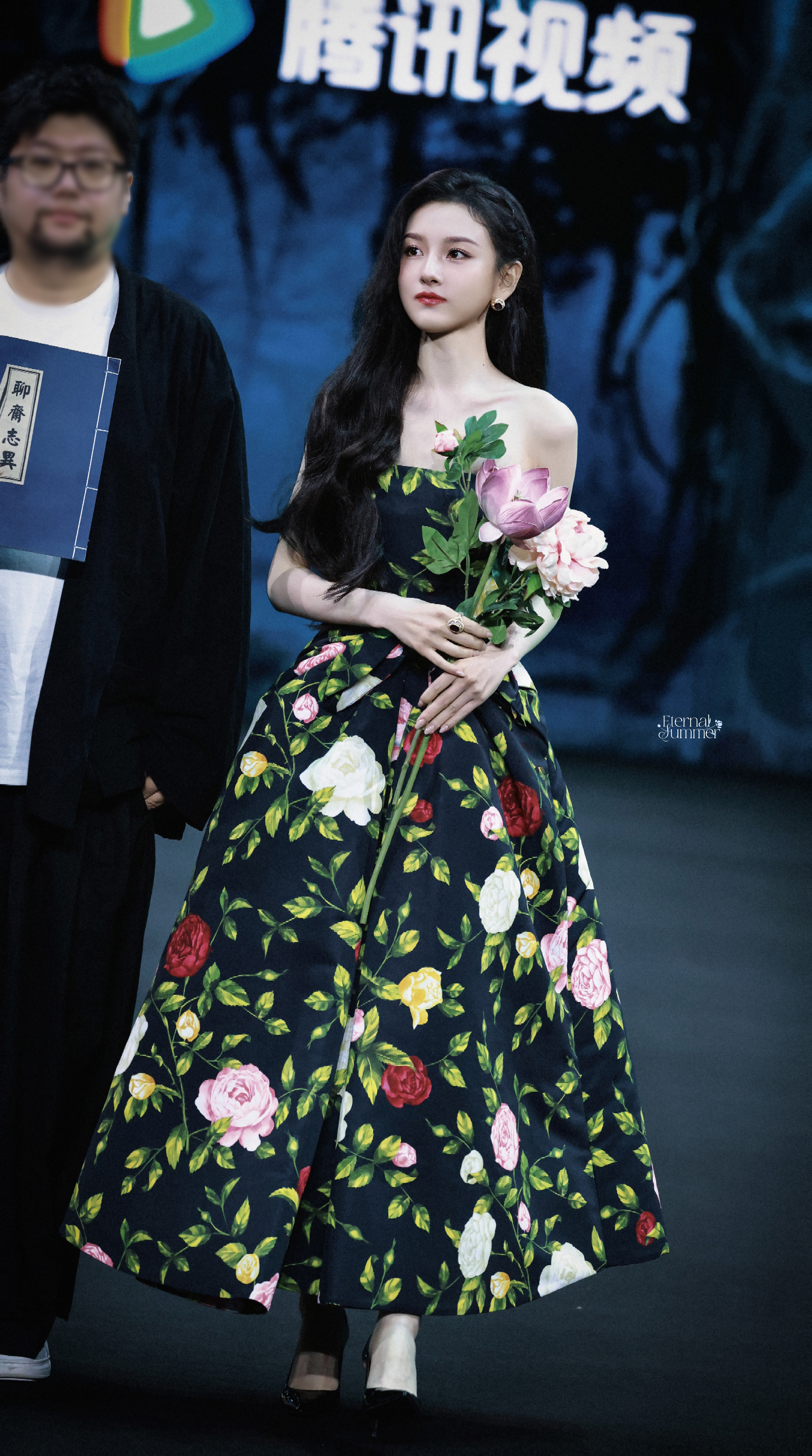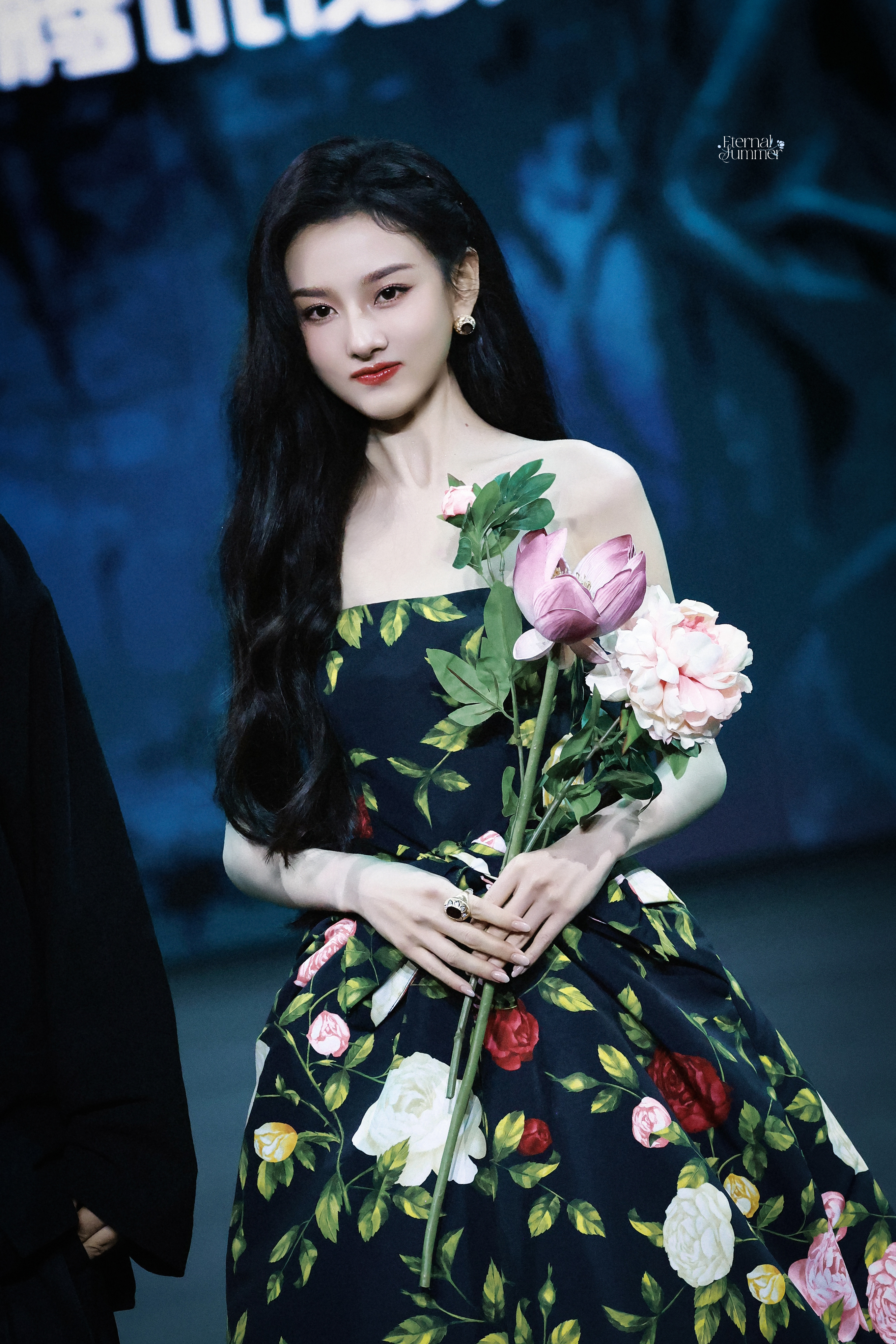 宋祖儿 黑发衬着红唇,裙摆上的花与手中的玫瑰相映,气质里裹着清冷又明艳的美。