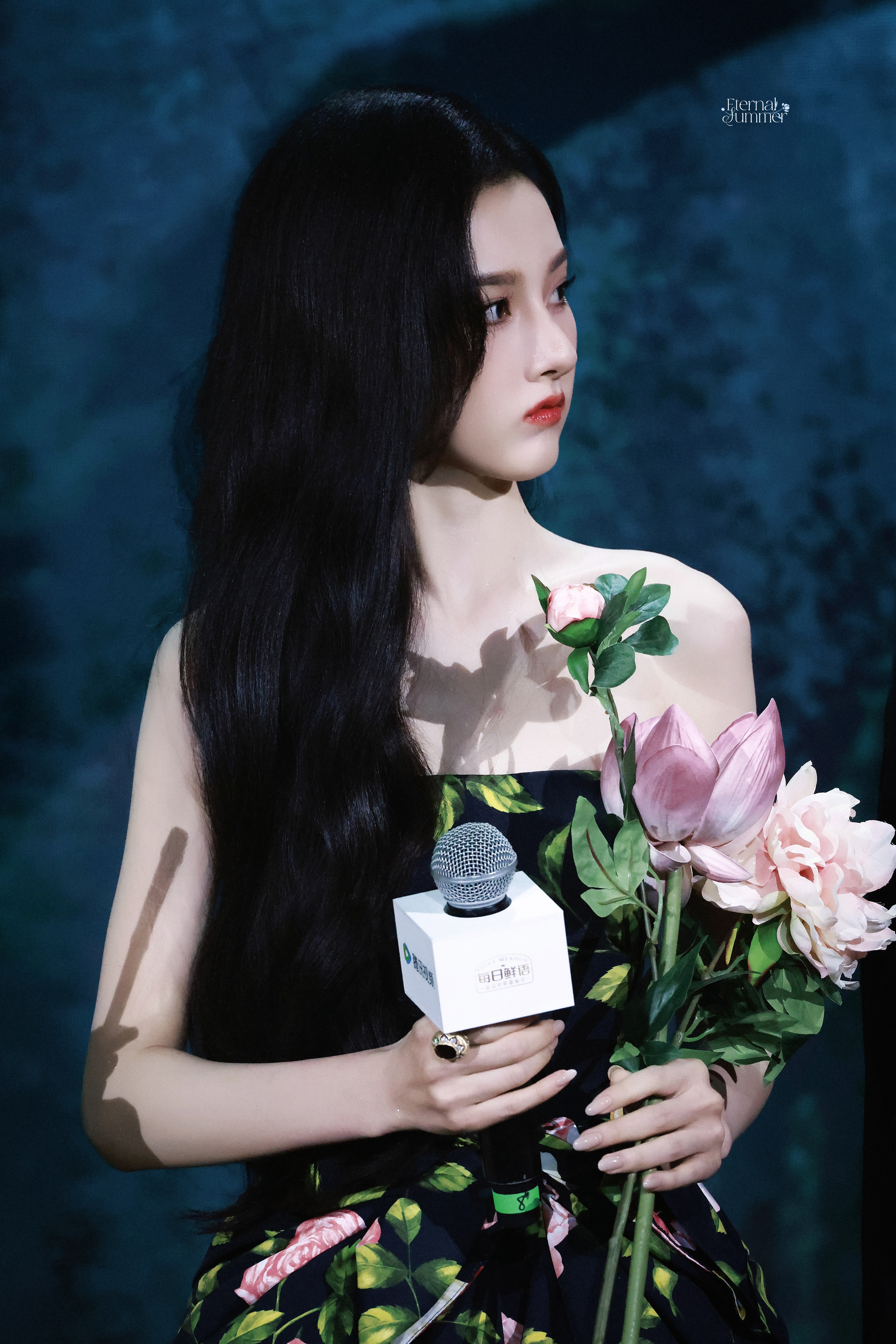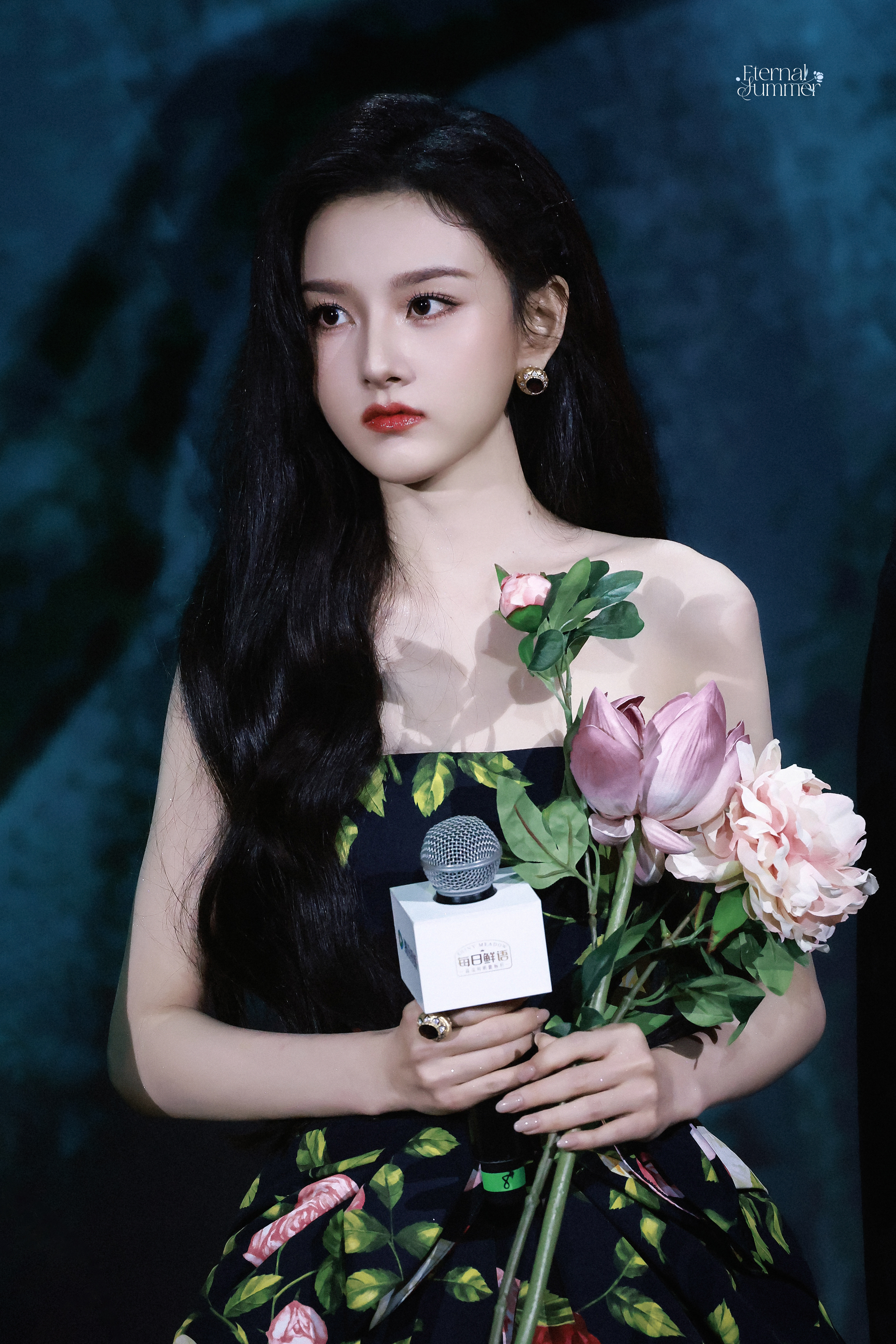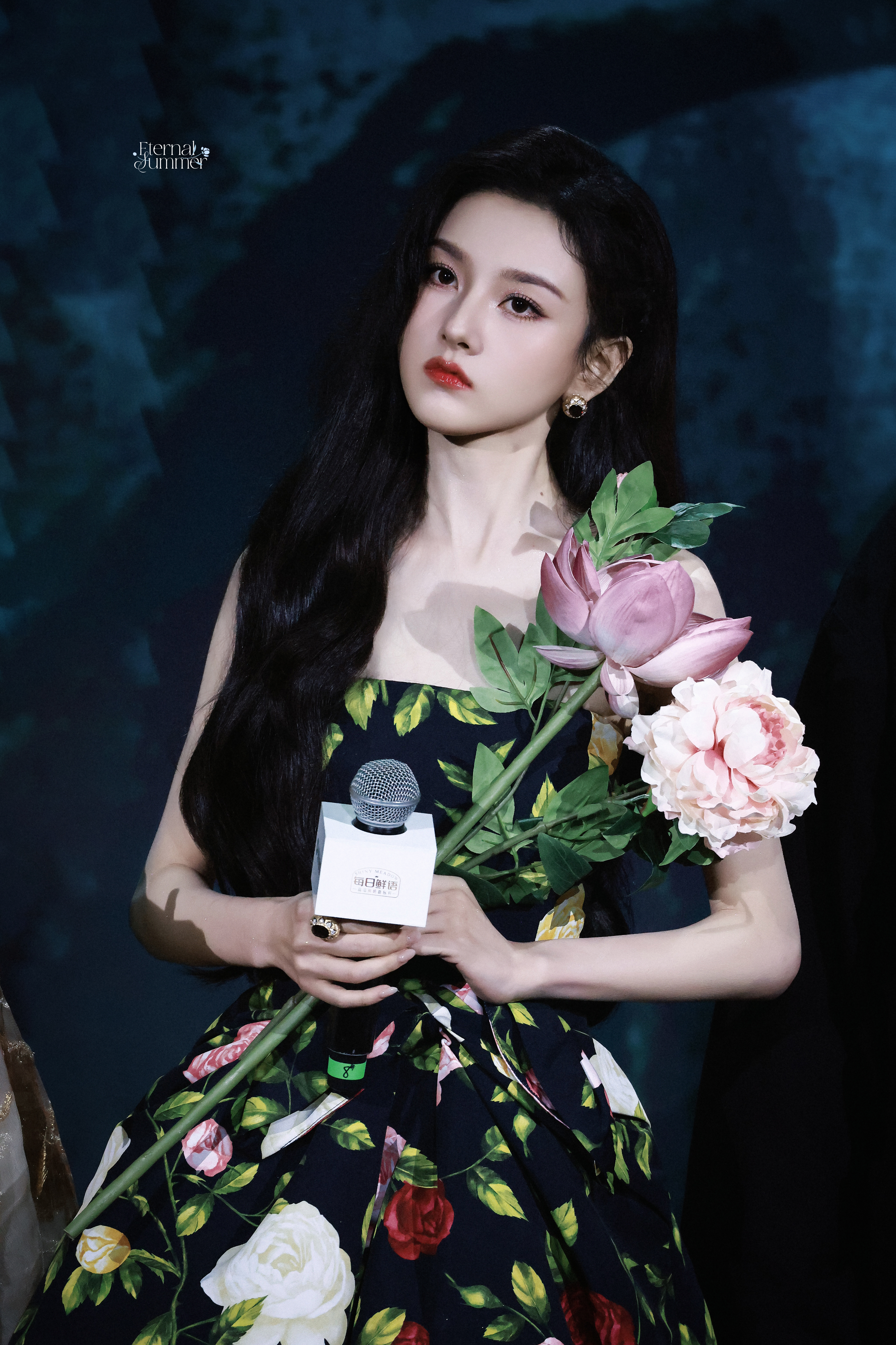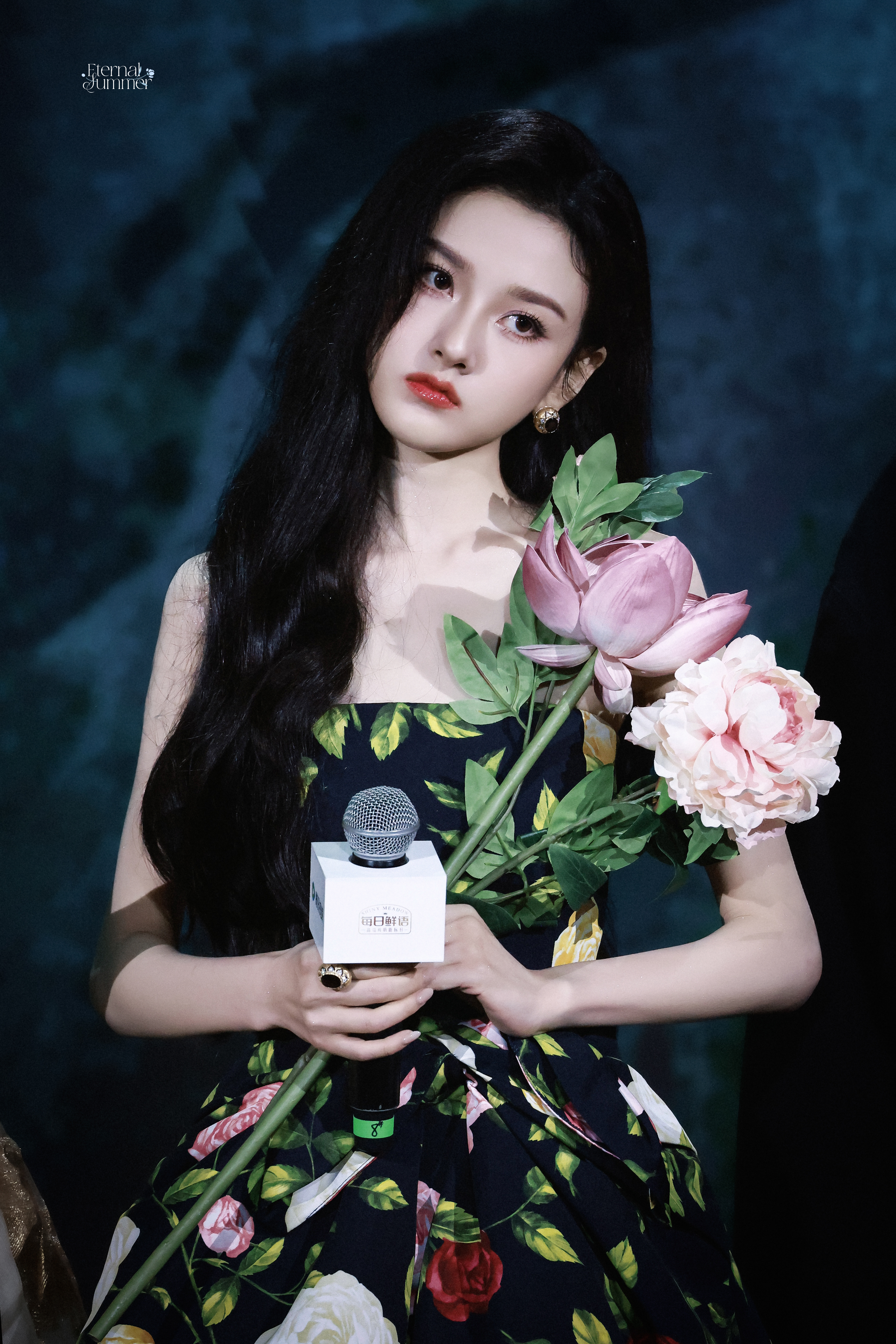 宋祖儿 黑发衬着红唇,裙摆上的花与手中的玫瑰相映,气质里裹着清冷又明艳的美。
