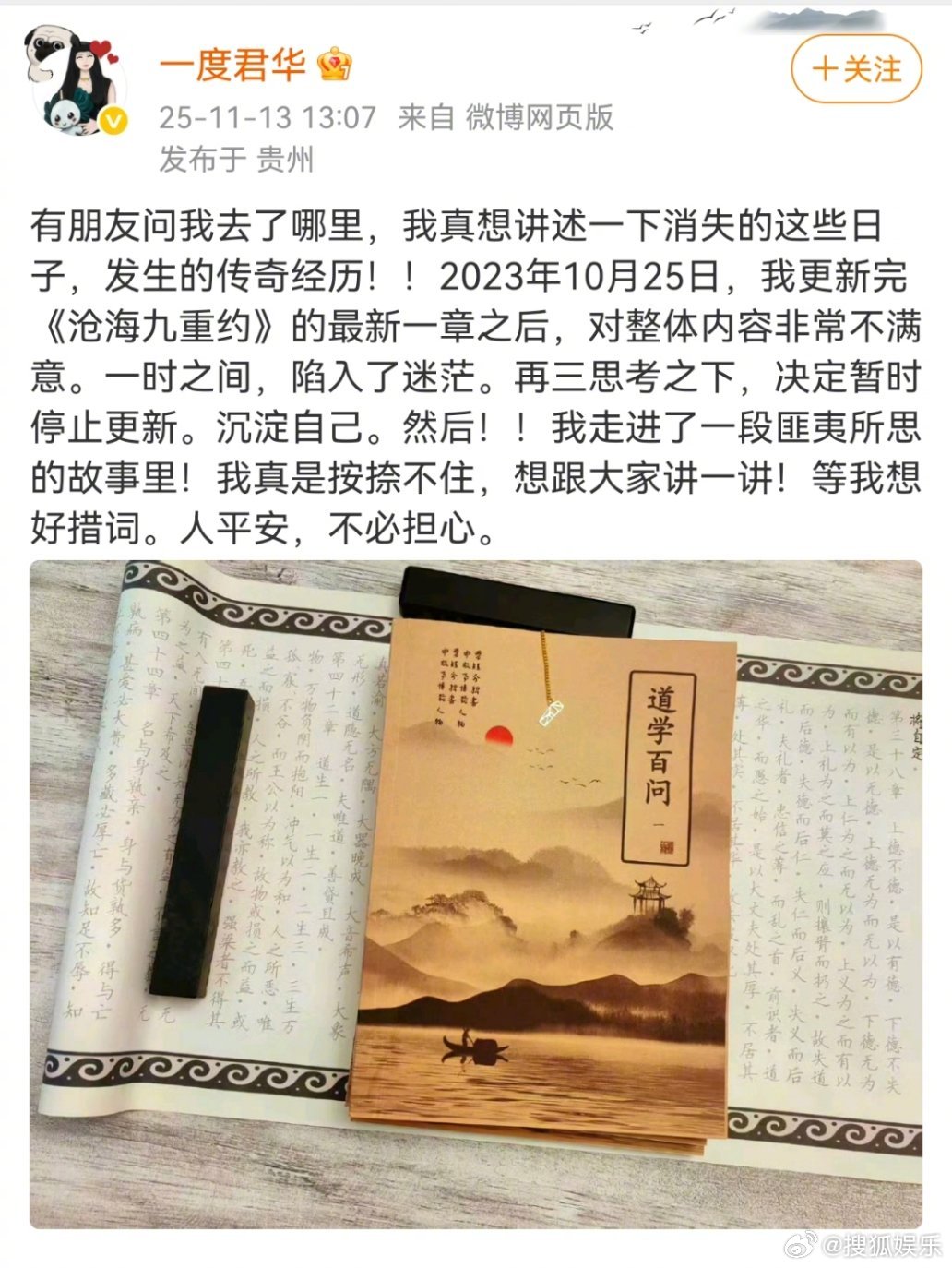 一度君华求救 《星落凝成糖》作者一度君华微博发文求救,其表示有人以高频电磁波对其进行骚扰。今天下午,一度君华还发文称,她在更新完《沧海九重约》后,暂停更新,想要沉淀自己,而这期间走进了一段匪夷所思的故事。