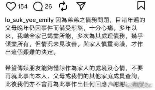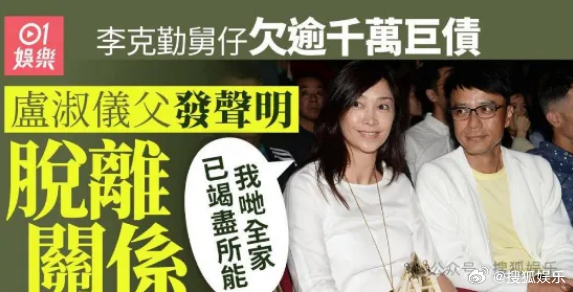 李克勤回应岳父和妻弟断绝关系昨天,歌手李克勤的岳父卢国辉发布一则公开声明,宣布与儿子卢煜培(也就是李克勤小舅子)自2025年11月12号起,断绝父子关系。稍晚,李克勤老婆卢淑仪发文补充说明,称弟弟卢煜培债务问题严重,父母一把年纪还为此伤身劳神,实在令人心痛。李克勤也通过经纪人霍汶希发声,称确实因此困扰多年,支持太太和岳父岳母的决定。有传言称,李克勤小舅子欠债数目高达千万。详情→