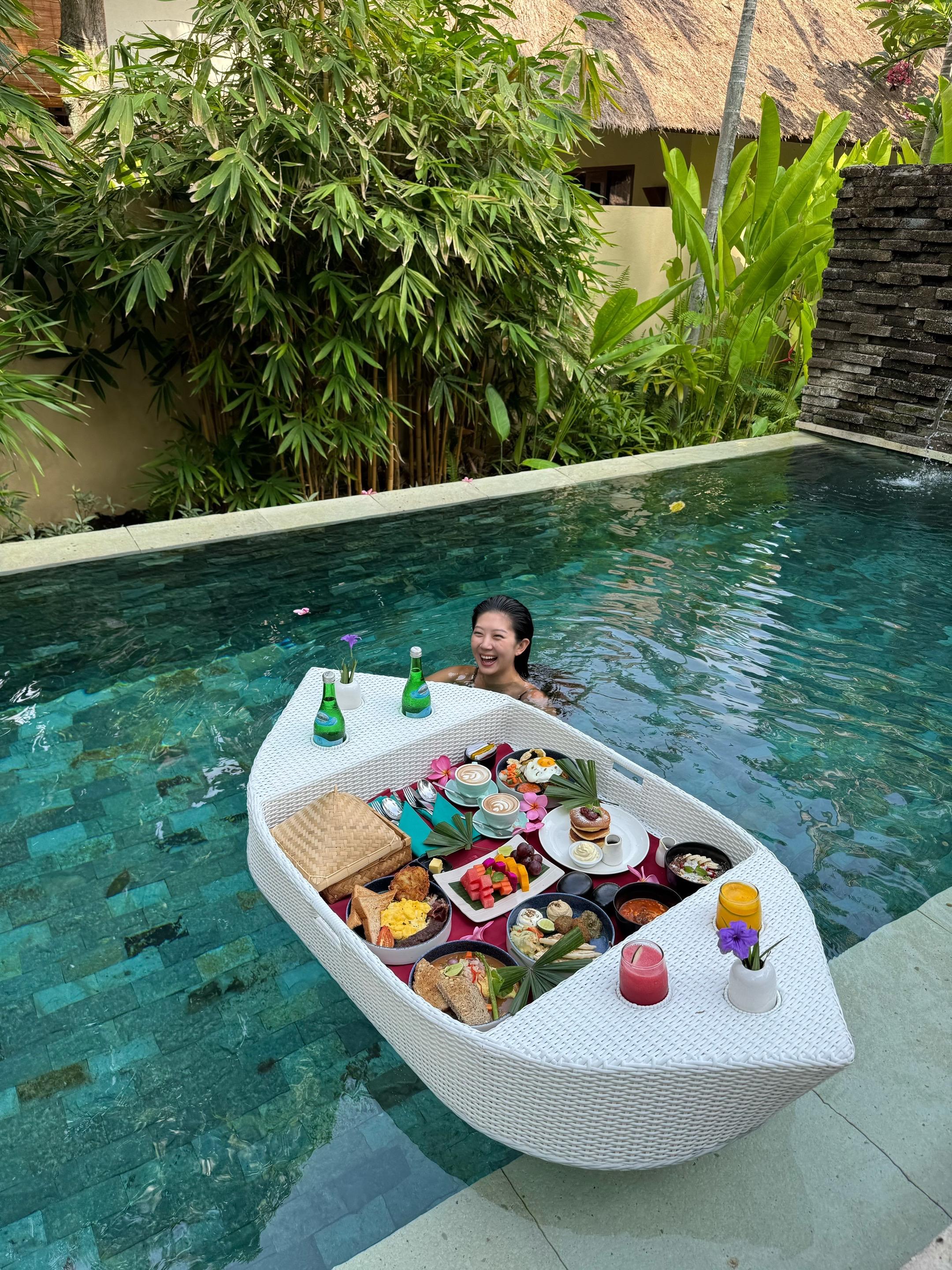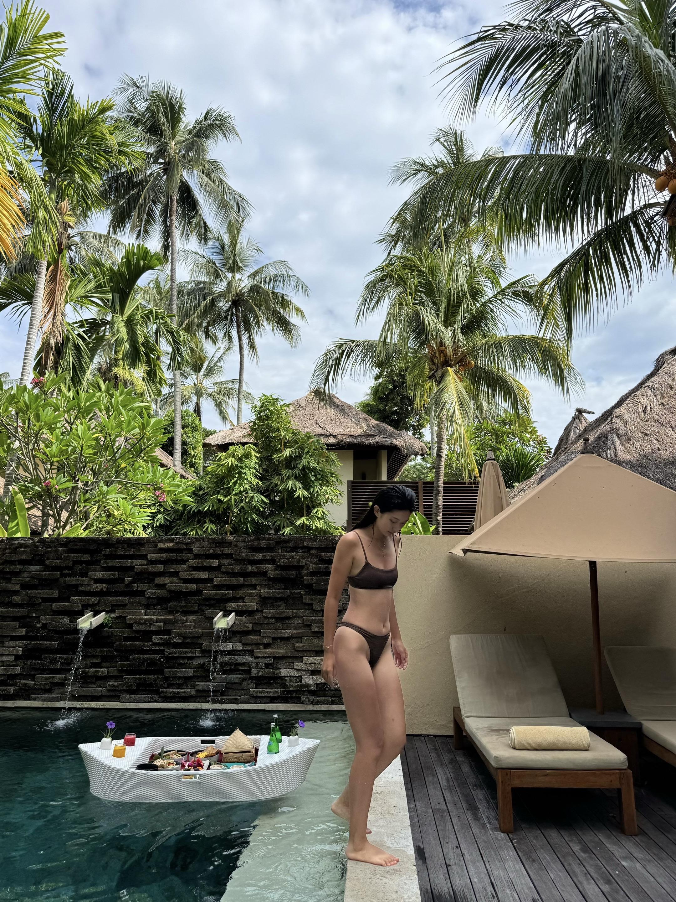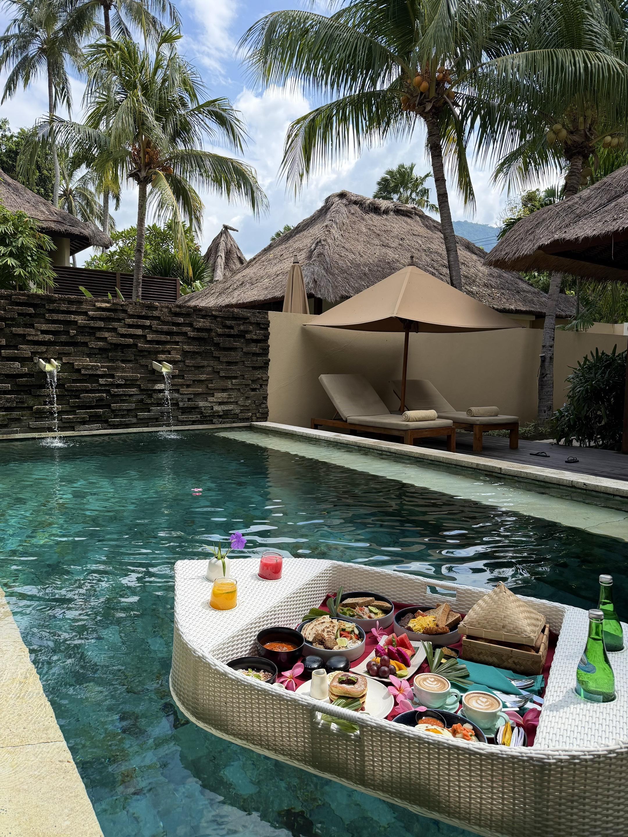 Vacay vibes🏝️ 在龙目岛Qunci villa开启「躺平式度假」 睁眼第一件事—— 跳进泳池等漂浮早餐 咖啡混着鸡蛋培根的香气🥓 蹭着水波晃啊晃 在泳池里边扑腾边吃早餐 这种奢侈的懒散让人上瘾😋! 下午在躺椅上美黑☀️ 看鸡蛋花啪嗒掉进水里 傍晚溜达去酒店的海边日落餐厅小酌一杯🍸 🦪生蚝鲜得像刚出海 挤点柠檬汁吸溜一口 海水味的冰凉滑进喉咙 配着粉紫色日落喝马天尼 是谁又幸福了呀🥰 说实话以前觉得「泡酒店」很亏 现在真香了 在琨淇每天吃四顿(还有夜宵!) 从泳池漂到沙滩 从早餐