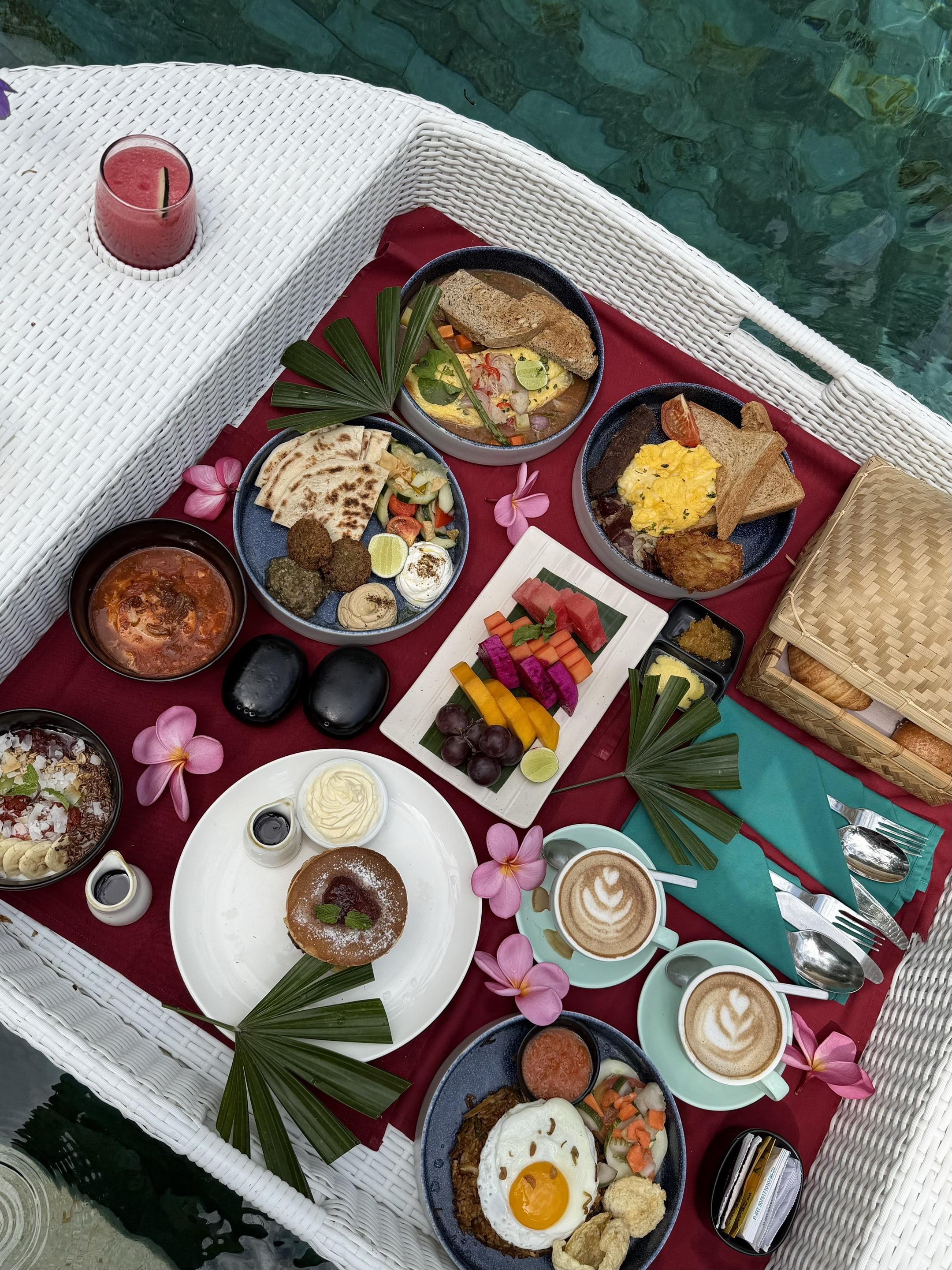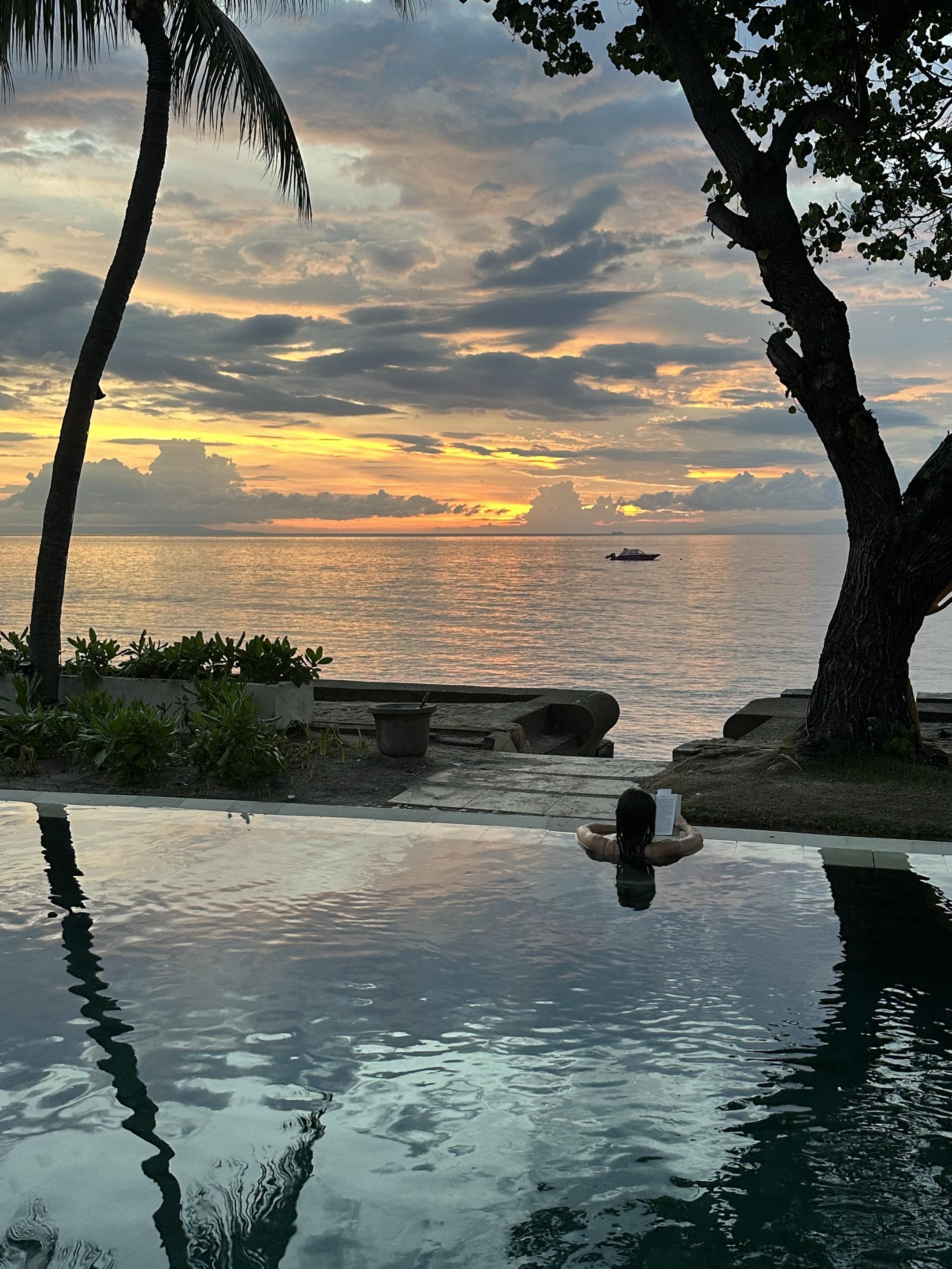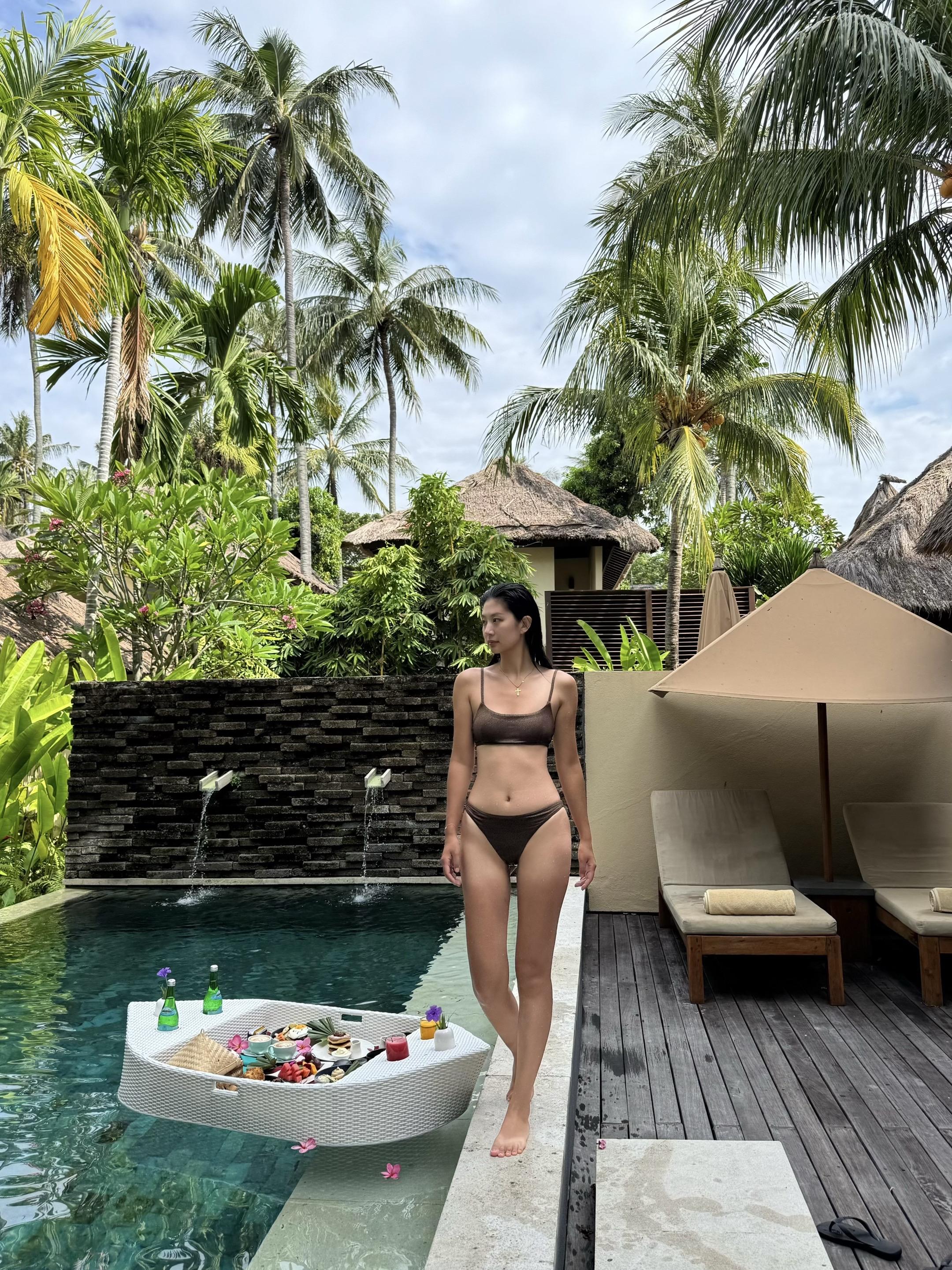 Vacay vibes🏝️ 在龙目岛Qunci villa开启「躺平式度假」 睁眼第一件事—— 跳进泳池等漂浮早餐 咖啡混着鸡蛋培根的香气🥓 蹭着水波晃啊晃 在泳池里边扑腾边吃早餐 这种奢侈的懒散让人上瘾😋! 下午在躺椅上美黑☀️ 看鸡蛋花啪嗒掉进水里 傍晚溜达去酒店的海边日落餐厅小酌一杯🍸 🦪生蚝鲜得像刚出海 挤点柠檬汁吸溜一口 海水味的冰凉滑进喉咙 配着粉紫色日落喝马天尼 是谁又幸福了呀🥰 说实话以前觉得「泡酒店」很亏 现在真香了 在琨淇每天吃四顿(还有夜宵!) 从泳池漂到沙滩 从早餐