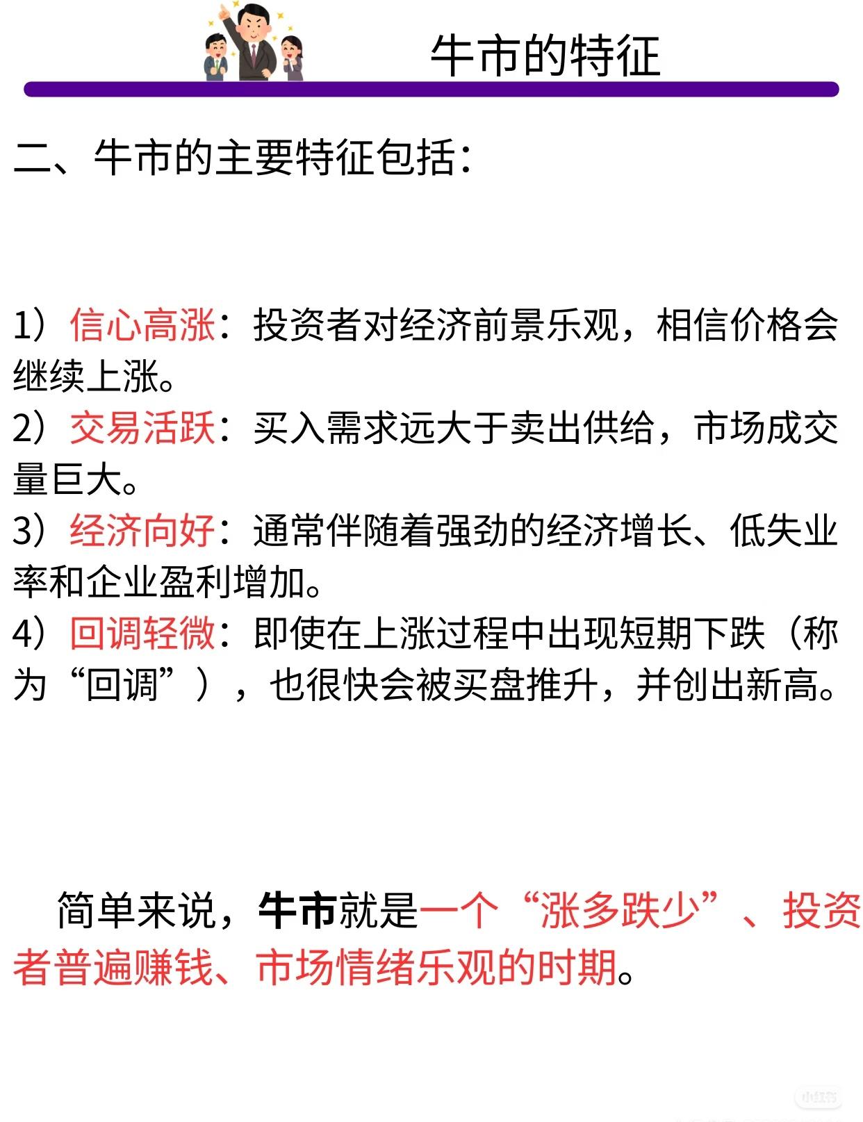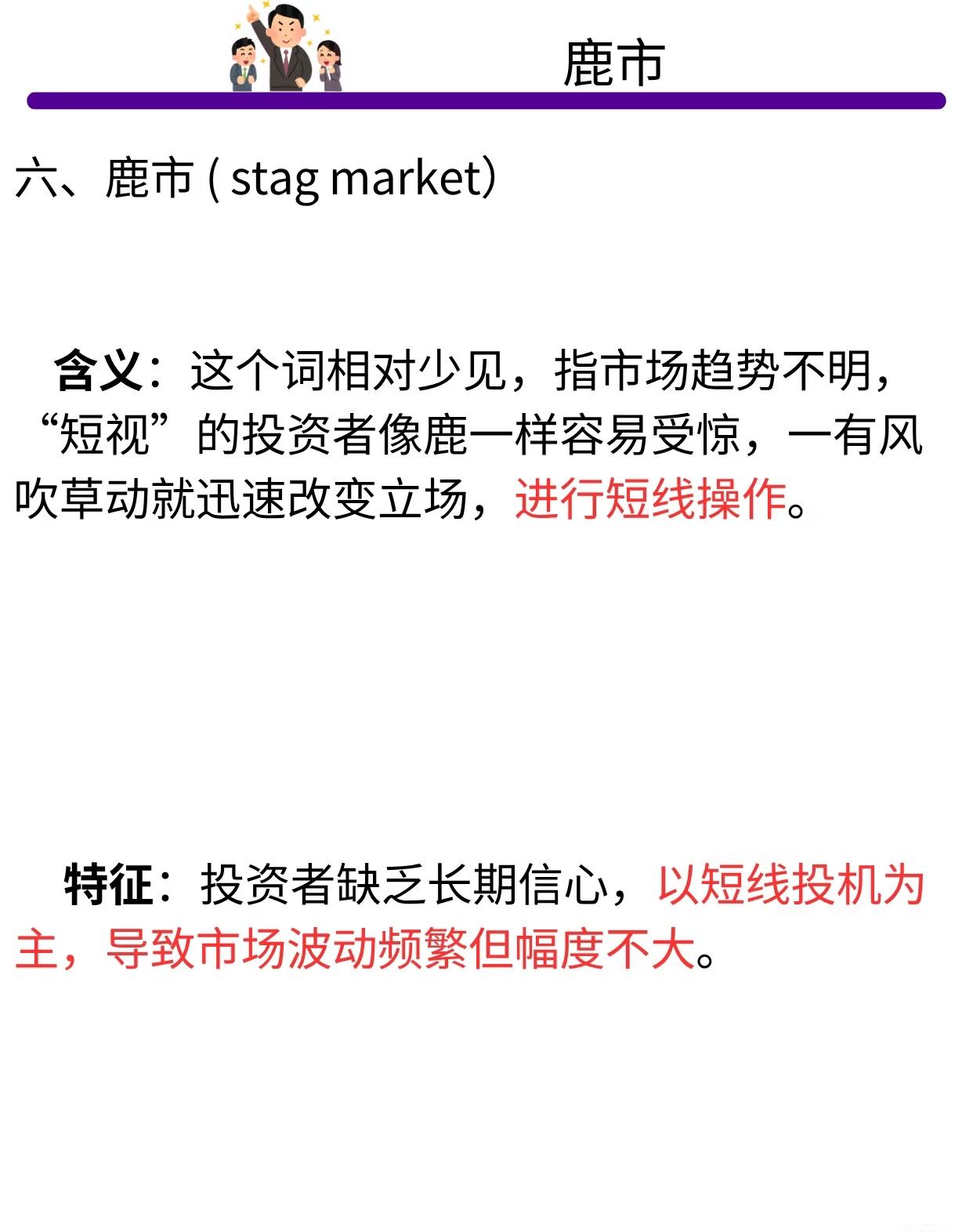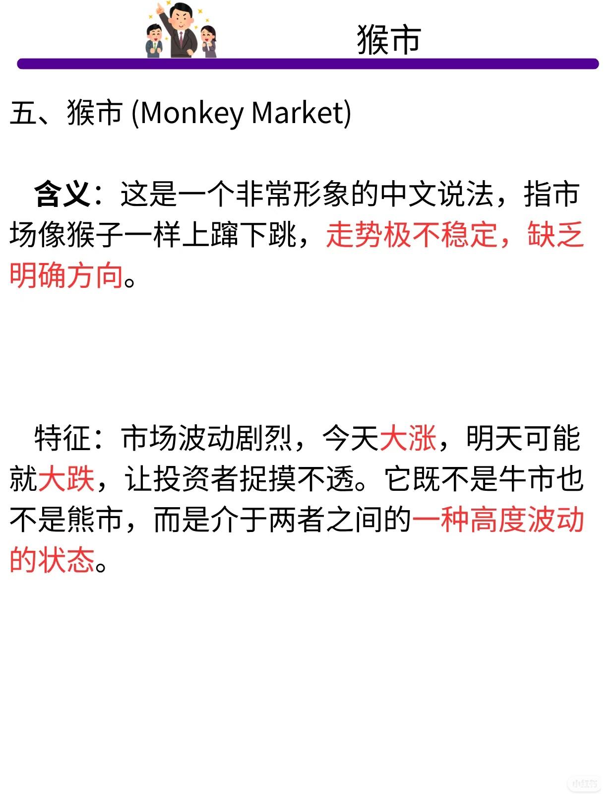 金融市场中常见的几种行情类型及其特征,主要包含以下内容总结: 一、牛市(Bull Market)🐂 定义:资产价格(如股票、债券、房地产等)长期持续上涨的市场行情。 名称来源:源于牛攻击时用角自下而上挑起的动作,象征价格一路向上。 主要特征(图片2): 1. 信心高涨:投资者对未来经济与价格持乐观态度。 2. 交易活跃:市场成交量大,买入意愿强烈。 3. 经济向好:通常伴随经济增长、低失业率、企业盈利上升。 4. 回调轻微:即使有短期下跌,也会迅速反弹并创新高。👉 总结:牛市是“涨多跌少”、投资者普遍盈利、市场情绪积极的阶段。 二、熊市(Bear Market)🐻 定义:与牛市相反,资产价格长期持续下跌的市场行情。 名称来源:源于熊攻击时用熊掌自上而下拍击,象征价格一路向下。 主要特征(图片3): - 投资者信心低迷,恐慌性抛售; - 经济前景黯淡,负面消息频传; - 通常定义为从近期高点下跌 20% 或更多。👉 总结:熊市是“跌多涨少”、市场情绪悲观、投资者普遍亏损的阶段。 三、震荡市(Sideways Market)📊 定义:市场价格在一定区间内上下波动,无明显上涨或下跌趋势。 主要特征(图片4): - 市场方向不明确,多空力量相对均衡; - 投资者常采用“高抛低吸”策略; - 也被称为“盘整市”。👉 总结:震荡市没有明确趋势,适合波段操作。 四、猴市(Monkey Market)🐵 定义:市场走势极不稳定,像猴子一样上蹿下跳,缺乏明确方向。 主要特征(图片5): - 波动剧烈,今日大涨明日可能大跌; - 既非牛市也非熊市,是一种高度波动的中间状态。👉 总结:猴市行情难以预测,风险较高,投资难度大。 五、鹿市(Stag Market)🦌 定义:较为少见,市场趋势不明朗,投资者容易受短期消息影响,频繁调整策略。 主要特征(图片6): - 投资者像“鹿”一样容易受惊,一有风吹草动便迅速改变立场; - 以短线操作、投机为主,缺乏长期信心; - 导致市场波动频繁,但幅度一般不大。👉 总结:鹿市中投资者行为短期化,市场情绪敏感,波动虽频繁但通常不极端。