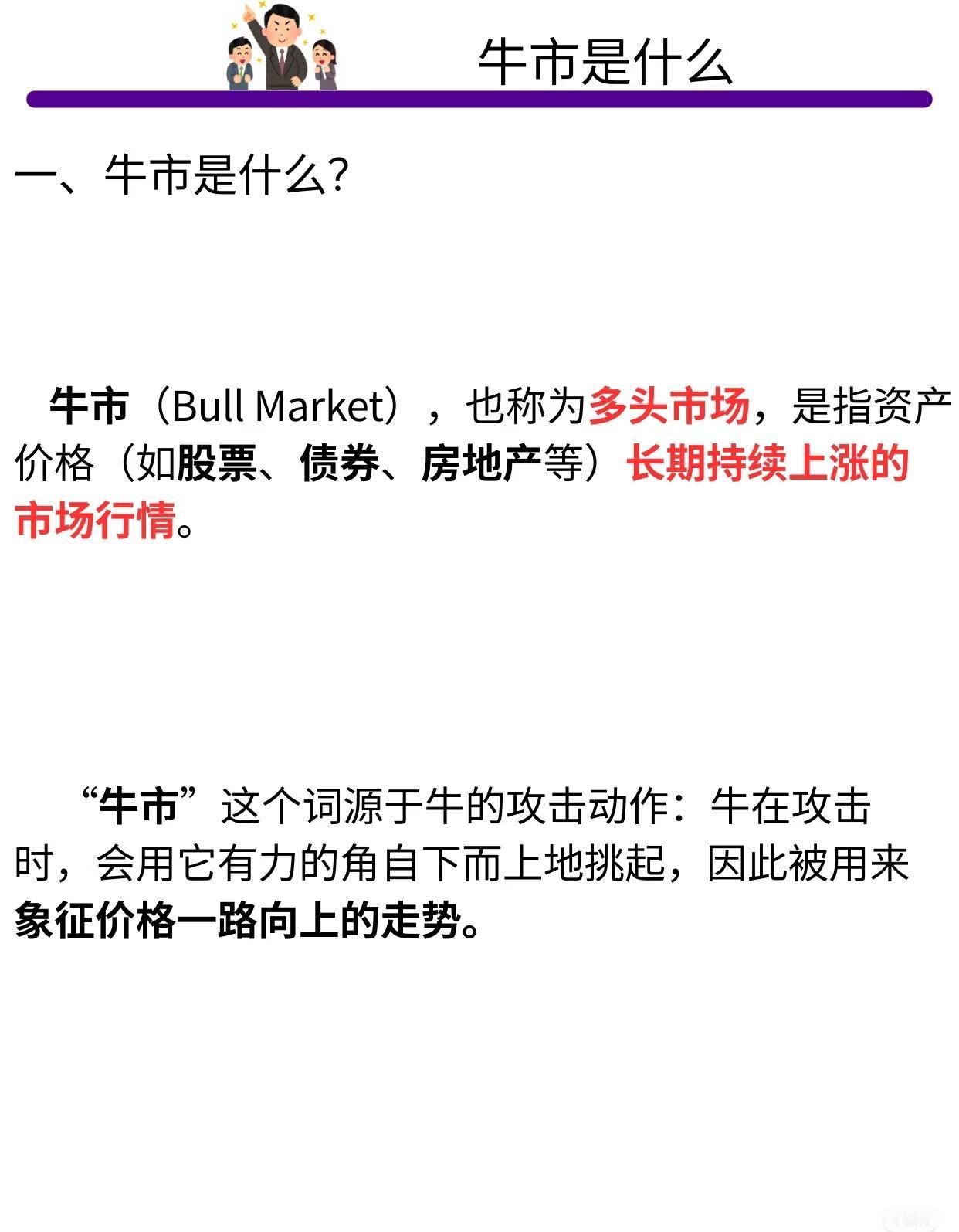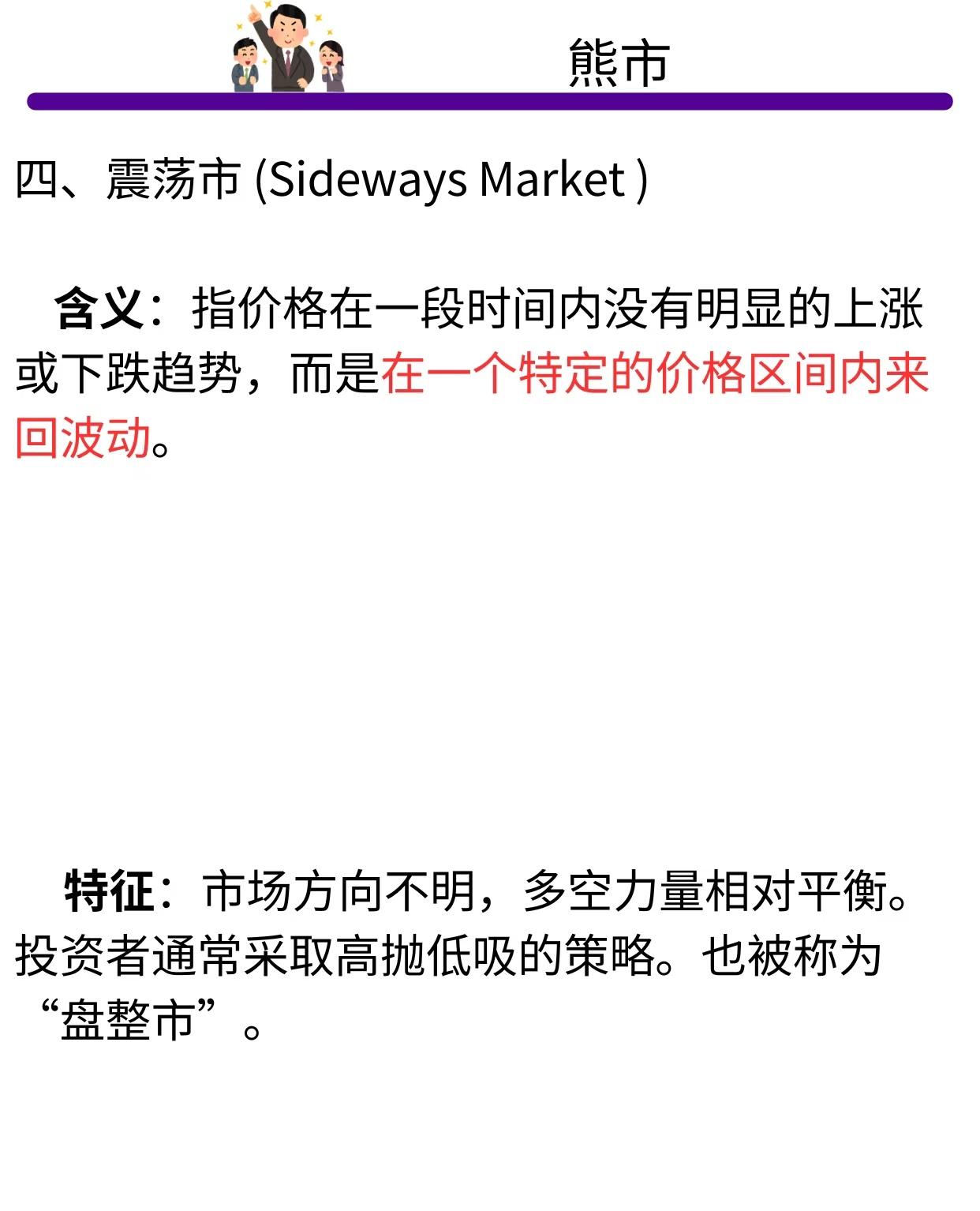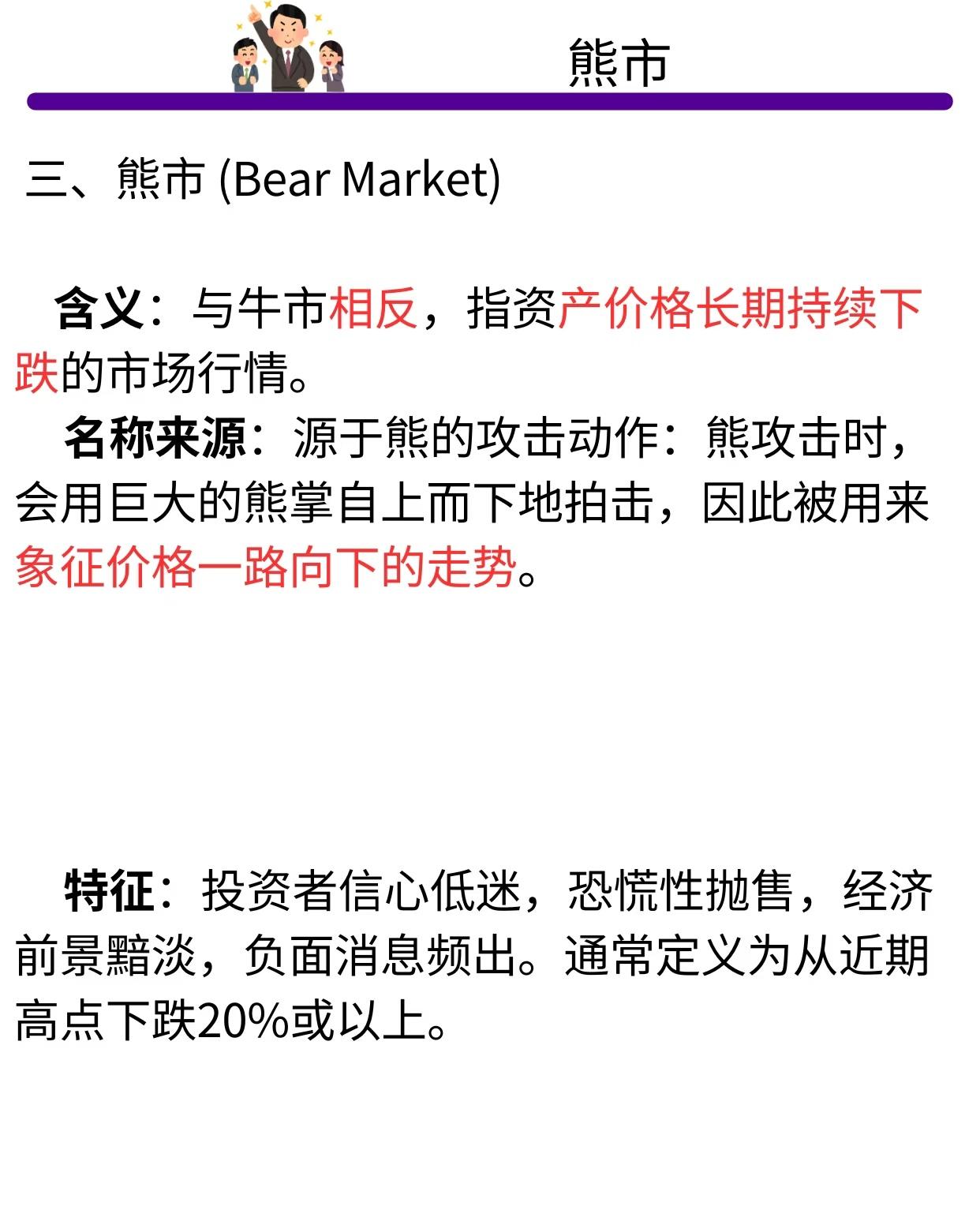 金融市场中常见的几种行情类型及其特征,主要包含以下内容总结: 一、牛市(Bull Market)🐂 定义:资产价格(如股票、债券、房地产等)长期持续上涨的市场行情。 名称来源:源于牛攻击时用角自下而上挑起的动作,象征价格一路向上。 主要特征(图片2): 1. 信心高涨:投资者对未来经济与价格持乐观态度。 2. 交易活跃:市场成交量大,买入意愿强烈。 3. 经济向好:通常伴随经济增长、低失业率、企业盈利上升。 4. 回调轻微:即使有短期下跌,也会迅速反弹并创新高。👉 总结:牛市是“涨多跌少”、投资者普遍盈利、市场情绪积极的阶段。 二、熊市(Bear Market)🐻 定义:与牛市相反,资产价格长期持续下跌的市场行情。 名称来源:源于熊攻击时用熊掌自上而下拍击,象征价格一路向下。 主要特征(图片3): - 投资者信心低迷,恐慌性抛售; - 经济前景黯淡,负面消息频传; - 通常定义为从近期高点下跌 20% 或更多。👉 总结:熊市是“跌多涨少”、市场情绪悲观、投资者普遍亏损的阶段。 三、震荡市(Sideways Market)📊 定义:市场价格在一定区间内上下波动,无明显上涨或下跌趋势。 主要特征(图片4): - 市场方向不明确,多空力量相对均衡; - 投资者常采用“高抛低吸”策略; - 也被称为“盘整市”。👉 总结:震荡市没有明确趋势,适合波段操作。 四、猴市(Monkey Market)🐵 定义:市场走势极不稳定,像猴子一样上蹿下跳,缺乏明确方向。 主要特征(图片5): - 波动剧烈,今日大涨明日可能大跌; - 既非牛市也非熊市,是一种高度波动的中间状态。👉 总结:猴市行情难以预测,风险较高,投资难度大。 五、鹿市(Stag Market)🦌 定义:较为少见,市场趋势不明朗,投资者容易受短期消息影响,频繁调整策略。 主要特征(图片6): - 投资者像“鹿”一样容易受惊,一有风吹草动便迅速改变立场; - 以短线操作、投机为主,缺乏长期信心; - 导致市场波动频繁,但幅度一般不大。👉 总结:鹿市中投资者行为短期化,市场情绪敏感,波动虽频繁但通常不极端。
