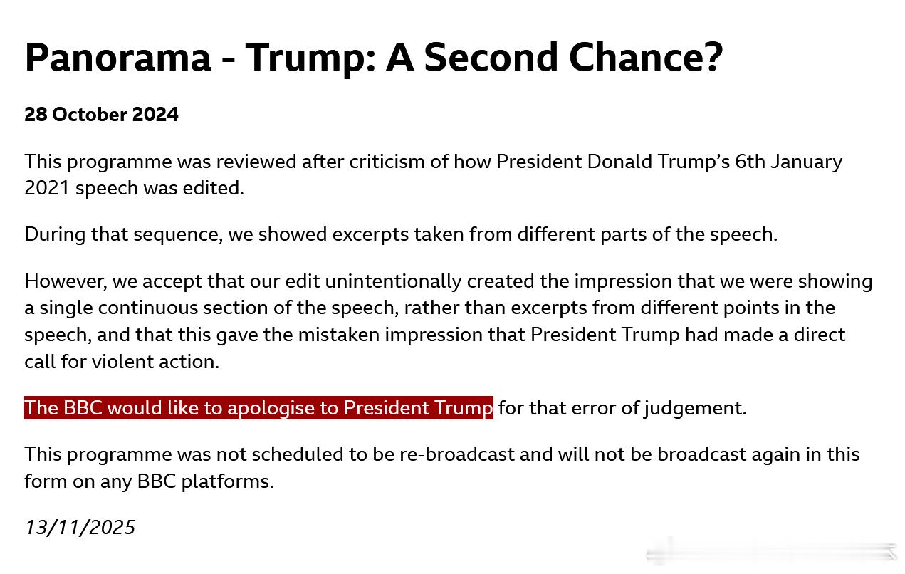 【黄金时代】BBC就J6“川普:第二次机会?”纪录片中存在误导性剪辑向川普道歉。