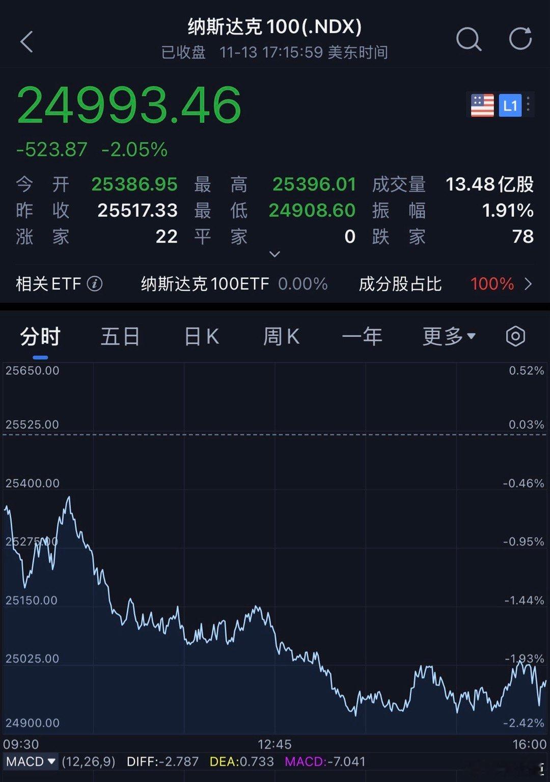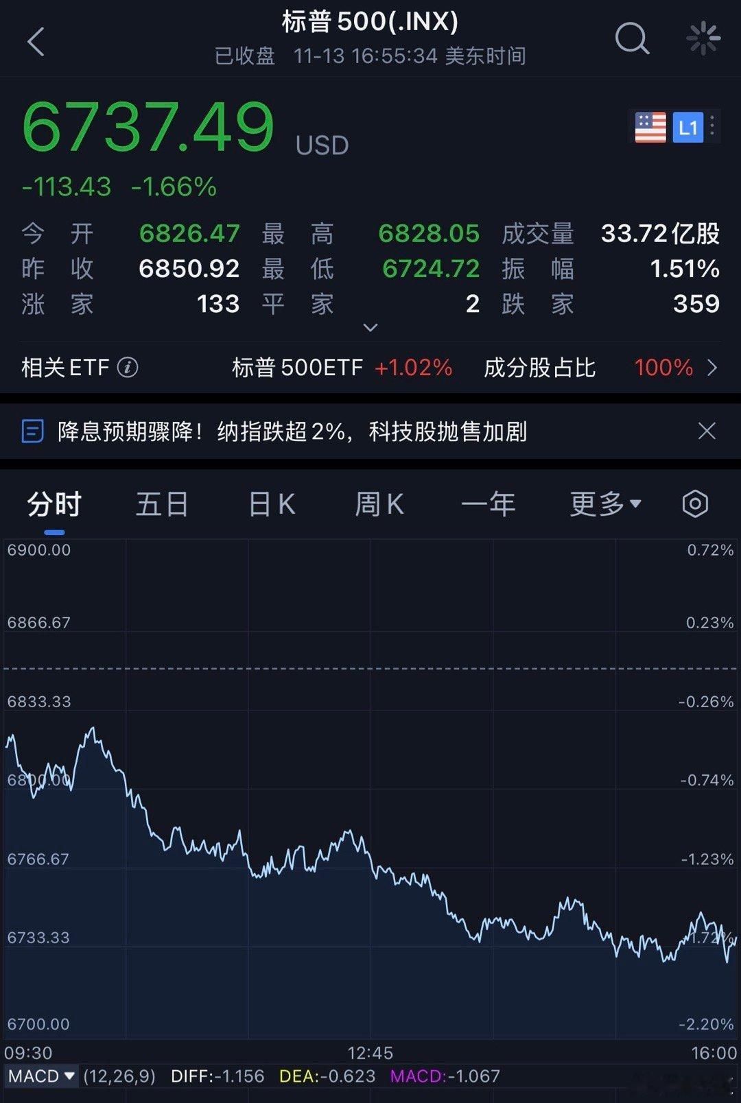 老板们早安,打卡养铁咯昨夜美股大幅下跌,三大指数创一个多月以来最大单日跌幅,AI 龙头引领下挫。截至收盘,道琼斯工业平均指数下跌797.6点,收于47457.22点,跌幅1.65%;标普500指数下跌1.66%,收于6737.49点;纳斯达克综合指数重挫2.29%,报22870.36点。中概股多数承压,纳斯达克中国金龙指数收跌 1.59%。在标普500的11个板块中,有9个收跌,非必需消费品板块领跌2.73%,信息技术板块下滑2.37%。❗️价值股指数本周以来上涨约1%,成长股指数则下跌0.6%,体现出资金自高估值科技股流向防御型领域。国际金价继续震荡。
