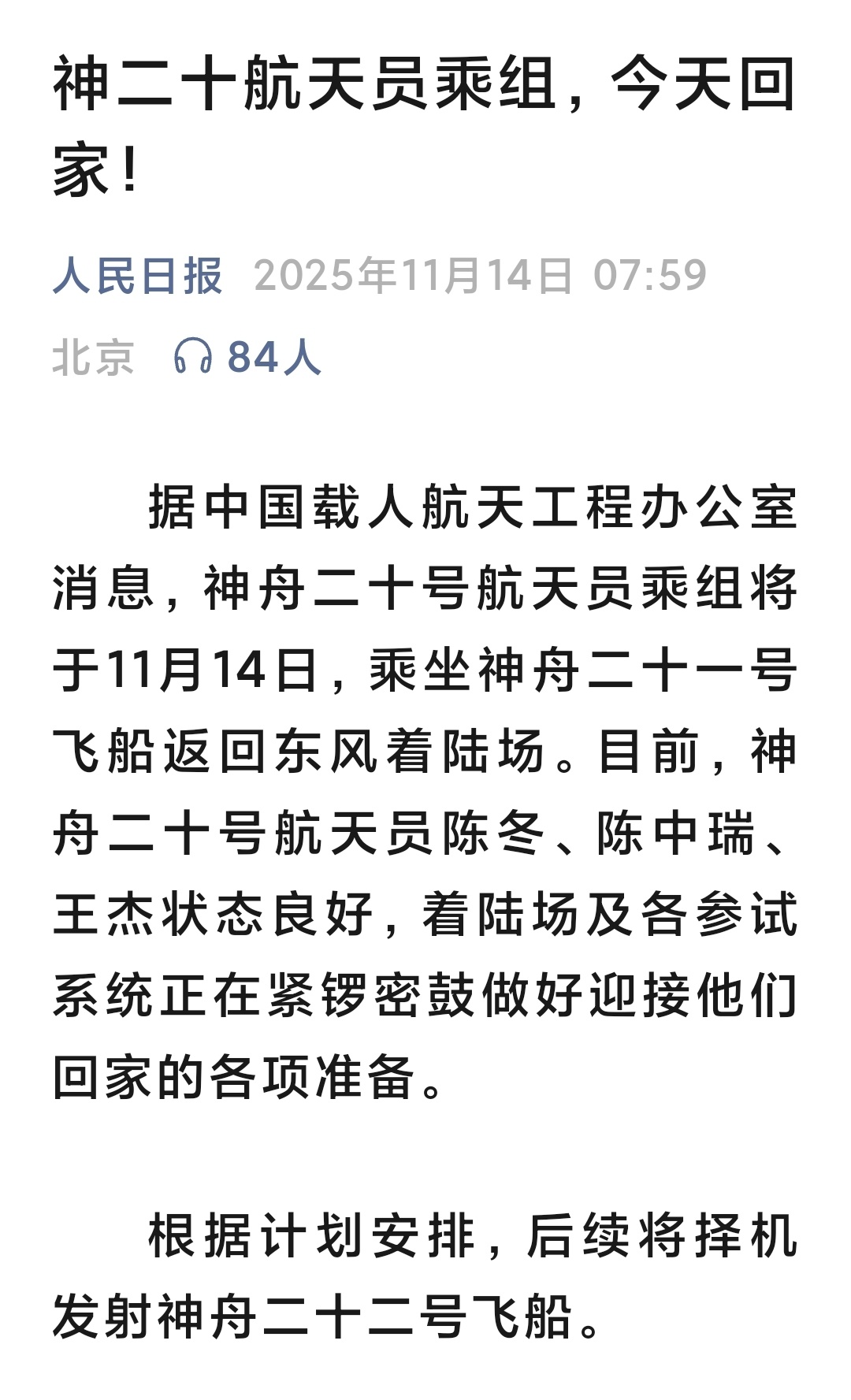 原计划乘坐神舟二十号返回,受损,改为神二十一以前没发生过这种事。本来时间序列是:1. 初始状态,站内3人,神N对接在空间站一个接口有段时间了,3人就是神N上来的。2. 神N+1载3人发射,对接空间站另一个接口,会师。站内6人,同时接入神N与神N+1。3. 拍6人合照,交接任务。4. 原来的3人搭乘神N返回地球。5. N++,回到状态1。也就是乘坐神N上来的,还是搭乘神N返回地球。现在,第4步出现意外,神N被太空微小物件高速撞击,可能难以修复,返回不能载人。可能这样改程序:4. 原来的3人搭乘神N+1返回地球。站内余3人。5. 神N+2不载人发射击,对接空间站。空间站同时接入神N与神N+2。6. 神N不载人返回地球。空间站只接入神N+2,余3人。7. 神N+3载3人上来,空间站对接神N+2与N+3。8. 3人搭乘神N+2返回。9. 恢复正常,N=N+3。也就是神N上来的,有两波人是神N+1回。再多发个不载人的,返回个不载人的。第三波人回到“上来和回去一个飞船”的模式。