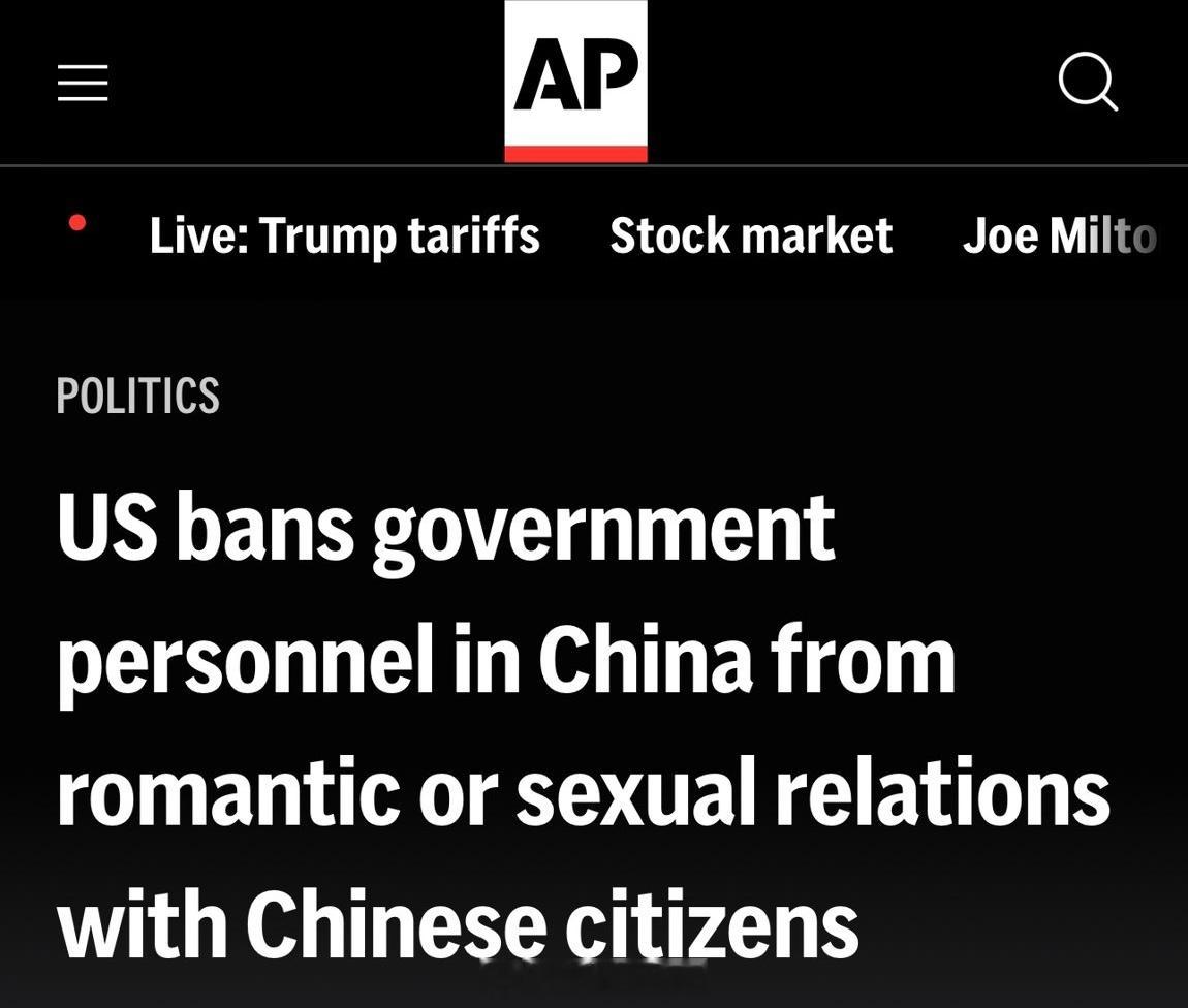 美联社今年一月份的报道,特朗普政府明确禁止在华政府人员与中国公民发生恋爱或性关系,任何违反该政策的人将被命令立即离开中国。