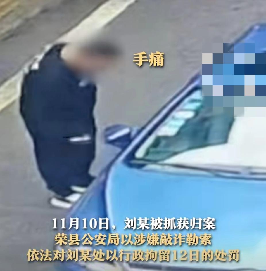 男子手蹭后视镜讹胆小司机2000元,司机三天后报警,警方:“对方涉及敲诈勒索,拘留12日。”11月12日,四川荣县一段监控视频曝光,对于碰瓷,我们零容忍! 监控显示:10月31日,男子郭某正常行驶在路上,这时刘某从车旁路过,右手故意抬高碰到了郭某的后视镜。随即刘某转过身来表示自己手痛,还杨言:“没有几千块钱解决不了!” 郭某慌乱之下给刘某微信转账2000元,两人私下解决。 三天后郭某越想越不对劲,于是报警,警方通过监控视频认定刘某是碰瓷,属于敲诈勒索,将面临全额退钱并拘留12日的处罚。11月10日,刘某被抓捕归案。 刘某告诉警方:当时在等朋友,突然想找机会赚点钱,就想到了这么个点子。 见过老人碰瓷的,第一次见年轻人也碰瓷的,真是厚颜无耻!碰瓷纠纷 荣县