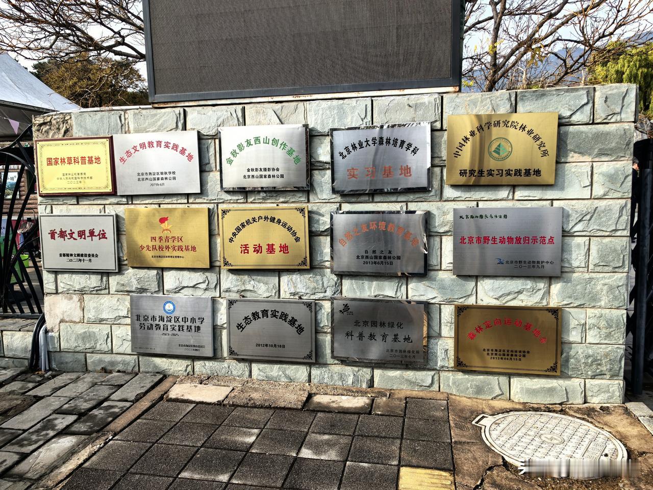 西山国家森林公园东门口的14块牌匾: 1、国家林草科普基地(国家林业和草原局、中华人民共和国科学技术部,二 O 二三年) 2、生态文明教育实践基地(北京市海淀区锦秋学校、北京西山国家森林公园,2023年6月) 3、首都文明单位(首都精神文明建设委员会,二0二三年十一月) 4、四季青学区少先队校外实践基地 (北京市海淀区四季青区管理中心) 5、北京市海淀区中小学劳动教育实践基地(北京市海淀区教育委员会,2023-2025,NO.HOJY2023814, 二0二三年四月) 6、金秋影友西山创作基地(金秋影友摄影协会,北京西山国家森林公园) 7、北京林业大学森林培育学科实习基地 8、中央国家机关户外健身运动协会活动基地 9、自然之友环境教育基地(自然之友, 北京西山国家森林公园,2013年6月15日) 10、北京园林绿化科普教育基地 (北京市园林绿化局,二0一三年七月) 11、中国林业科学研究院林业研究所研究生实习实践基地 12、北京西山国家森林公园:北京市野生动物放归示范点(北京市野生动物救护中心,二0一三年九月) 13、生态教育实践基地(2012年10月18日) 14、森林定向运动基地会(北京市海淀区定向运动协会,北京西山国家森林公园,2013年06月15日)