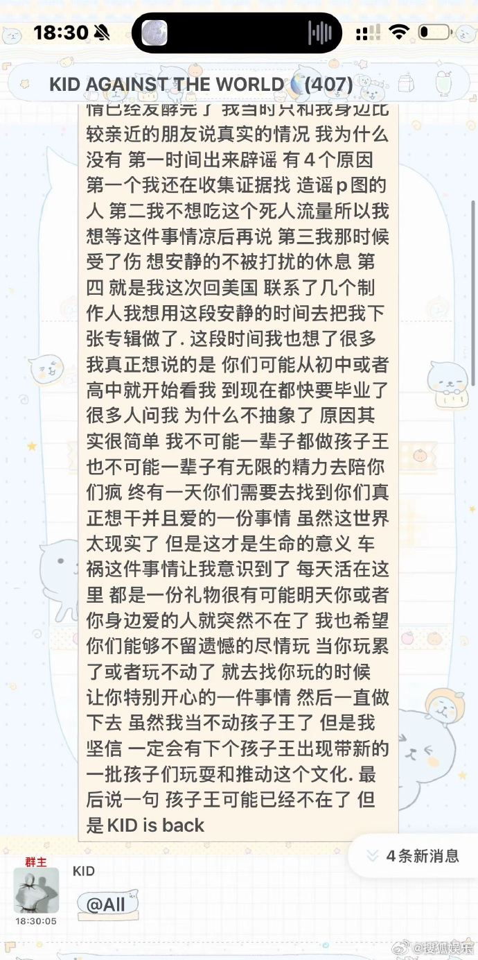 孩子王 复活 说唱歌手孩子王被传美国车祸去世一个月后“复活”,他发长文官宣回归,称当时车祸后手机没了,没办法联系任何人,看到自己去世消息时已经发酵完了。而此前网传孩子王的妈妈已经在朋友圈发过他的讣告。