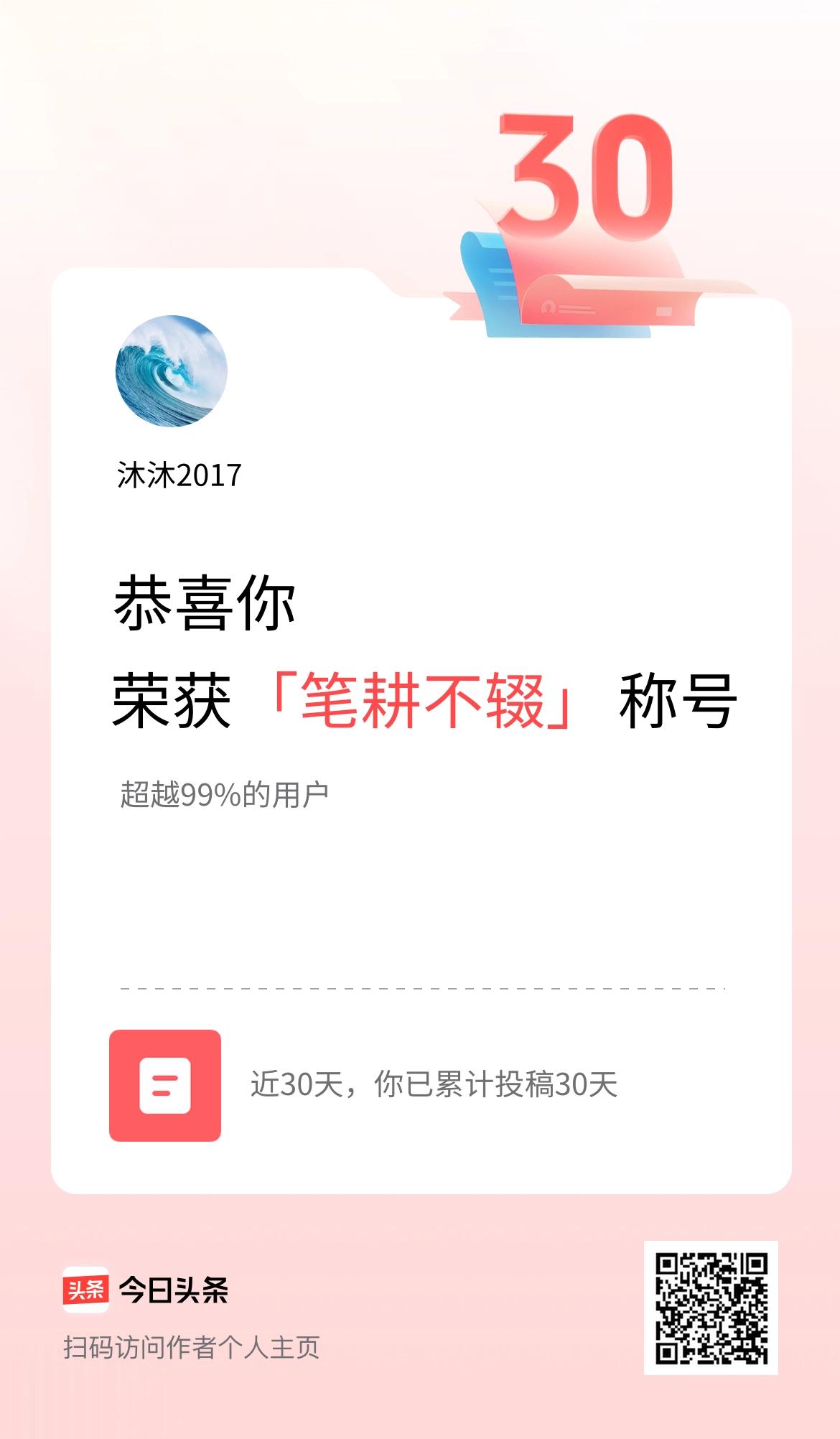 我在头条30天内投稿打卡30天,获得“笔耕不辍”称号