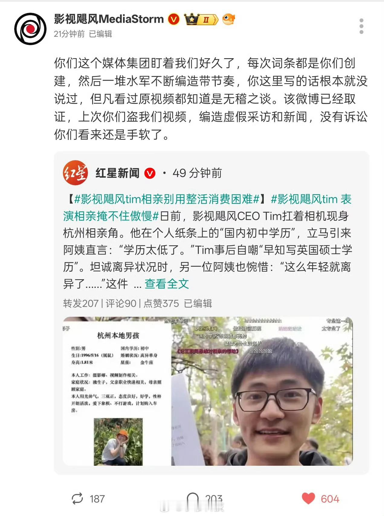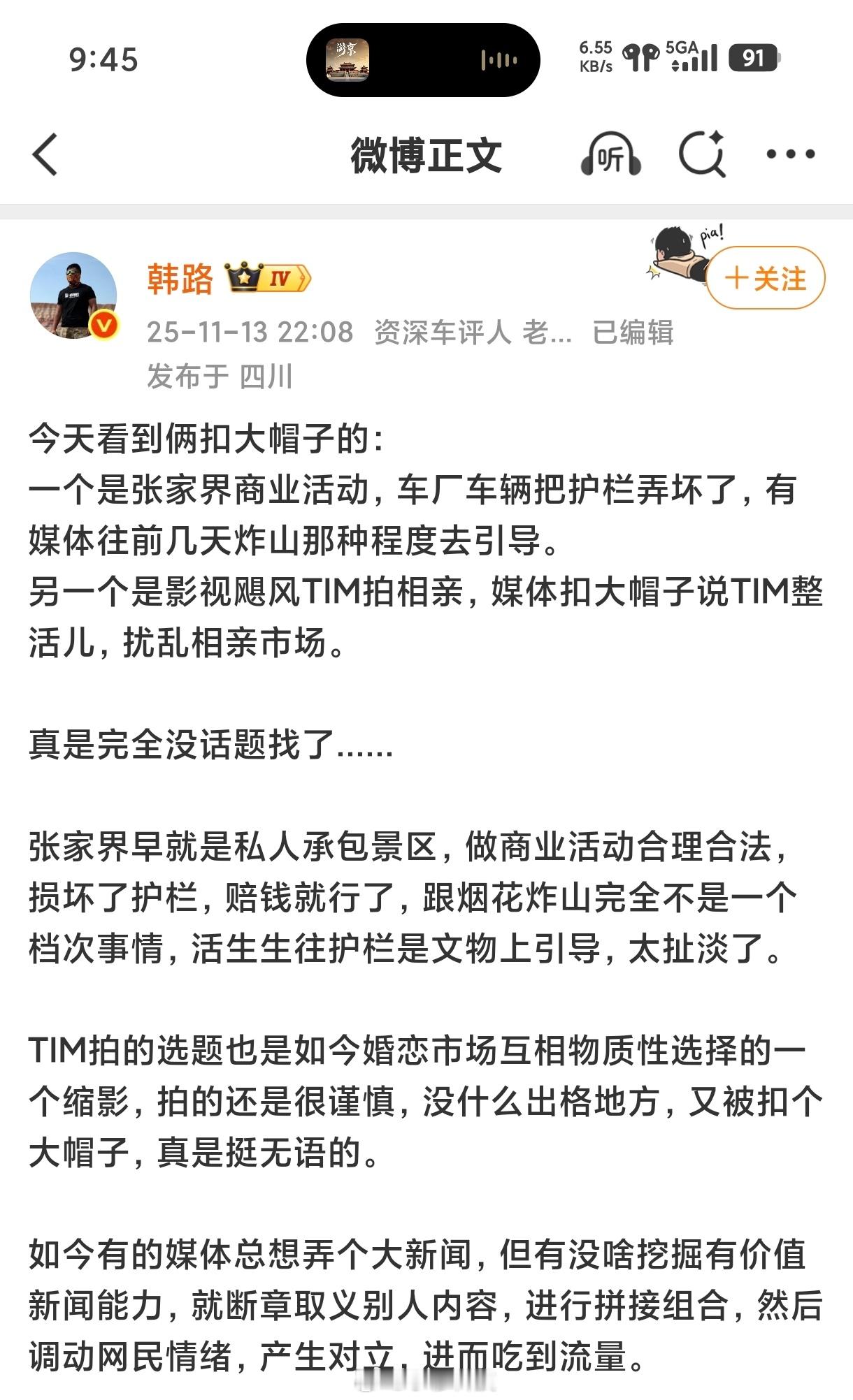 这位老师的对于Tim故意虚假信息拍视频博取流量行为被批评表示同情和无语都是差不多领域头部大V,都是天天为了吃流量博流量的一路人,哪来的脸维护人家博流量行为?可能因为你们本就是一路人他们作为极具影响力的人,在网上为了博流量无所不用其极,只要不违法,心中的道德算什么?怎么好意思替别人说话的?真把自己当普通网友了?懂不懂什么叫扰乱市场,影响市场?如果人人都这样效仿,社会公序良俗该如何如果有影响力的人都不能受道德约束,或者自己没意识到自己应该被道德约束,那对社会和网络影响是很大的,扰乱正确价值观,不符合大政策方向,希望有点脑子吧