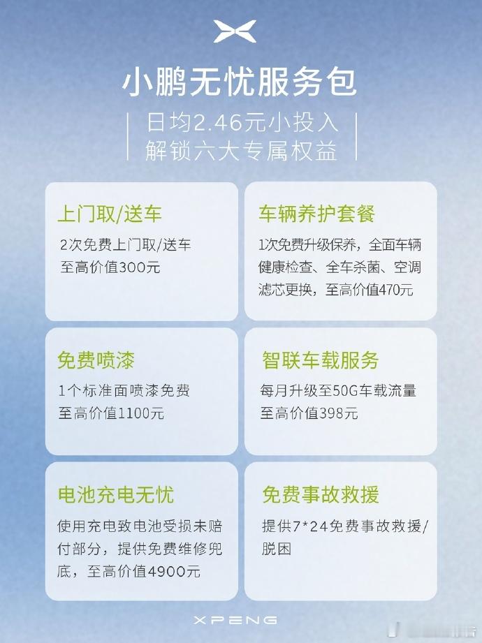 小鹏“无忧服务包”正式上线11月14日,小鹏汽车推出“无忧服务包”,售价899元/年,整合价值7600元的六项服务:两次免费上门取送车、一次基础保养+车内杀菌+空调滤芯更换、一个标准面免费喷漆、每月50G车载流量、电池充电受损免费维修、7×24小时事故救援。仅限在小鹏官方渠道投保车险,并于投保次日到商业险生效后30天内加购。