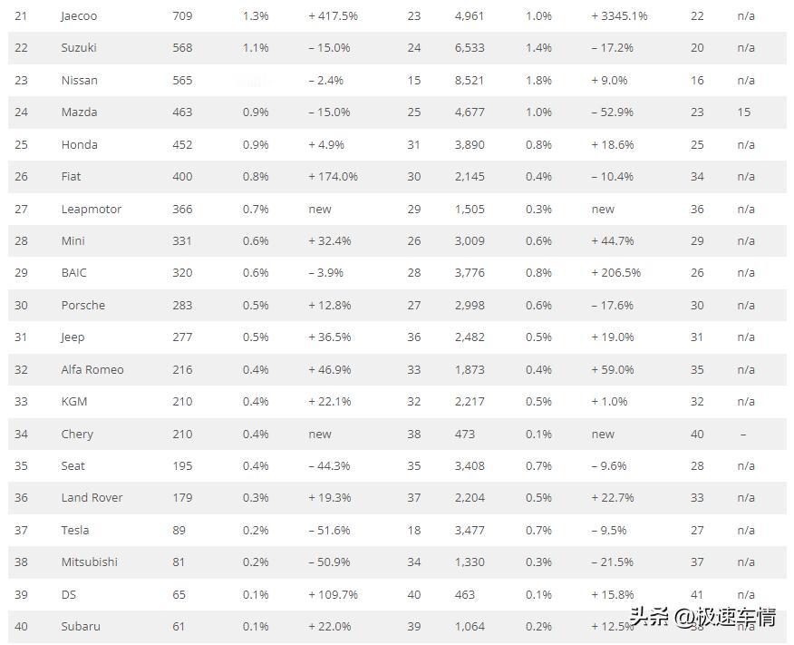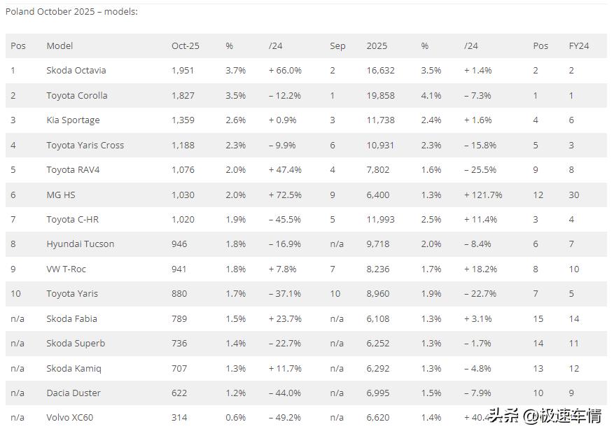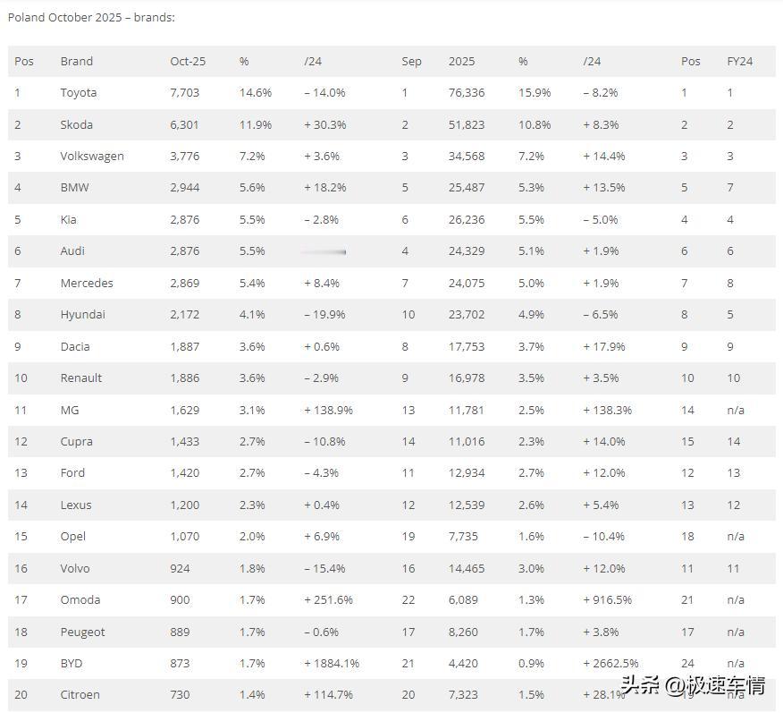 十月,波兰车市继续增长,展现强劲活力。名爵、奇瑞Jaecoo&Omoda、比亚迪等中国品牌以超高增幅颠覆市场格局,名爵HS排名第6再创佳绩。在歧视中国非常严重的波兰,我们的品牌每一次进步都值得鼓励,随着中国品牌的存在感越来越强,我们的目标就是多挣钱。 2025年10月,波兰新车销量同比增长9.6%,至52,730辆。 2025年1-10月,累计销量同比增长7.6%,至480,621辆。 中国品牌表现: 奇瑞集团:1819辆,市占率3.4%。 1.奇瑞Omoda:900辆,市占率1.7%。 2.奇瑞Jaecoo:709辆,市占率1.3%。 3.奇瑞:210辆,市占率0.4%。 名爵:1629辆,再创历史最佳排名,升至第11位,市占率3.1%。 比亚迪:873辆,市占率1.7%。 北汽:320辆,市占率0.6%。 零跑:366辆,市占率0.7%。 风行:61辆。 吉利:49辆。 红旗:44辆。 东风:18辆。 东风小康:13辆。
