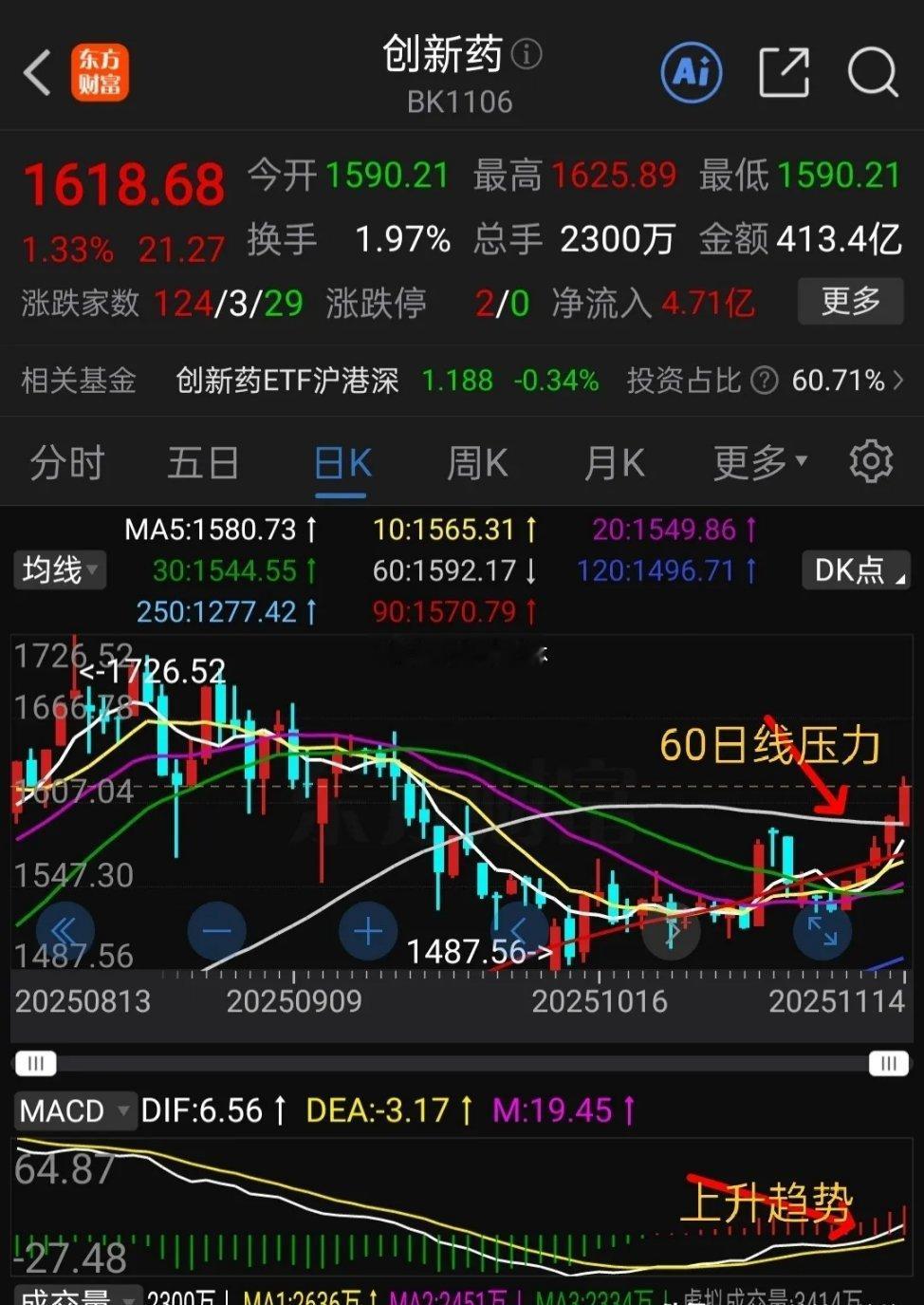 14盘中提示,创新药日线突破压力位,接下来如何操作? A股东财创新药日线走势如下图所示,macd趋势向上运行,目前已经突破了60日线压力位,后期将由弱变强,积极看多做多,不要被上涨甩下车,轻仓空仓的也可以适当加仓介入,稳健的等个回调,激进的追涨杀入。以上观点仅供参考不构成投资依据,点赞转发关注投资理财不迷路。
