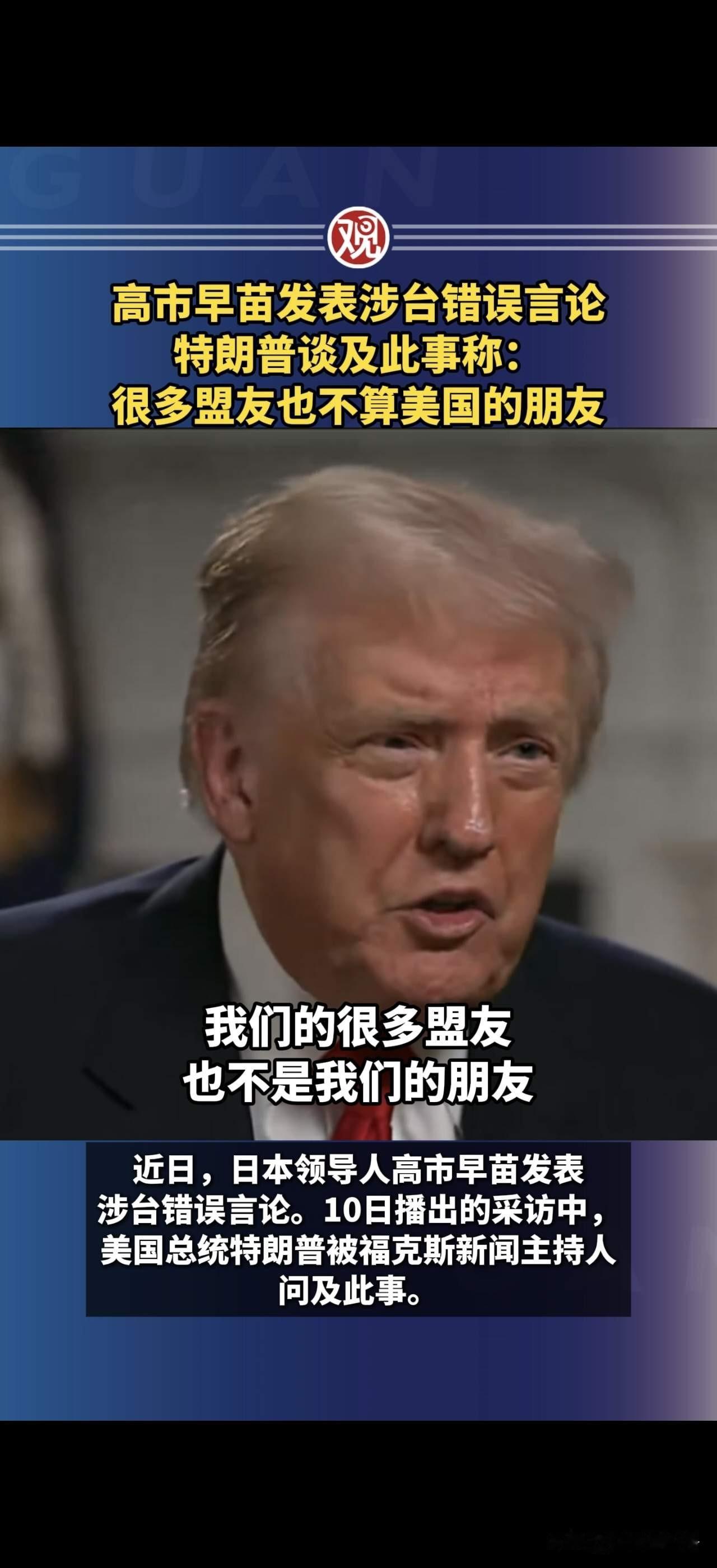 特朗普的意思很明确呀,他这就是明白的跟记者讲。 我跟高市早苗不熟,也算不上朋友。 近日高市早苗发表了很多涉台湾的错误言论。 福克斯新闻的主持人采访特朗普的时候,专门还问到了这件事。 你看看特朗普是怎么回答的? 特朗普明确表示,有的美国朋友他也不是朋友。 一句话就把高市早苗给怼死了。 美国不挺你,你还算个什么东西?