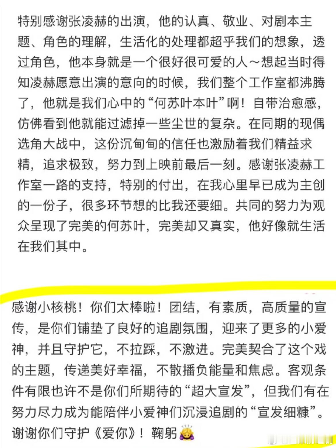 娱乐圈农夫与蛇的故事昨天又上演了,让我想起《爱你》制作人给张凌赫何苏叶及粉丝的感谢信,在我看剧期间偶尔吐槽女主时都会有剧粉甚至小核桃劝删,从传饼到播出每一天我都能看到男主粉丝对这部剧的爱护,不仅承担了拍摄期各个平台高赞路透、四百多万云包场、对冲女主黑水黑评、剧播期维护好了小爱神的美好追剧氛围。