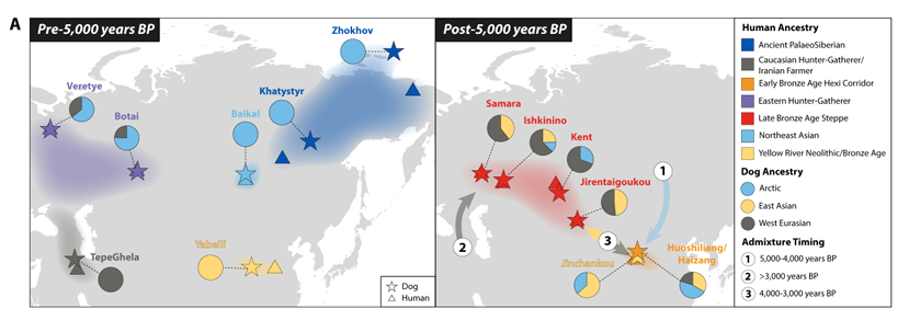 【科学家揭示家犬同人类近万年来的共迁移历史】记者从中国科学院昆明动物研究所获悉,该研究所王国栋研究员带领的国际合作团队,近日完成了17个古代家犬的基因组测序,其中包括来自河西走廊,新疆和内蒙古的14个中国古代家犬,这是科学家首次获得中国古代家犬基因组。加上团队取得的已发表古基因组数据,共获得了73个古代犬基因组,构建了从东亚到西欧亚草原的家犬血统演变图谱。相关研究成果北京时间11月14日在国际学术期刊《科学》发表。家犬是人类第一个驯化的动物,考古证据表明至少一万年前欧亚大陆多处均出现了犬的身影,其起源、扩散以及与人类迁徙的互动关系等科学问题对于理解动物驯化和人类文明传播都至关重要,因此长期受到学界的关注。早期基因组研究表明,家犬早在两万年前就已出现了血统分化并于欧亚大陆广泛扩散,但这些扩散是否与特定人类文化群体相关,以及家犬在古代社会中的角色,尚缺乏全面的基因组层面的研究。中国作为家犬的可能驯化中心和重要迁移节点,是研究以上问题的破题之处,但是缺少中国古代家犬的基因组数据成了最主要的限制。科研团队这项研究首先发现中国五千年前存在独特的家犬古老血统,随后数千年中国古代家犬逐渐出现来自西伯利亚和西方的古代家犬血统渗入,同时来自中国的古老东亚祖份也广泛扩散到了欧亚草原多处。团队通过与人类古基因组数据和证据对照,发现家犬数次渗入事件与人类的多次迁徙高度重合。如东西伯利亚早全新世家犬谱系与同时期人类谱系的分布高度吻合。此外,欧亚草原地区家犬中西方祖分的增加也与古人类迁移历史相吻合,具体而言我们发现欧亚草原前期的新石器时代家犬和东欧狩猎采集人群相关,后期的青铜时代家犬和伊朗农耕人群和高加索狩猎采集者相关。通过对比研究和多方证据的互相验证,团队最终证明,近一万年来家犬与人类存在密切共迁移,不同时期不同人群携带各自的犬通过欧亚草原和古丝绸之路等路线进行跨洲的大迁移,这表明了家犬与人的无与伦比亲密关系,从欧亚草原到河西走廊的家犬万年来血统流动,也映射出古代文明的互联互通。据了解,这一基于古基因组分析的方法将扩展到其他家养动物,如马牛羊等家畜,进一步揭示它们在人类历史中的作用,发掘国内家养动物丰富的遗传资源与潜力,为动物资源的开发利用提供更坚实的理论基础。