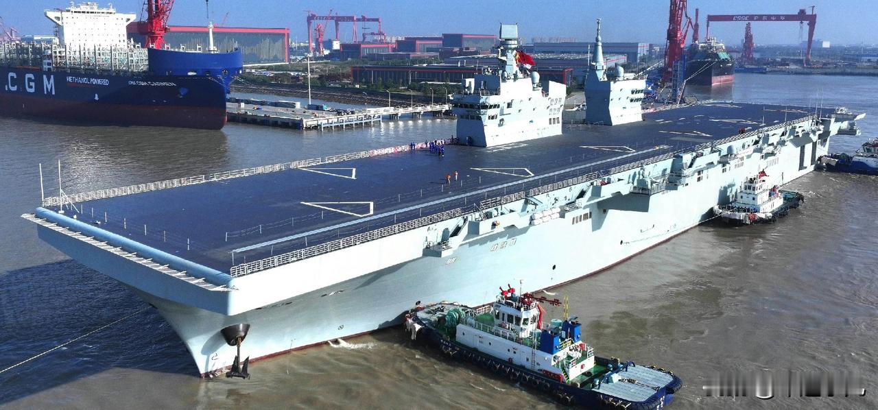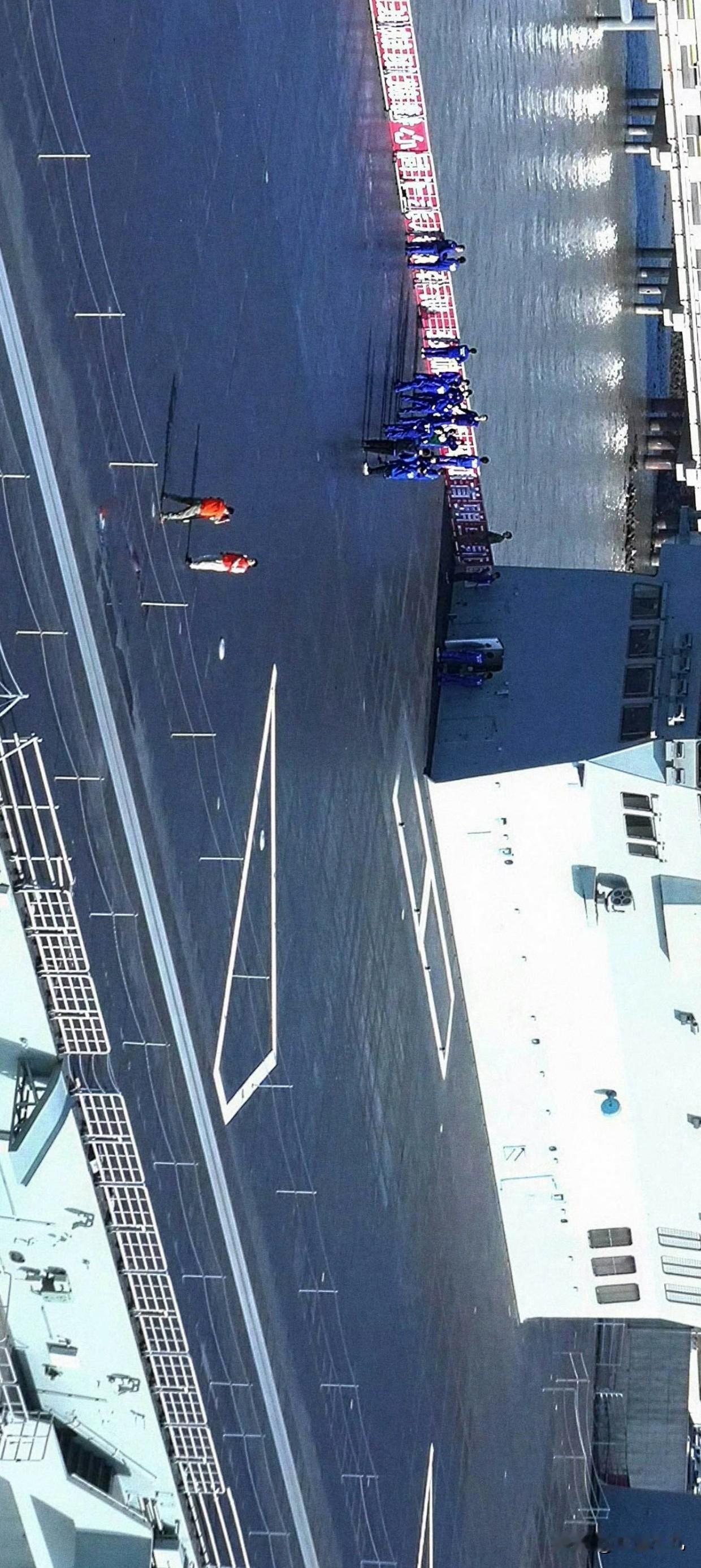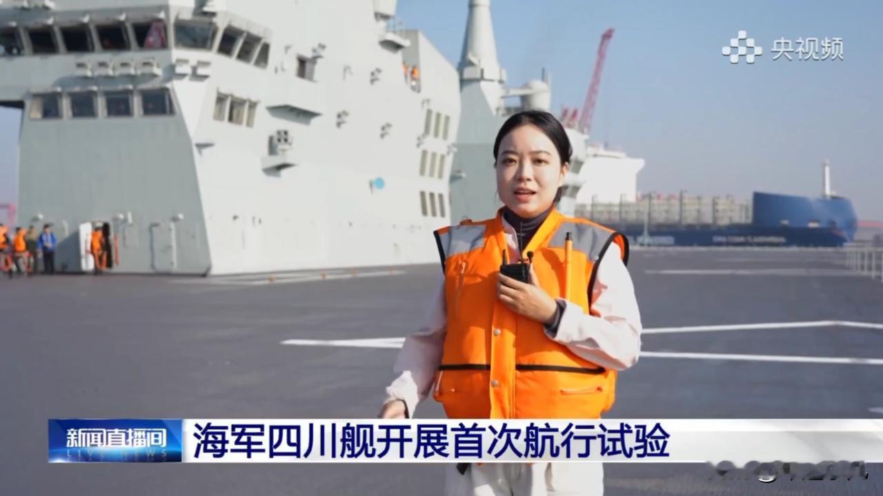 076无人机航母,真的太大了呀,快找一找记者在哪里? 076,突然开始了首次海试,各种视角和画面也都公开了,在央媒采访的镜头里,记者站在076甲板上进行播报,看起来舰岛就在旁边,感觉离得很近,但是,当航拍视角公开,才知道,四川舰,甲板太宽阔了,这一张照片正好抓到到,记者正在甲板上报道,看起来,记者视觉上非常渺小,就像一只小🐜似的,不得不说,甲板太大了! 大家觉得怎么样,评论区说说你的看法!076小航母