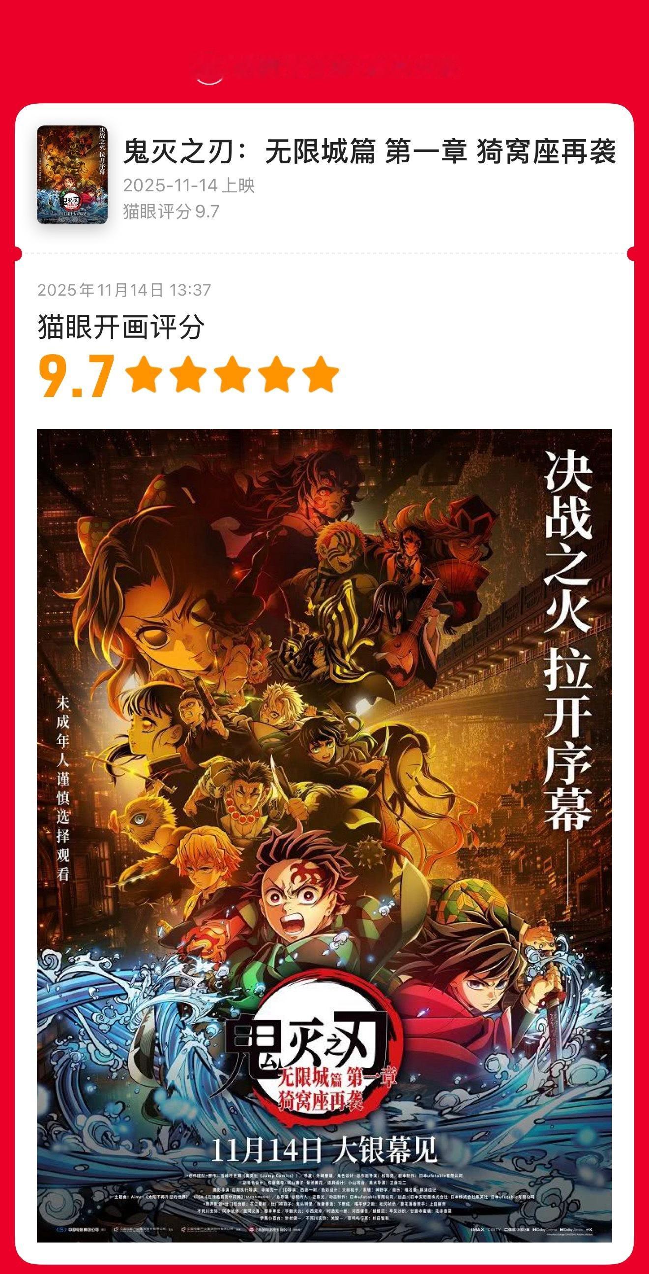 据猫眼专业版数据,电影 《鬼灭之刃:无限城篇 第一章 猗窝座再袭》猫眼开画评分9