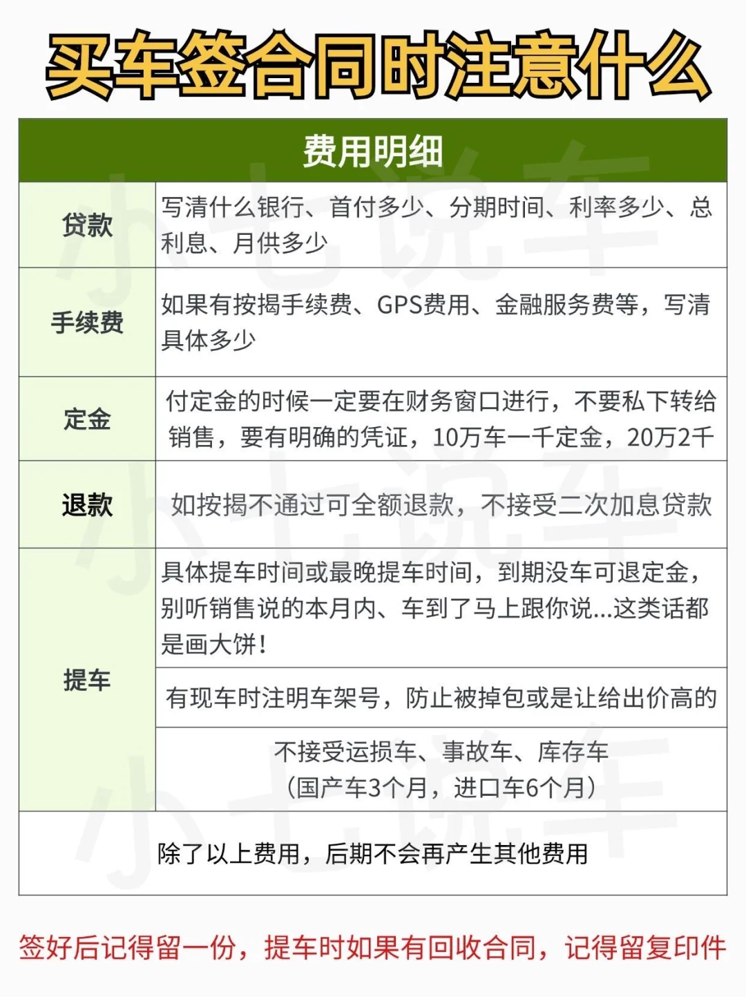 ✅签合同时注明车型的具体信息、所有的费用明细、按揭不通过拒绝二次加息贷款、除以上费用后期不会再产生其他费用!