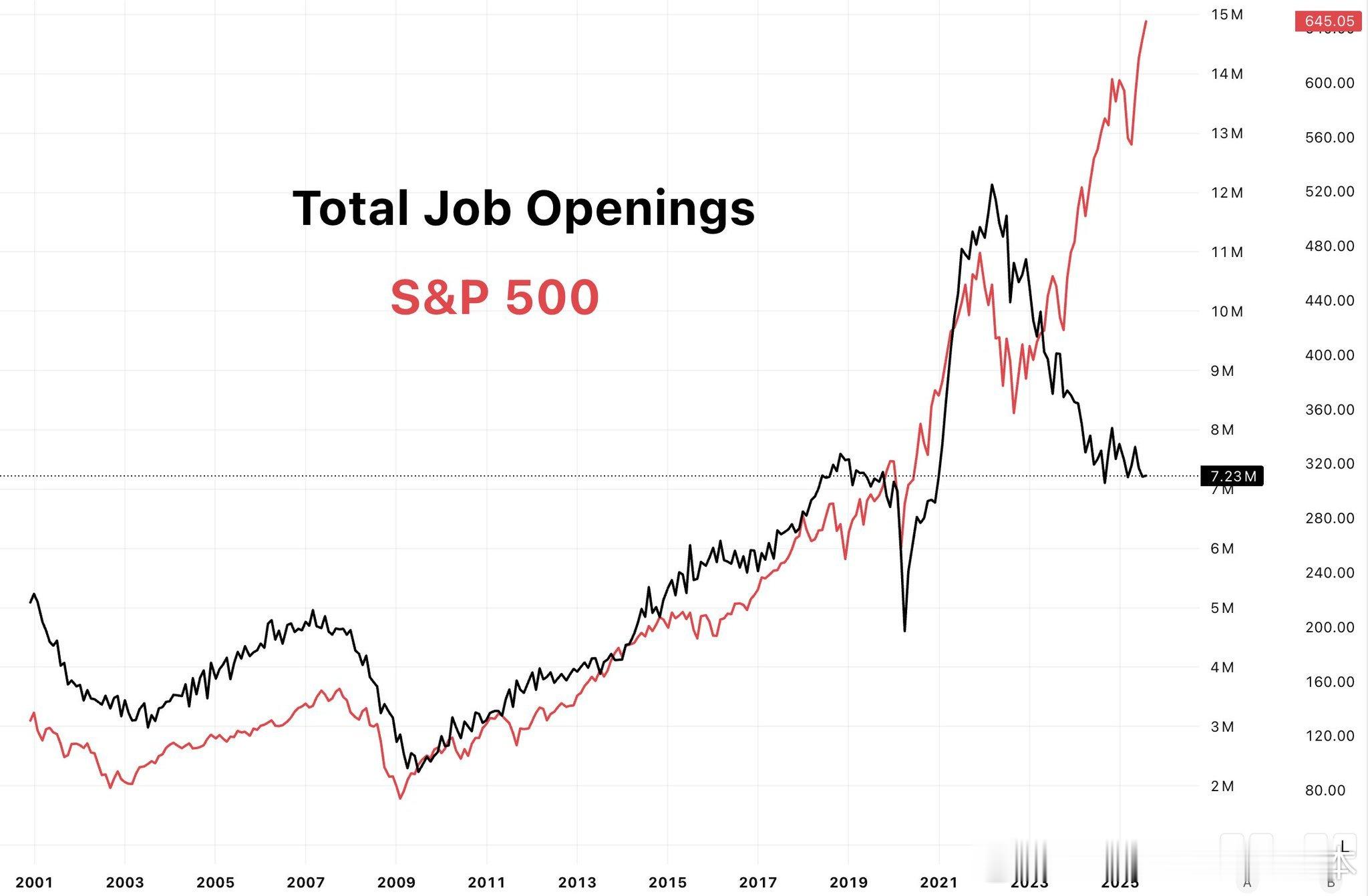 【黄金时代】续前文,虽然万斯如此说,但事实是,自从gpt推出以来的2022年,到现在为止,虽然S&P500指数一路走高,但是开放工作岗位数量断崖式下跌,直到2025年才部分止住颓势。