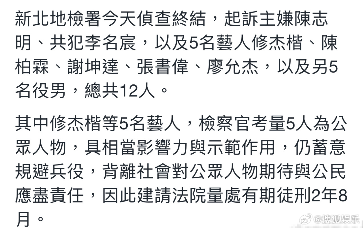 陈柏霖修杰楷等人被求刑两年八个月2025年10月21日,中国台湾检警针对“闪兵案”展开第三波行动,修杰楷、陈柏霖、坤达等人因涉嫌通过伪造病历等方式逃避兵役被拘提到案。 日前,上述涉案人员被检方起诉,求刑2年8个月……