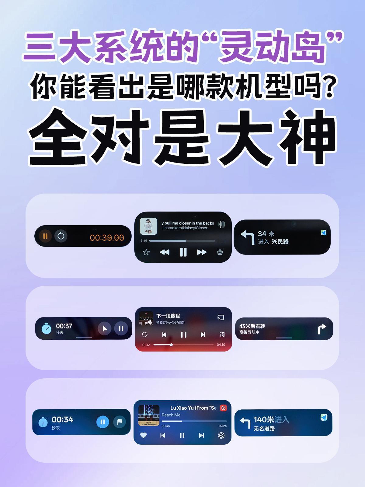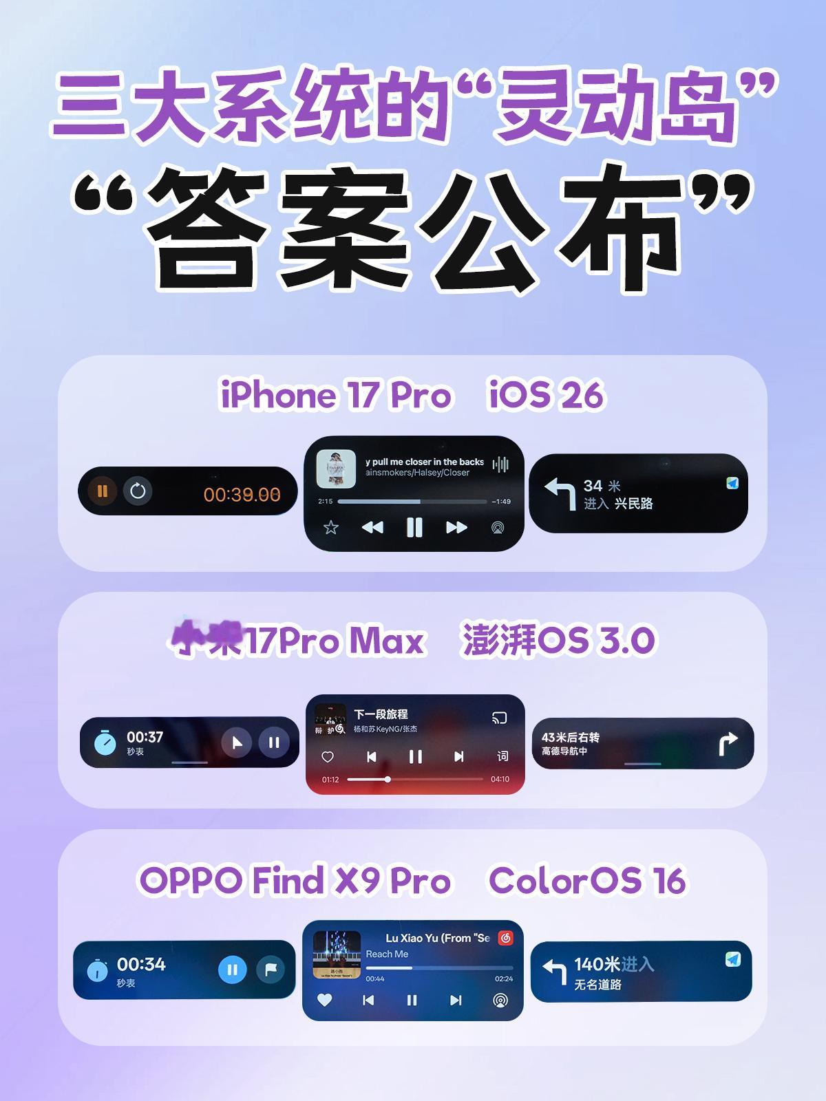 你来,你也猜不中第三个 👉🏻iPhone 17 Pro iOS26系统的灵动岛 👉🏻小米17 Pro Max澎湃OS3的超级岛 👉🏻OPPO Find X9 Pro ColorOS 16的流体云 只知道iOS26名字跳了很多级 ColorOS16流畅度又升级 流体云能触发一百多个效果很卷🤔 但是你能分辨出来吗? 快来猜一猜,全猜对是大神……