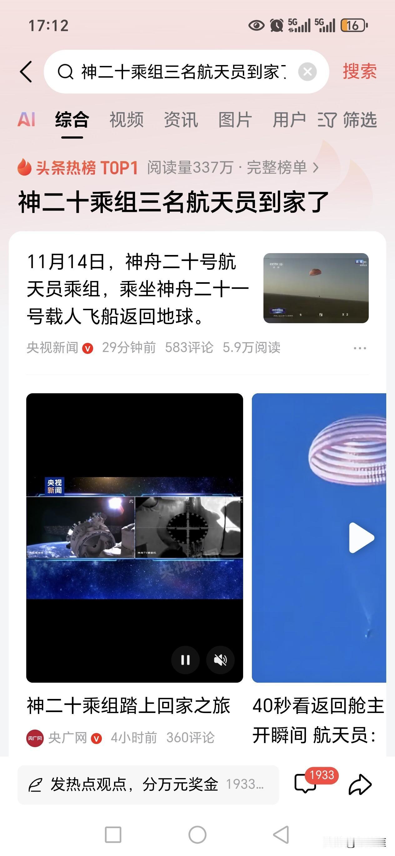 举国欢庆!神舟二十号飞船三名航天员已经于14日下午安全回家!!! 中华人民共和国此时此刻隆重向全球宣布几件大事: 第一件,中国对航天员的生命安全的看重程度属于最高等级。 第二件,我们的二十号飞船航天员乘组已经安全回到家。 第三件,中国航天科技整体实力属于世界顶级水平。 祝福我们的航天员平安归来! 祝愿我们的祖国繁荣富强!