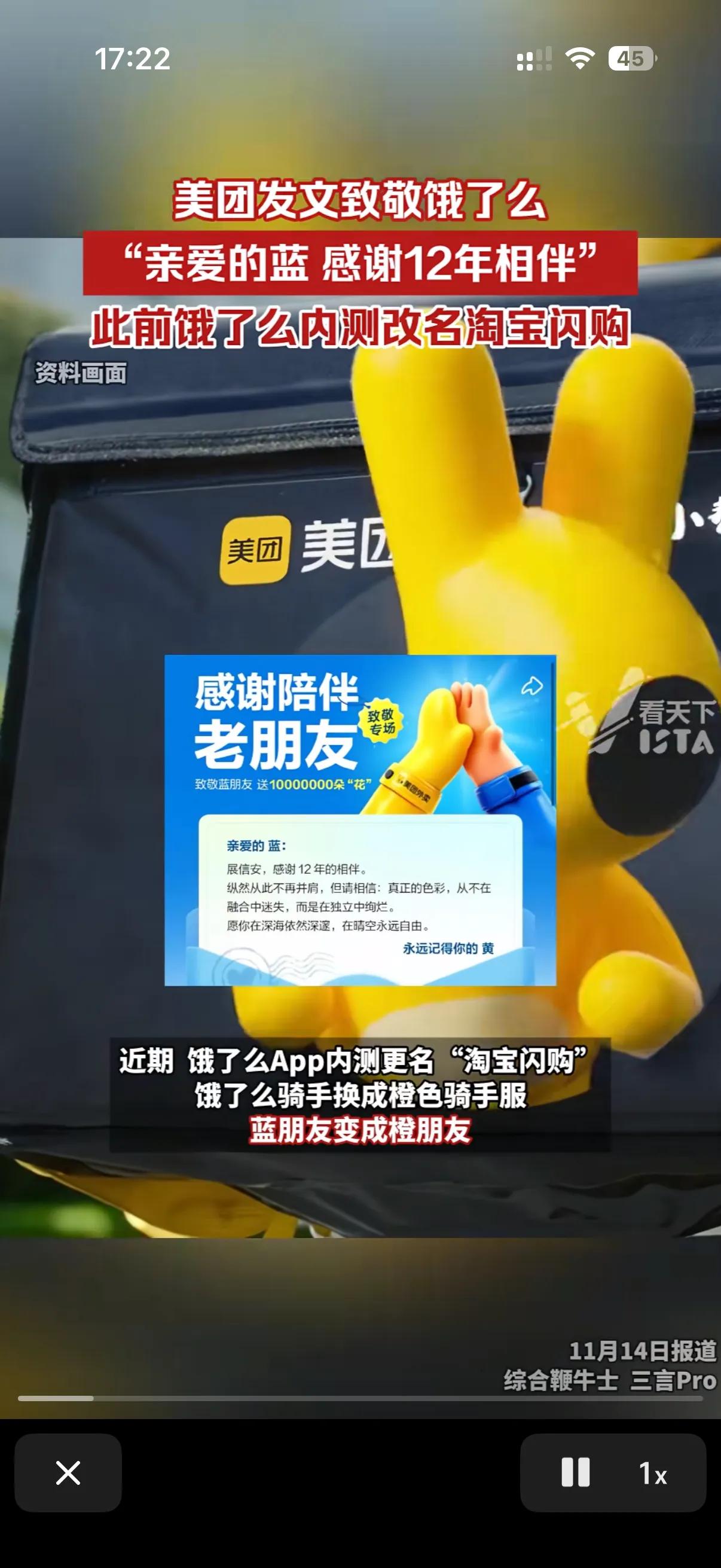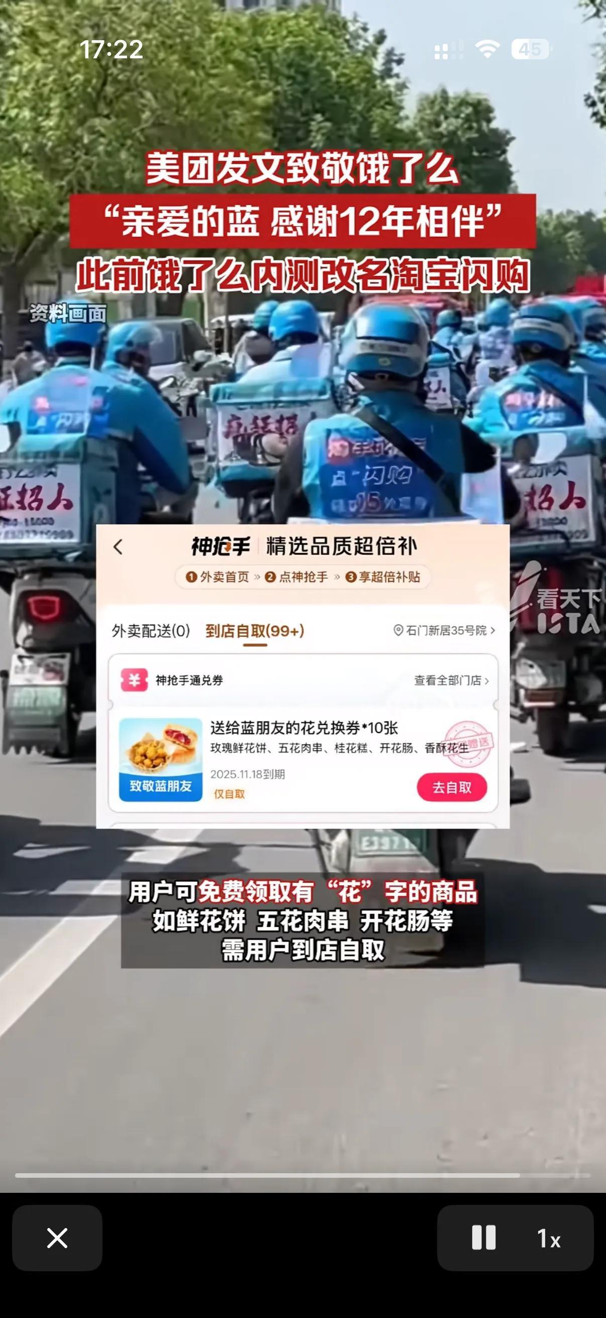 外卖江湖从此再无饿了么! 谁能想到曾经和美团大战外卖江湖12年的小蓝饿了么会是最先消失的! 现在饿了么改名淘宝闪购,从此外卖江湖只会流传饿了么的传说! 美团为了饿了么改名淘宝闪购缅怀饿了么做出送外卖的活动,只要去外卖首页下方选择参加送花给饿了么就可以领取一份外卖,只是需要到店自取! 淘宝闪购个骑士推出马到橙功的跑单活动!