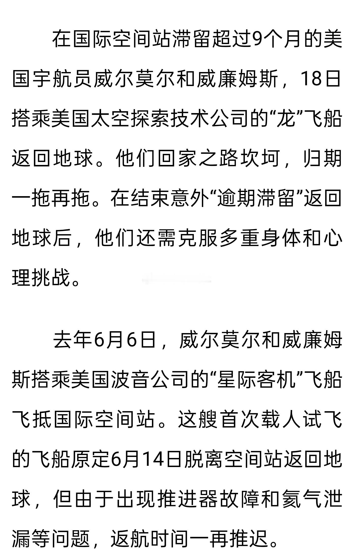 总结一下:神舟二十号乘组今天乘坐神舟二十一号飞船返回东风着陆场,后续将很快发射神舟二十二号飞船。这也是中国载人航天历史上首次启用备份飞船。对比一下之前滞留国际空间站的美国航天员,原本8天的“短差”拖成了9个多月的太空“超长加班”,最后还是马斯克出手才把他们接回来。