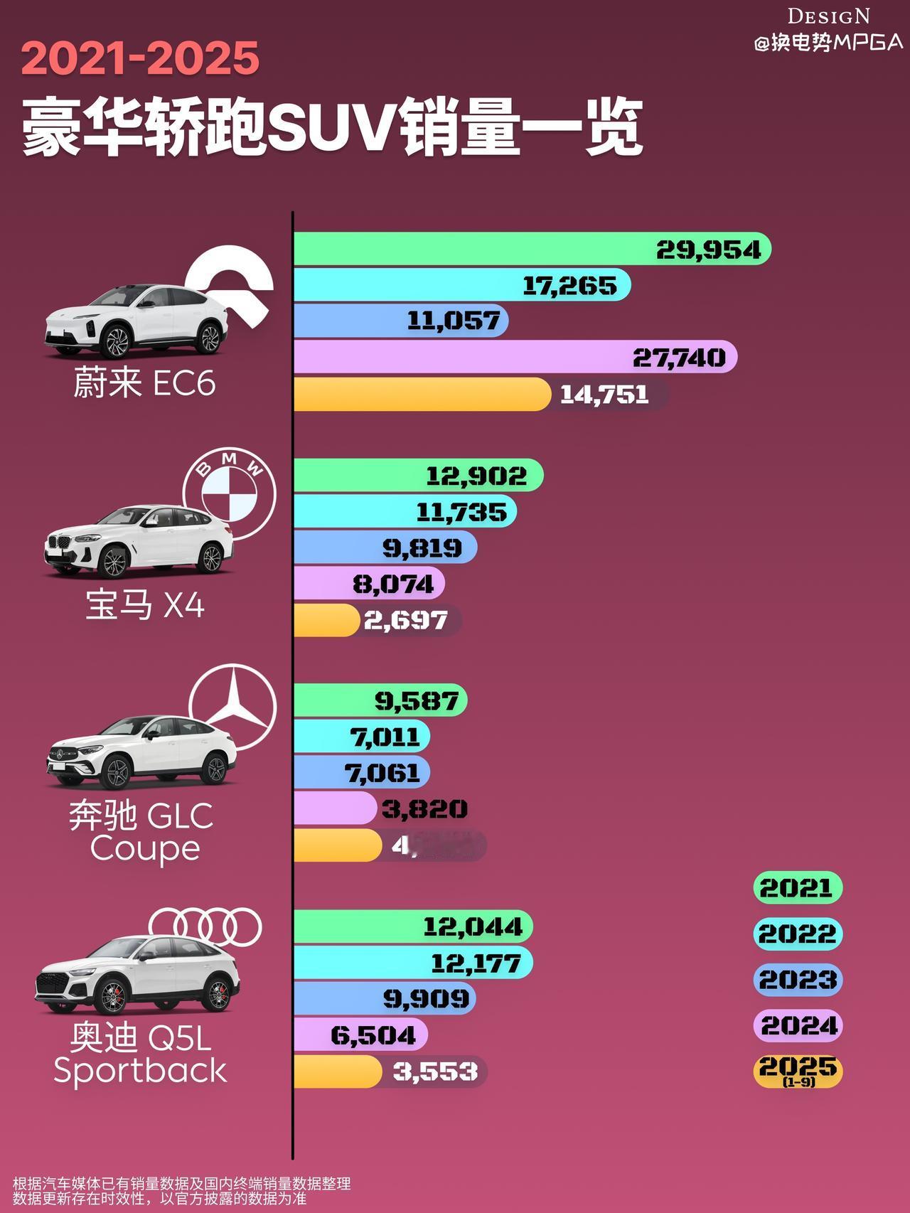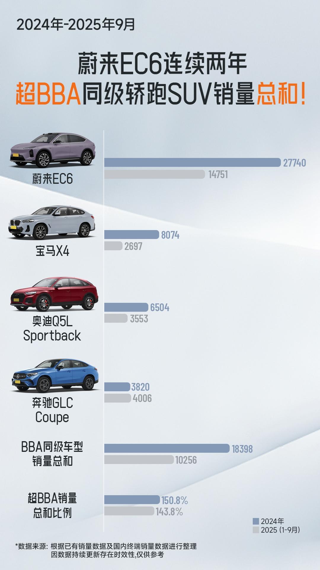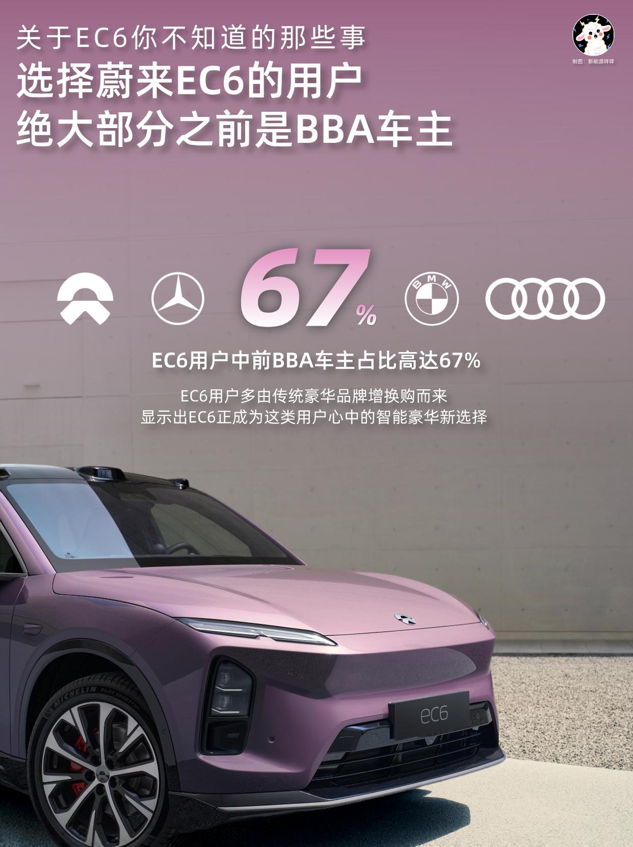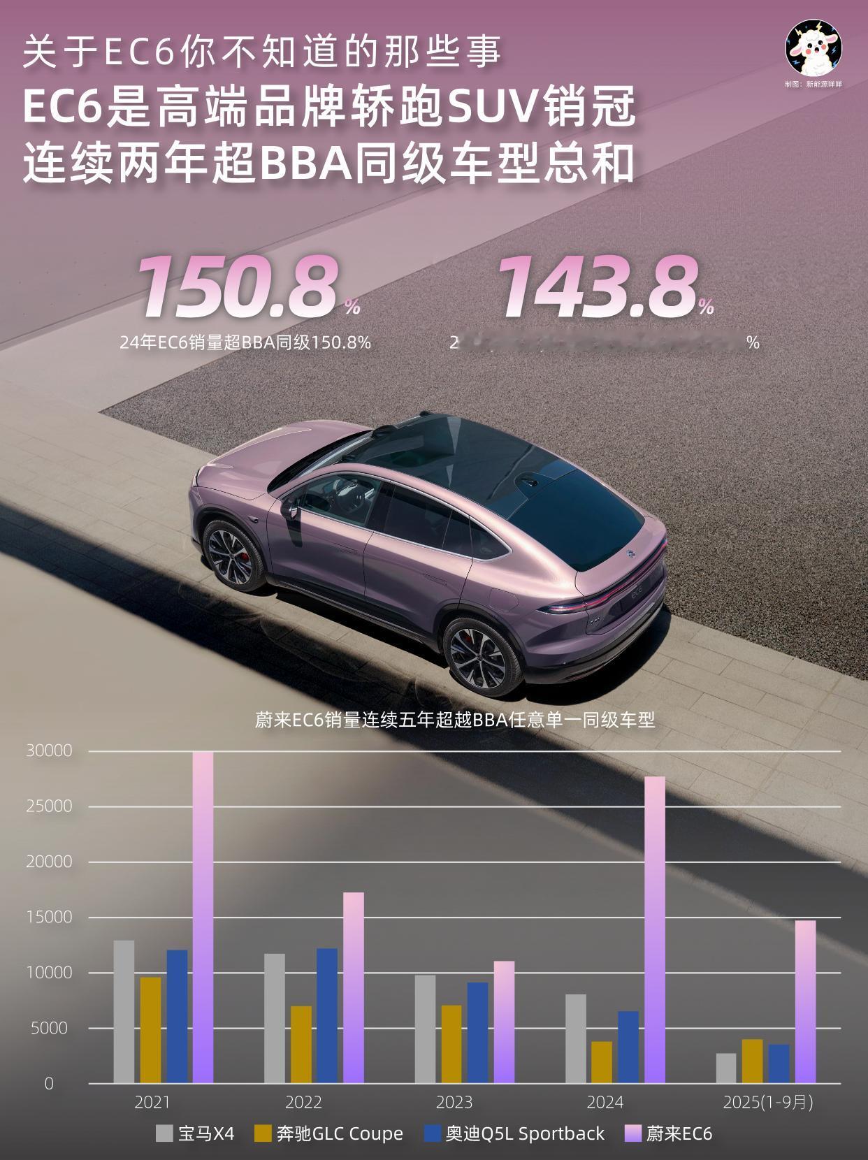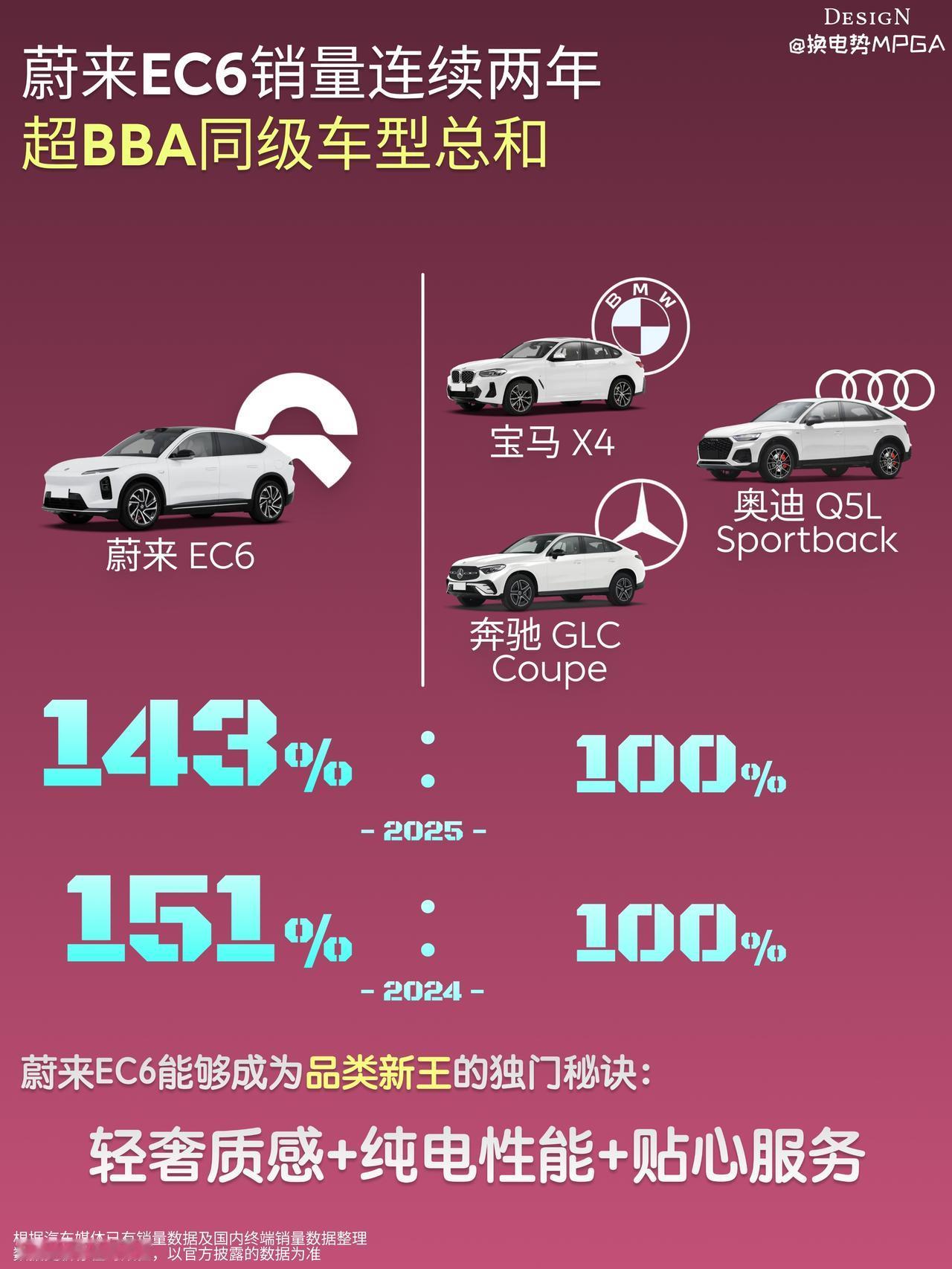 【从开创者到引领者,蔚来EC6是无可争议的豪华轿跑SUV品类之王】 蔚来EC6连续五年销量力压BBA同级轿跑SUV,自2024年起更连续两年单车销量超过BBA同级车型销量总和。与此同时,蔚来EC6也是中国首个突破10万交付大关的纯电轿跑SUV车型。 作为中国纯电市场首个轿跑SUV形态的车型,蔚来EC6开创了豪华纯电轿跑SUV的全新赛道。在EC6问世之前,纯电SUV普遍以传统造型为主,EC6以流畅、动感的轿跑设计引领潮流,深刻影响了多个品牌的后续设计思路。时至今日,包括智界R7、小米YU7等在内的热门车型,仍在延续这一路径,继续壮大轿跑SUV细分市场。 蔚来EC6打破BBA轿跑SUV的“高溢价”模式,充分满足了新时代下用户对个性化产品的追求。过去由BBA主导的豪华轿跑SUV品类,通过刻意限制供货量、宣传进口“血统”等手段获得更高溢价,抑制了用户对个性化产品的追求。蔚来通过对个性化需求的精准把握和对轿跑SUV理解,基于智能电动车的先天优势打造EC6,挤掉BBA不合理的溢价“水分”,让用户体验到更纯粹的实用和情绪价值,叠加蔚来独有的服务、社区优势,让用户在智能电动时代的需求获得充分满足。
