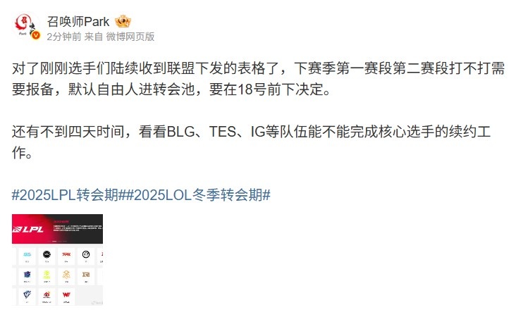 刚刚选手们陆续收到联盟下发的表格了,下赛季第一赛段第二赛段打不打需要报备,默认自由人进转会池,要在18号前下决定。