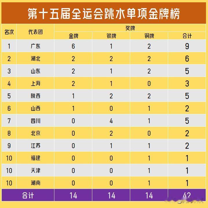【第十五届全运会跳水单项金牌榜!广东一骑绝尘,鄂鲁沪列二三四!】 全运会项目多,时间跨度长,有些项目已经全部结束,还有这项目至今尚未开赛。 跳水项目包含的14个小项已全部收官,广东队优势明显,以6金1银2铜领跑。