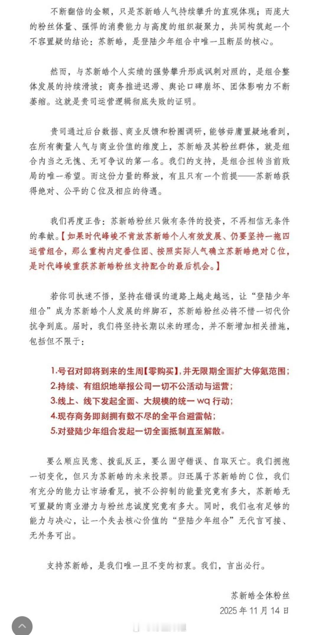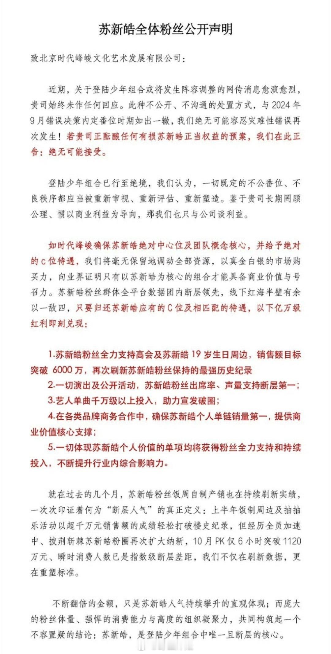 苏新皓的粉丝发声明了,要求时代峰峻按照实际人气确立苏新皓绝对C位,不然让登陆少年名存实亡,走向灭亡,这口气是真的不小啊