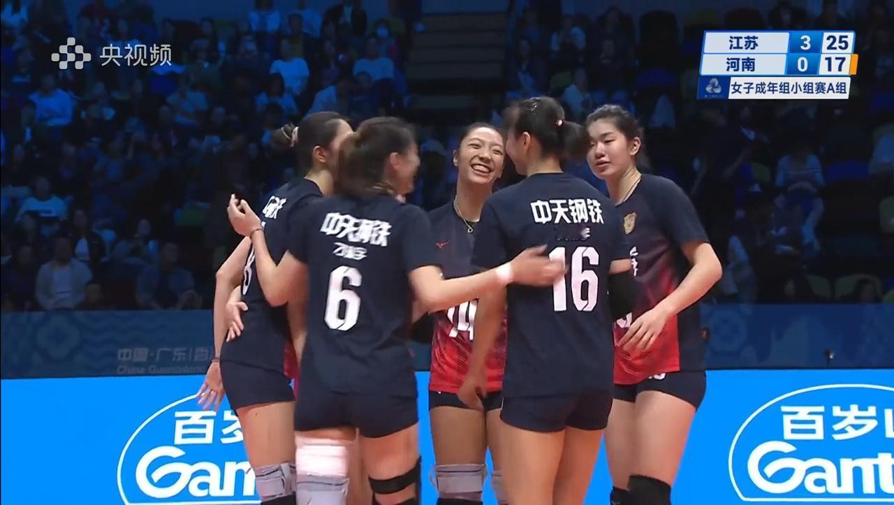 全运会女排小组赛, 江苏3-0河南, 打破河南的不败金身, 朱婷,张常宁,吴梦洁,龚翔宇, 刁琳宇等同场竞技,各为其主, 第一局落败之后, 河南女排选择了战略性放弃, 把朱婷,放到了板凳上, 采取锻炼新人的模式, 这场比赛, 江苏女篮出力的只有吴梦洁, 龚翔宇啥的,估计都没出汗, 阵容齐整的江苏女排, 趁着李盈盈伤病, 今年是奔着金牌来的。