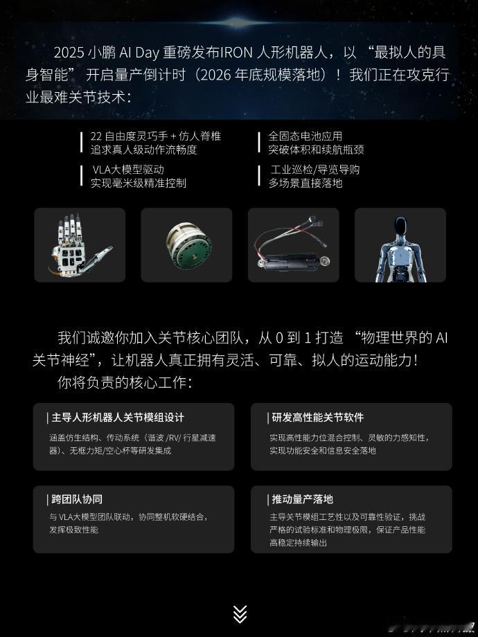 小鹏 旗下机器人项目今日发布招聘公告:面向“关节运动控制算法工程师”“机器人驱动系统研发工程师”等岗位,主要参与“陆地+空中”未来交通形态的机器人平台。项目定位大胆,旨在打造下一代智能代步与服务机器人。💬如果你有机器人相关背景,这波招人你考虑吗?你觉得未来机器人最需要突破的是关节灵活度、续航还是智能感知?评论区聊聊!