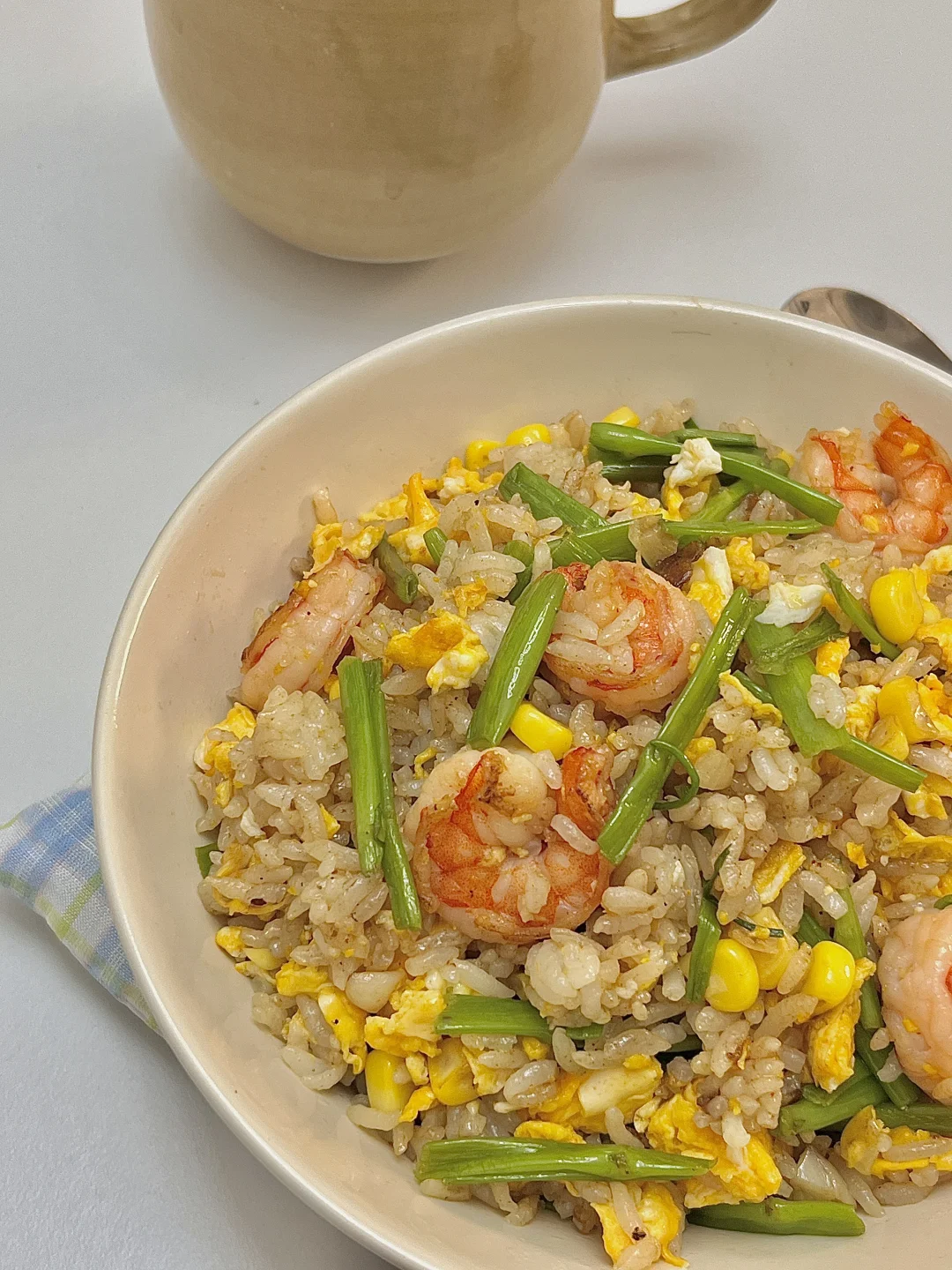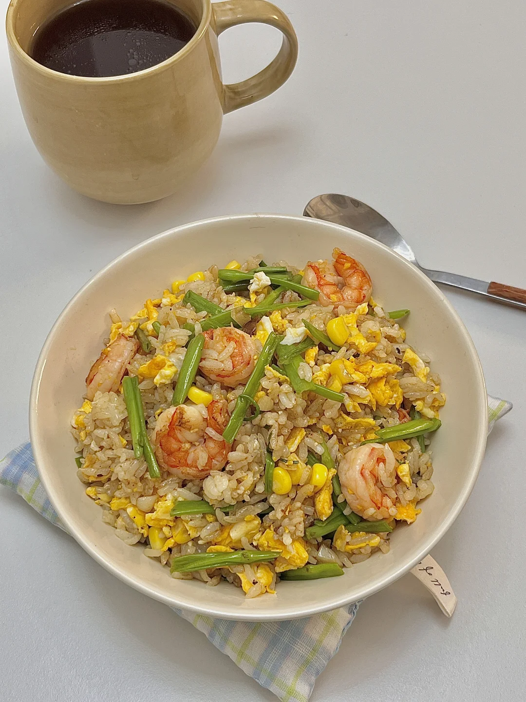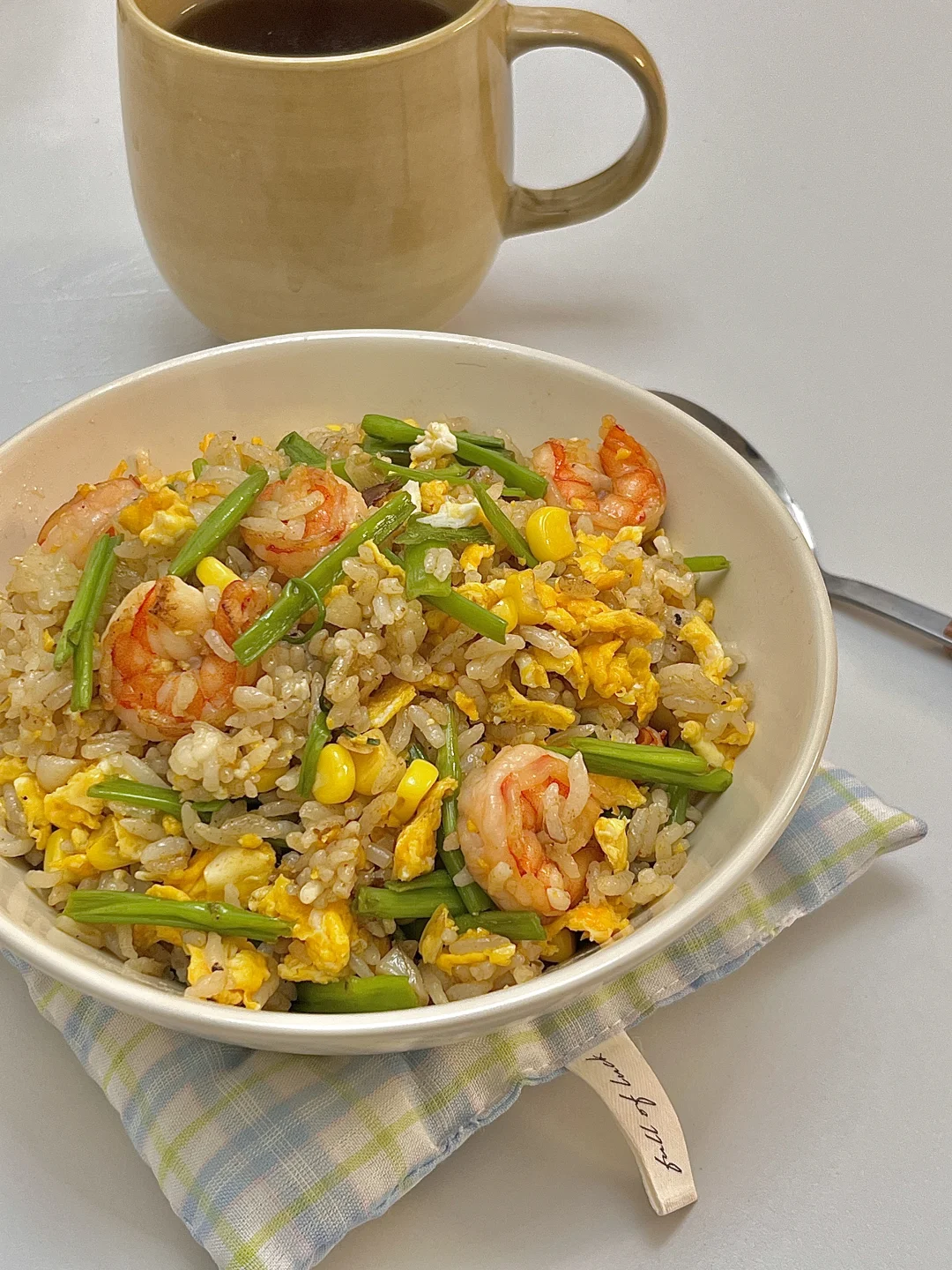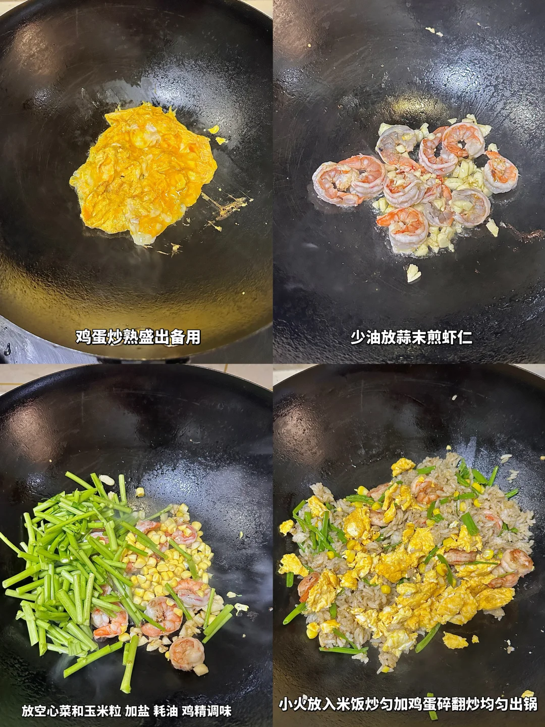 今天吃的空心菜虾仁炒饭 无需过多的调料 新鲜的虾仁与清爽的空心菜作搭配 一整个清新爽口,味道真的赞👍🏻低脂高蛋白的一餐! 🥬食材:虾仁,空心菜,鸡蛋,玉米粒,蒜末 👩🏻🍳做法 1️⃣两个鸡蛋炒碎盛出备用 2️⃣少许油放虾仁煎熟 放蒜末炒香 加空心菜梗和玉米粒翻炒 加耗油 盐 鸡精调味 3️⃣小火加剩米饭炒散 放鸡蛋碎翻炒均匀出锅