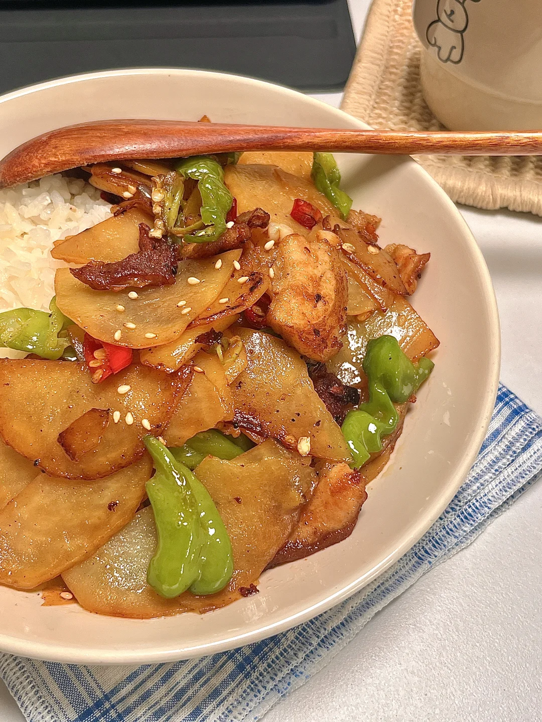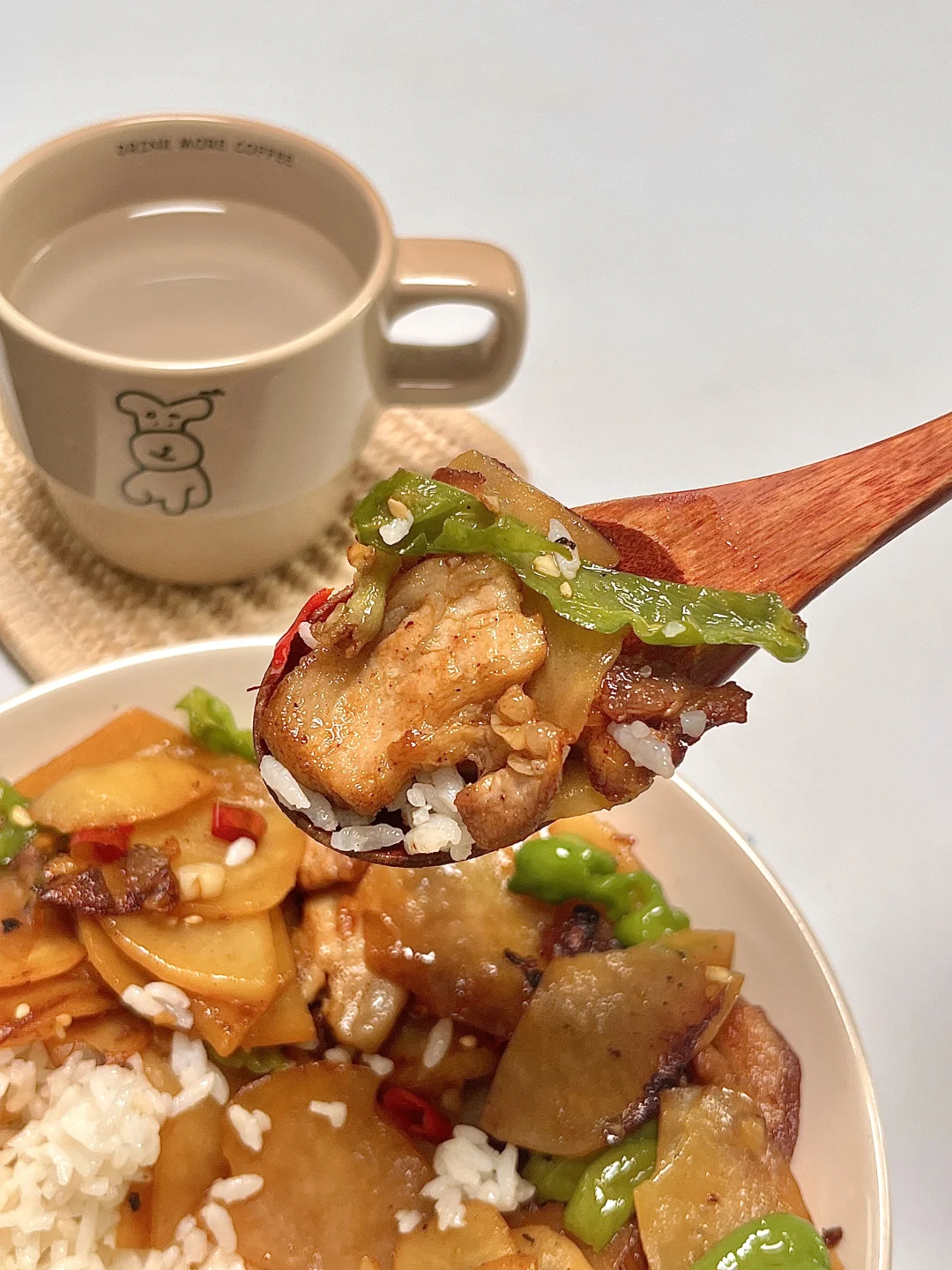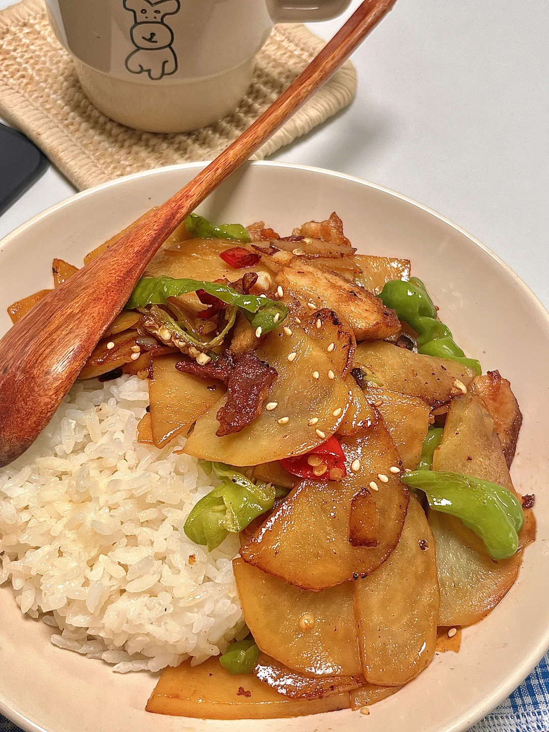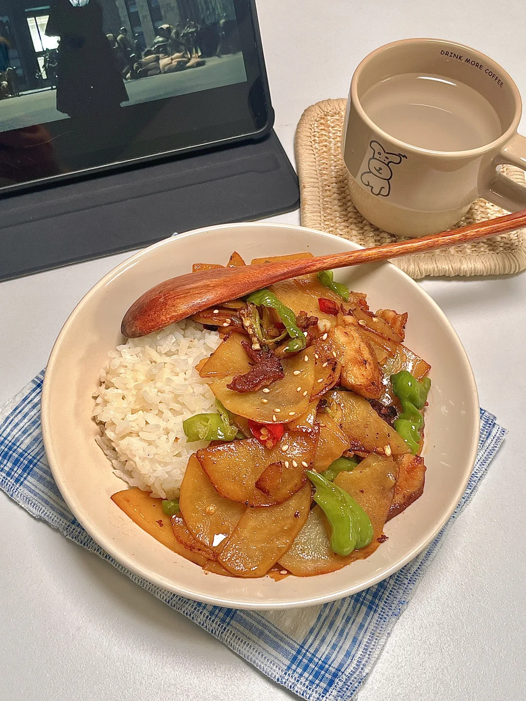 我逐帧复刻一饭封神同款 🍴今日份一人食: 五花肉土豆片盖饭 椰子水 . 土豆片炒五花肉没人不爱吃吧,我觉的土豆🥔怎么做都很好吃😋切薄薄的土豆片,配上青椒🫑和焦香的五花肉 巨下饭🍚爱吃的宝一定要去试试呀✌🏻