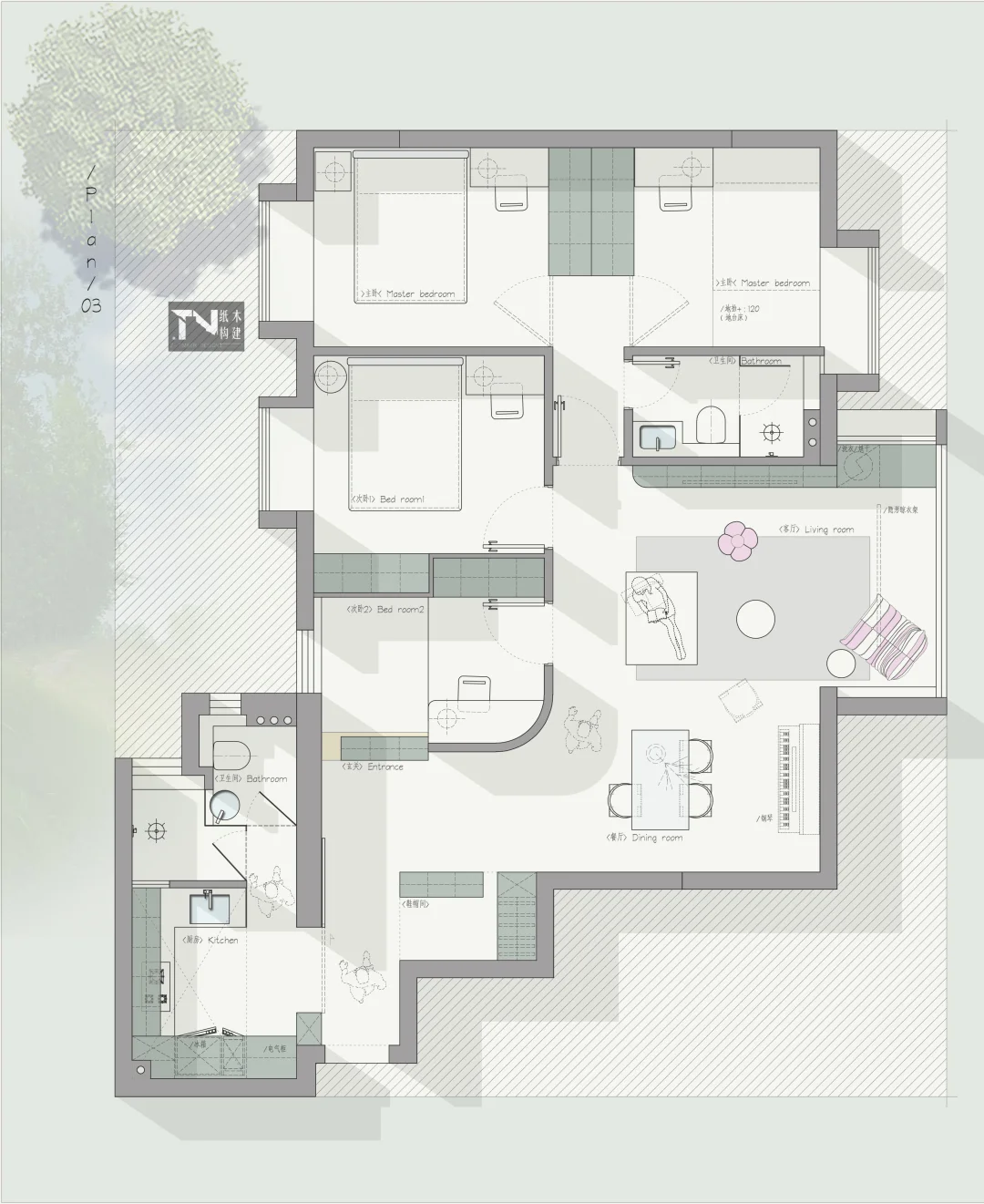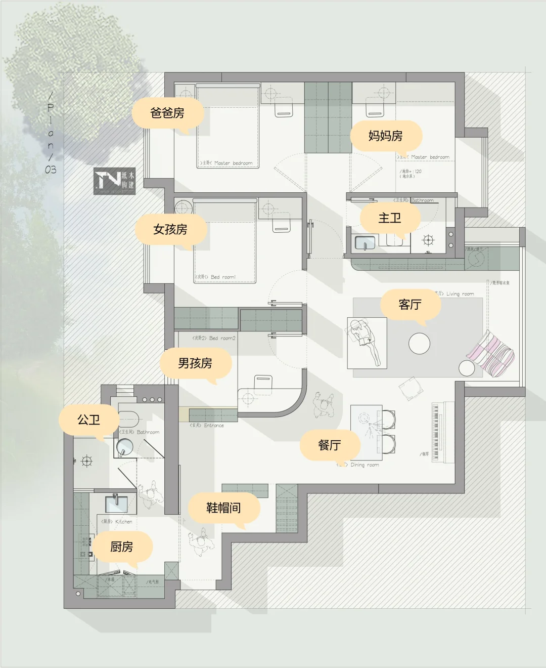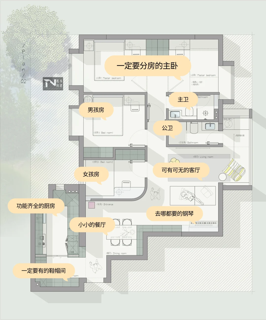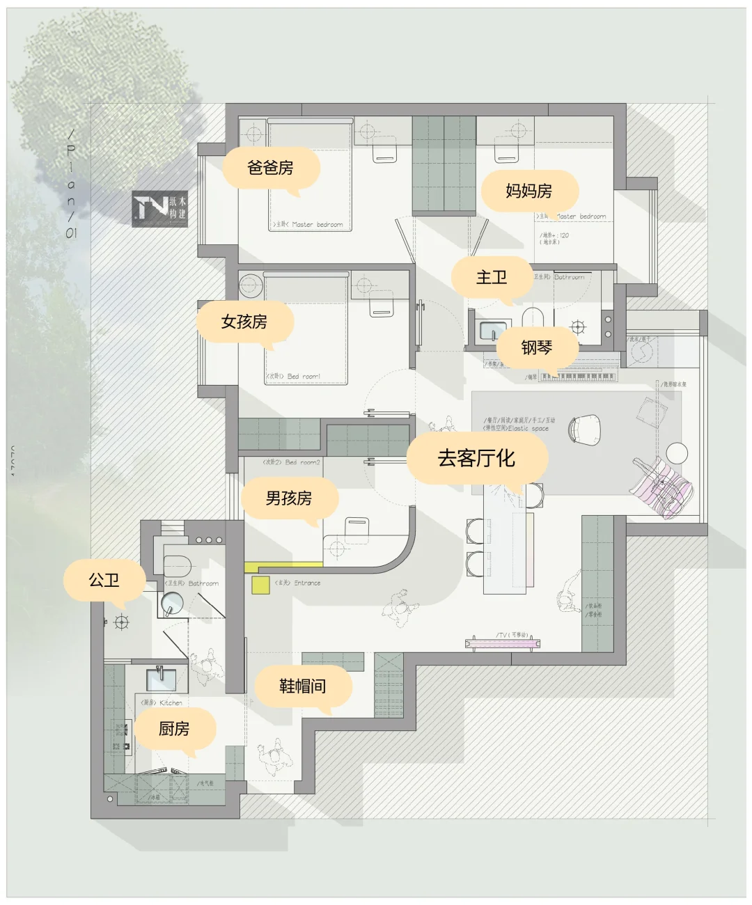 设计需求: 一家四口👨👩👧👦 1、主卧一定要分房,爸爸是医生,经常上夜班,不想打扰妈妈睡眠 2、加的卧室是哥哥房间 3、妹妹卧室 4、每个房间都要书桌 5、客厅可以不用,一般都是会自己房间看书学习 6、一定要有钢琴位置
