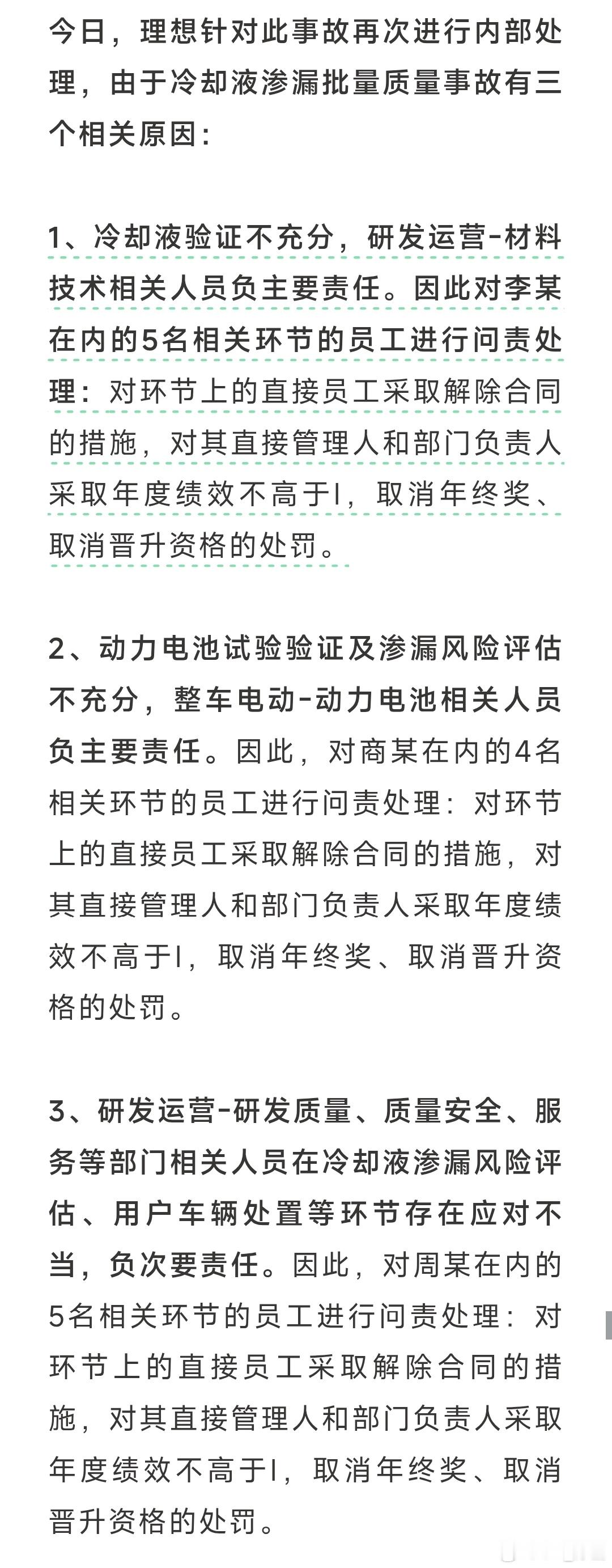 21世纪经济报道独家:理想就MEGA起火事件问责14人,就L系列25款部分车辆下摆臂异响问责4人,部分员工被解除合同。出这么大事,肯定是有人犯错,出事必须有人负责,这是对的。但是我觉得更重要的是,后续的流程上、管理上如何防止人犯这么大的错。