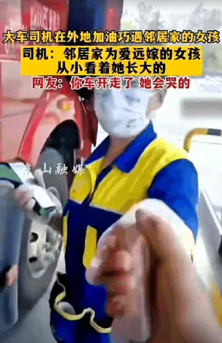 河南新乡的大车司机黄大哥,在湖北的加油站,看见加油女工似曾相识 可她戴着蓝色口罩,只露双眼睛,黄大哥没敢认,只笑着打招呼 女工手里的油枪顿了下,抬头看他,声音里带着点惊喜:“叔,你也是河南的?”这一开口,地道的豫北乡音,一下就撞进黄大哥心里!等加完油,女工大概是觉得乡音亲,主动把口罩往下一扯,黄大哥凑近一看,:“娟娟!你是老王家的娟娟吧?我是你隔壁的黄叔啊!” 娟娟盯着他,突然眼圈就红了:“黄叔?真的是你!”这姑娘,正是黄大哥斜对门的邻居闺女。 当年娟娟才19岁,要嫁湖北的对象,这一去,就是整整十六年。黄大哥记得,娟娟走那年,自己还年轻,如今两鬓都白了,娟娟也从扎羊角辫的丫头,成了加油站里沉稳的大姐。 黄大哥激动得直搓手,转身往车上跑,从后备厢翻出个布包,里面是他从老家带的苹果 他抓出两个塞给娟娟:“拿着,咱老家的苹果,叔给你求个平平安安!”娟娟攥着苹果,手都在抖,拉着黄大哥的手,嘴唇动了好几下,话没说出来,眼泪先砸在了手背上。 没敢多耽搁,黄大哥还要赶路程,上车前反复叮嘱:“照顾好自己,有空回河南看看,你爸妈总念叨你。”车子发动后,他从后视镜里瞅着,娟娟站在加油站门口,右手挥得老高,眼泪顺着脸颊往下淌,直到车子开出去老远,她还站在原地没动,黄大哥自己的眼圈,也悄悄红了。 有人说这是他乡遇故知,可我觉得,这哪是故知啊,这分明是远嫁的闺女,在千里之外撞上了娘家人! 那些为爱远走的姑娘,嘴上说着他乡是故乡,可心里头,哪能不惦记老家的烟火气?一句乡音,一个带着老家味道的苹果,就足以戳中最软的地方——娘家人的牵挂从不是空话,不管过了多少年、走了多远,总有人记得你小时候的模样,把你的平安,刻在心里。