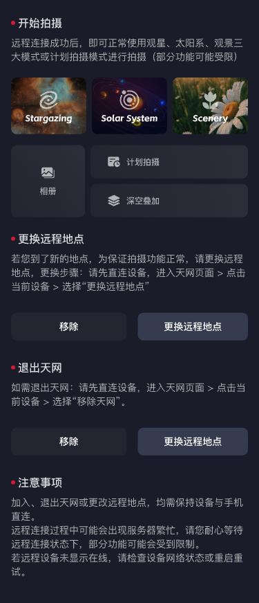 Seestar远程控制功能即将更新。新增天网功能(支持远程控制Seestar) 它让你可以远程连接到Seestar设备 实现异地控制与拍摄 不在现场 也能看见星空 今晚六点以后更新Seestar APP星友们可以试试哦