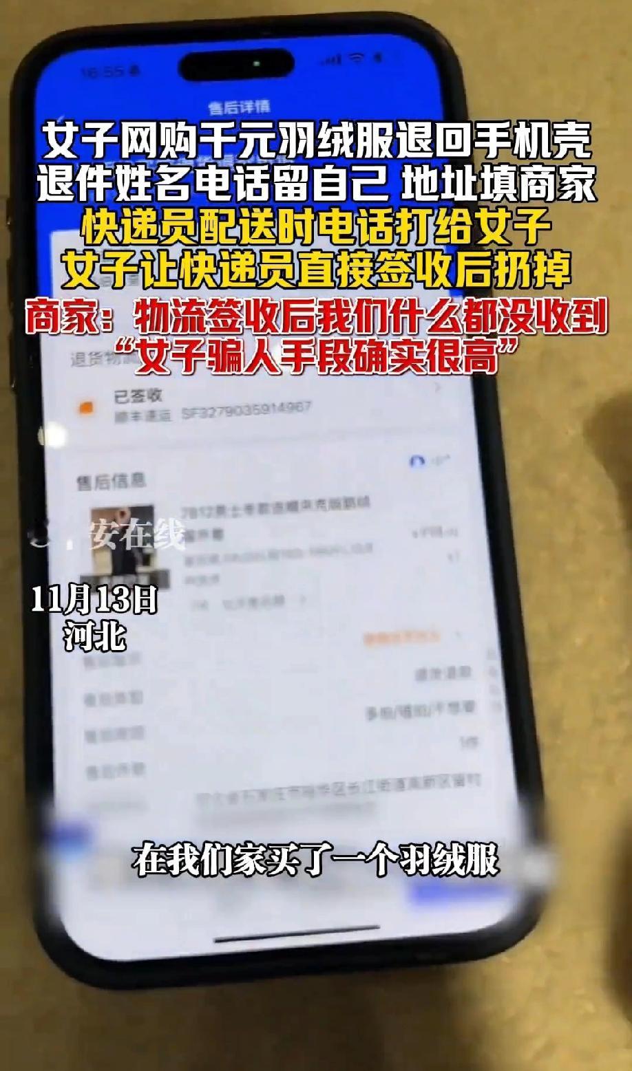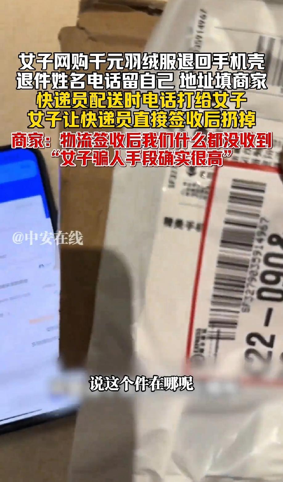 河北,一女子网购了一件1000块的羽绒服,收到货后却以“拍错了”为由申请退货退款,商家看到后没多想就同意了,然而,当商家看到包裹已签收的记录准备退款时,却翻来覆去也找不到那件羽绒服,结果商家一问快递员直接傻眼了:一千块羽绒服居然成了一个几块钱手机壳。 (来源:中安在线) 这到底是怎么回事呢?原来,云南的张女士在网上看到了一件价值1000元的羽绒服,毫不犹豫地就下单了,但是收到货没几天,张女士就以“拍错了”为由申请了退款。 对于商家来说,买家退货退款都是很正常的事,于是当即就同意了张女士的请求。 可谁也没想到的是,张女士根本就没有把羽绒服退回去,而是寄回了一个几块钱的手机壳。 张女士是怎么做的呢?就连商家都表示手段太高明了。 原来,张女士退货的时候,地址填的是商家的地址,但是姓名和电话却是留自己的。 于是,等快递员拿着这个装着手机壳的包裹,去到商家仓库送货时,播通了张女士的电话,张女士接到电话后,先询问了快递员是不是一个手机壳,得到答案后就轻描淡写的让快递员帮忙签收一下,然后直接把包裹扔了。 当时,快递员觉得一个旧手机壳也不值什么钱,就按照张女士的要求签收了,但是快递员并没有把包裹扔了,只是暂时收了起来。 张女士以为这样做就万事大吉了,却没想到快递员居然还把他们的通话录音了。 当商家看到包裹签收了,却怎么也找不到羽绒服,就主动问快递员包裹去哪了。 于是,快递员把前因后果说了,商家一听羽绒服变手机壳,简直不敢相信。不得不说,这手段不是一般人能想出来的。 目前,商家已经申请平台介入,暂停了退款流程,就等着处理结果了。 看到这个事件,不仅商家不敢相信,网友们更是不敢相信。 有网友说,这分明就是诈骗了,胆子也太大了,还自以为商家不会发现。 还有人猜测,张女士肯定不是第一次这么干了,只是这次不小心被抓包了,要是快递员没留下证据,商家和快递员就只能吃下这个闷亏了。 也有网友吐槽,做电商本来就不容易,还要防着这种套路,真是太难了。 在我看来,张女士的操作简直就是搬起石头砸自己的脚。她以为把羽绒服换成手机壳,然后退货,到时候快递员签收了商家就不会发现,却不知道现在快递全程可溯源,想要靠这种伎俩蒙混过关,简直就是自欺欺人。 更过分的是,张女士不仅想白嫖商家的羽绒服,还想让快递员替她背锅,要不是当时快递员多留了一个心眼,也没有把包裹扔掉,那真的是有理也说不清了。 而且,张女士的这种行为,不仅仅是诚信问题了,还有可能触碰法律红线。商家之所以会有七天无理由退货,是为了保护消费者的合法权益,但不是为了让那些别有用心的人白嫖。 不管是购物还是做人,都要讲诚信守原则,不要自以为是,聪明反被聪明误,搬起石头砸自己的脚。