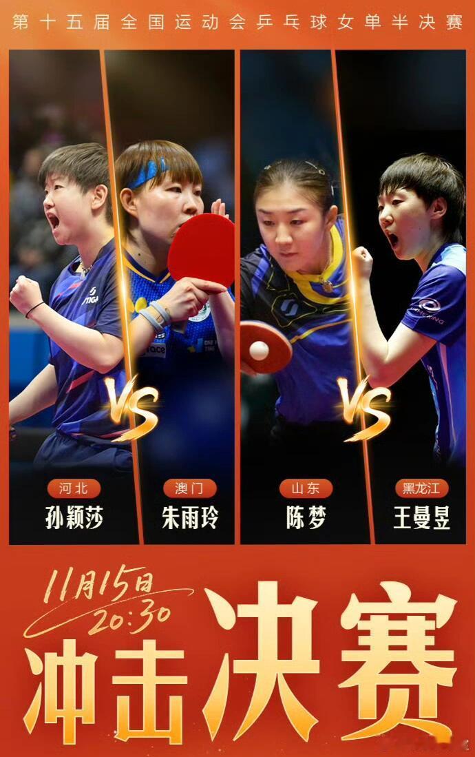 【冲击决赛】11月15日,第十五届全国运动会乒乓球半决赛将进行,为运动员们加油!12:30 男单樊振东 VS王楚钦林詩棟 VS袁励岑20:30 女单孙颖莎 VS朱雨玲陈梦-乒乓球 VS王曼昱