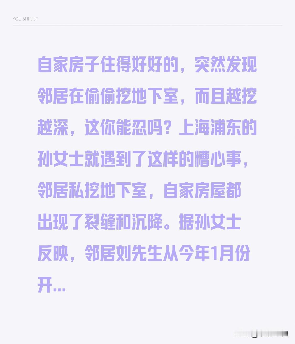 自家房子住得好好的,突然发现邻居在偷偷挖地下室,而且越挖越深,这你能忍吗?上海浦东的孙女士就遇到了这样的糟心事,邻居私挖地下室,自家房屋都出现了裂缝和沉降。 据孙女士反映,邻居刘先生从今年1月份开始,就在自家后院花园里偷偷挖掘地下室。这个地下室可不是小打小闹,面积约300平方米,深度更是达到了6米,简直就像一个巨大的深坑。更让孙女士气愤的是,刘先生还玩起了“躲猫猫”的游戏,城管一来他就停工,城管一走他就继续干。这种行为不仅严重影响了周边房屋的安全,也让孙女士一家提心吊胆。毕竟,谁也不想住在一个随时可能发生危险的地方。孙女士表示,自家房屋已经出现了明显的裂缝和沉降现象,这让她非常担忧房屋的安全问题。目前,相关部门已经介入调查,希望刘先生能够停止这种危险的行为,还大家一个安全的生活环境。 私挖地下室不仅违法,更是对他人生命安全的漠视。希望相关部门能够尽快处理此事,给孙女士等业主一个满意的答复。大家对于此事有什么看法呢?欢迎在评论区留言讨论! 私建地下室 挖建地下室 小区地下室设计 小区的秘密 小区地下空间 小区地下室防水 挖地下室施工