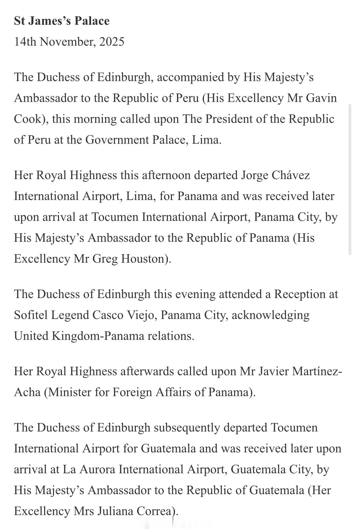 【公务日志】2025年11月14日,爱丁堡公爵夫人苏菲见完秘鲁总统之后,一天之内坐2️⃣次国际飞行,先是巴拿马🇵🇦后是危地马拉🇬🇹。