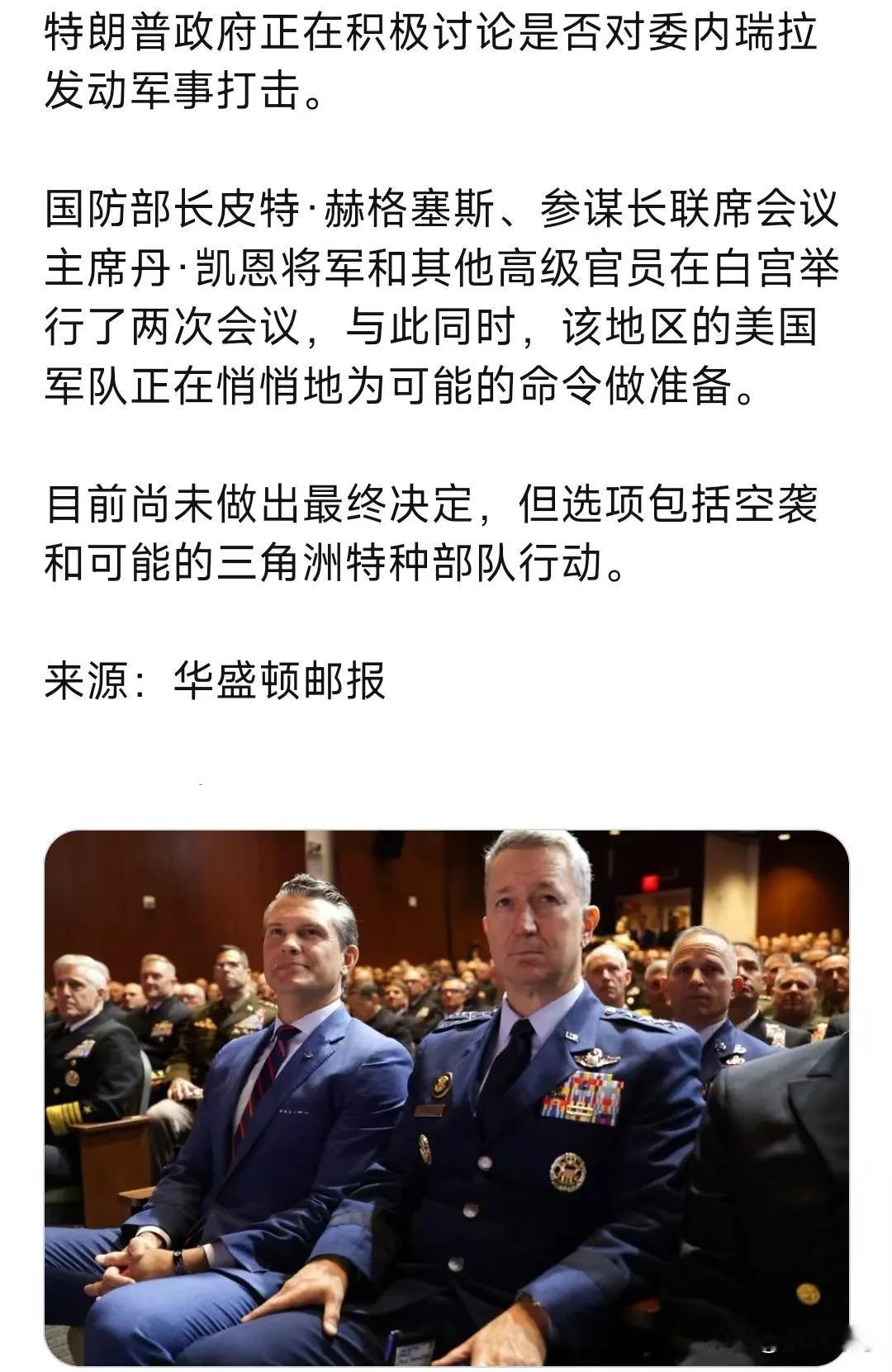 特朗普政府正在积极讨论是否对委内瑞拉发动军事打击。国防部长皮特·赫格塞斯、参谋长联席会议主席丹·凯恩将军和其他高级官员在白宫举行了两次会议,与此同时,该地区的美国军队正在悄悄地为可能的命令做准备。 目前尚未做出最终决定,但选项包括空袭和可能的三角洲特种部队行动。委内瑞拉战局